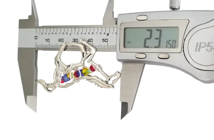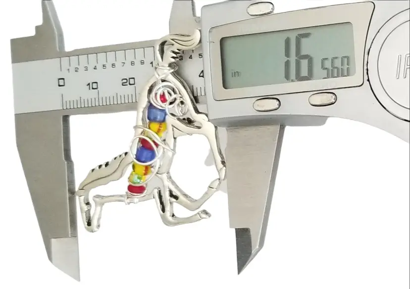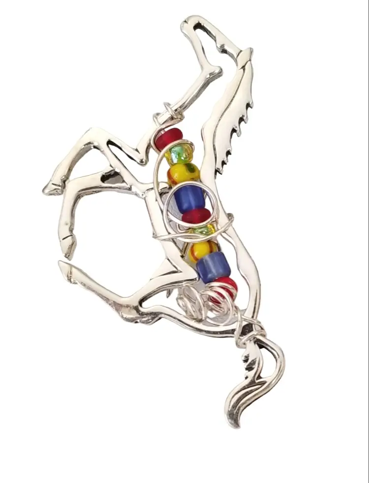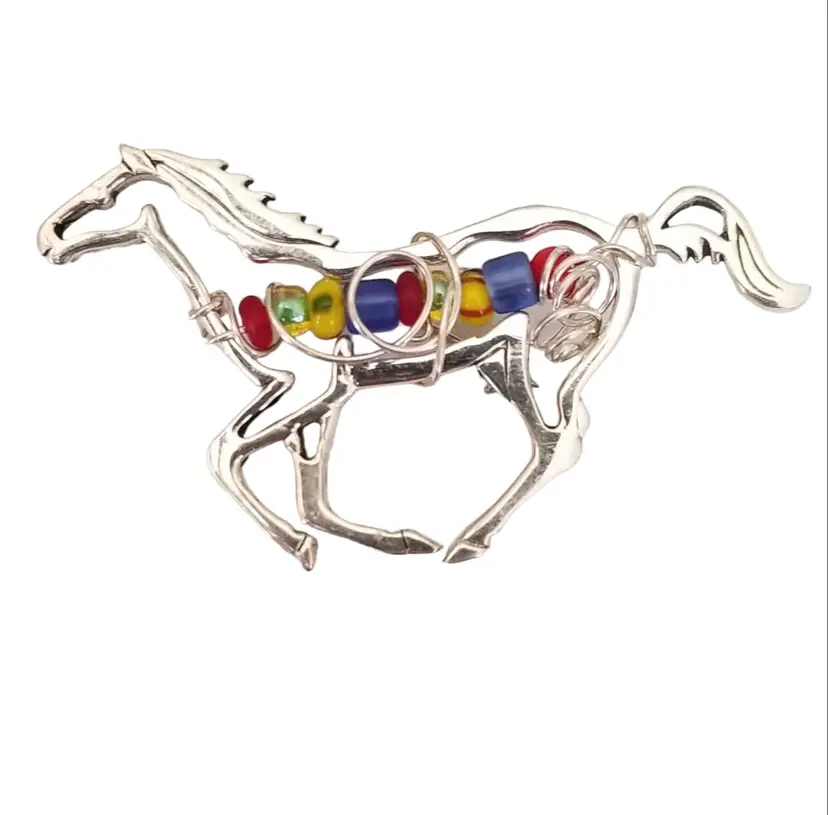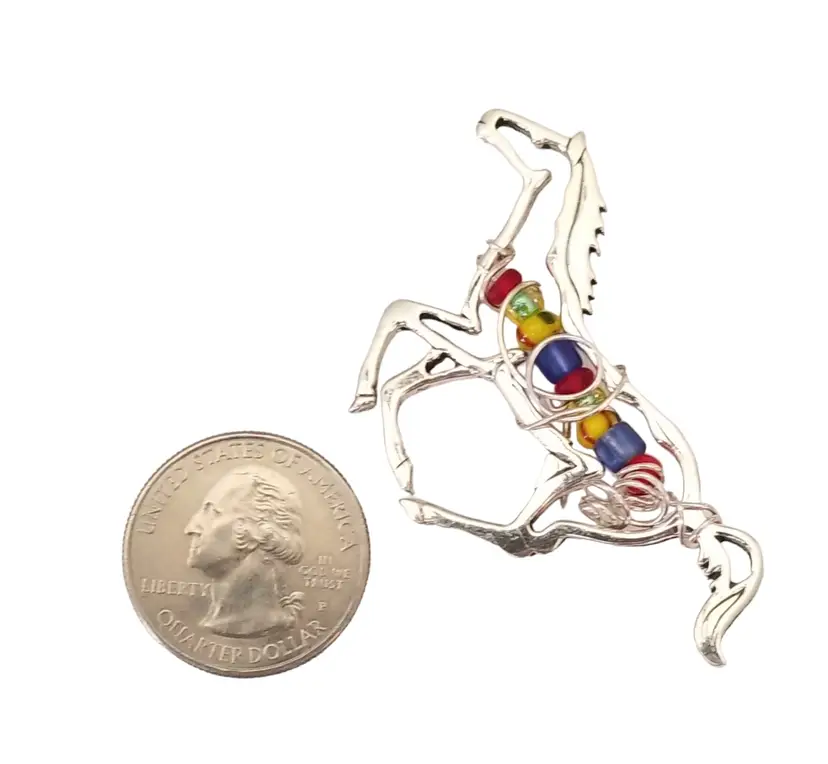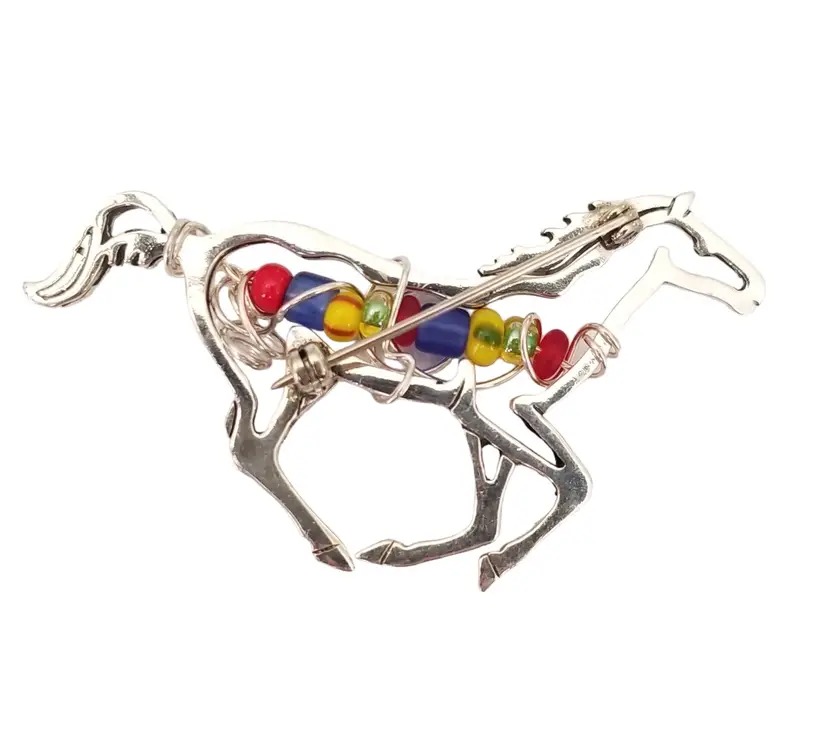 The brooch features an intricately designed open horse made of durable sterling silver adorned with glass beads of different colors carefully wired onto the horse's body. It measures 1.6 inches in length and 2.3 inches wide. It features a secure clasp closure ensuring that it stays securely attached to your clothing or accessory throughout the day.