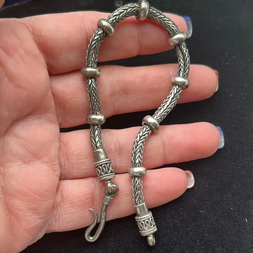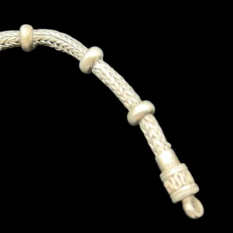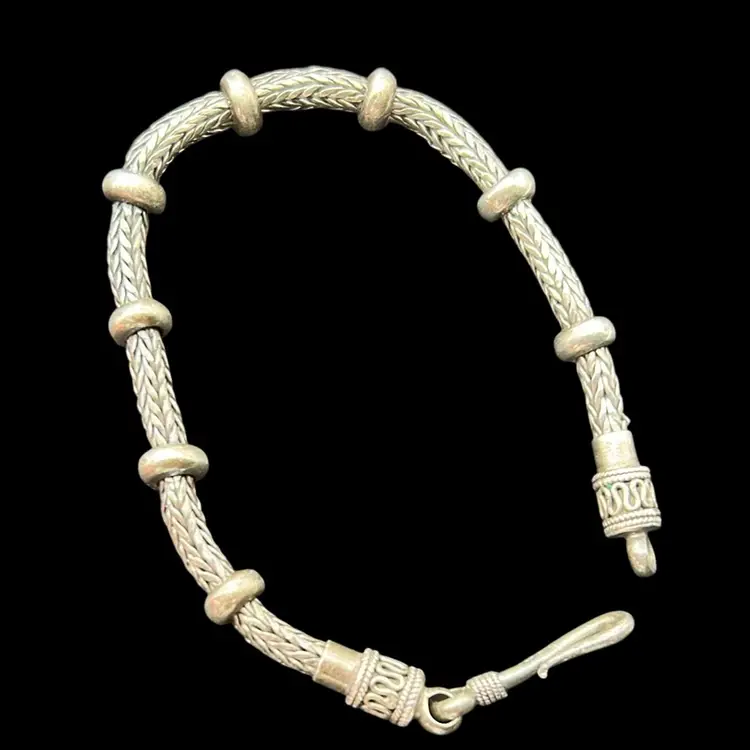 Substantial and beautifully detailed sterling silver bracelet featuring a tightly woven chain design, accented with raised silver rings and ornate end caps. Secured with a sturdy hook clasp, this artisan-style piece is marked 925 BA, indicating handcrafted sterling silver—likely of Balinese or Thai origin. Weighing an impressive 26 grams and measuring 7 inches long, it’s a bold and timeless piece perfect for stacking or solo wear.