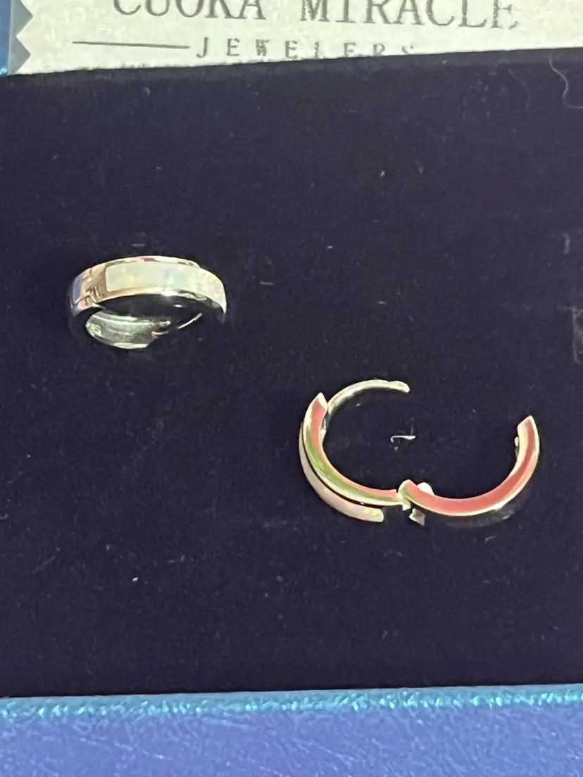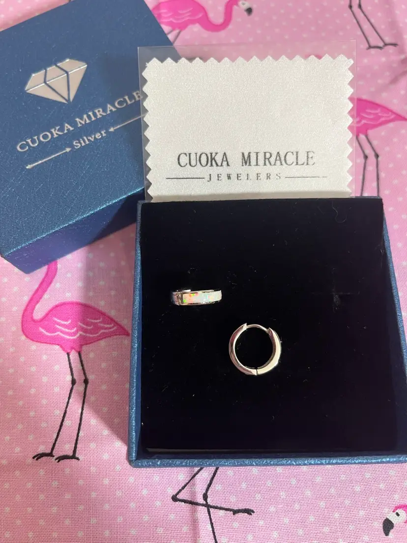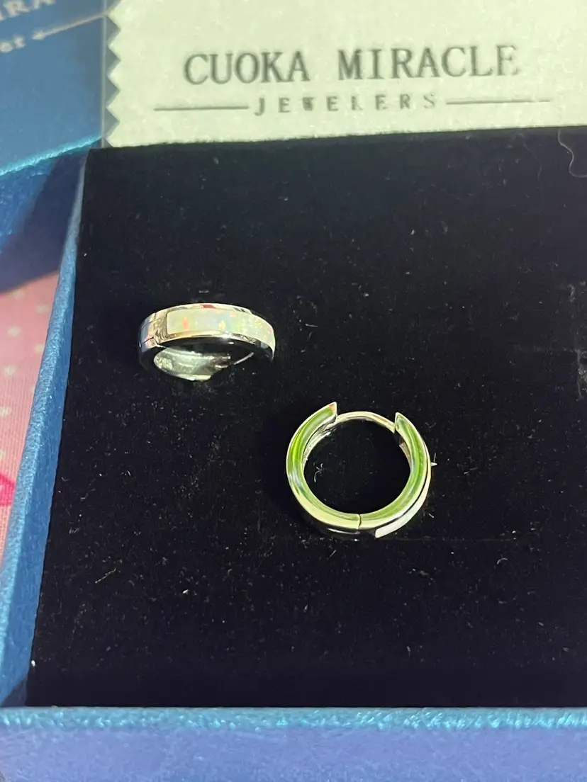 NEW IN BOX Brand: Cuoka Miracle .925 Sterling Silver pierced huggie style hoop earrings with a synthetic opal inlay. Comes in box with black velvet cushion and branded jewelry wipe.