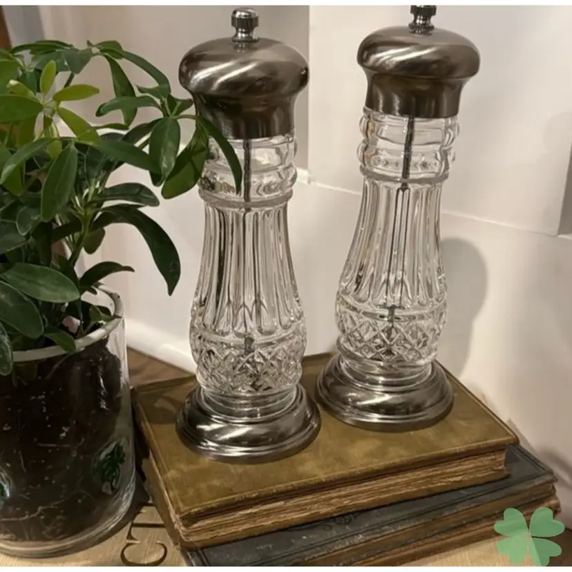 This set features beautifully cut crystal bodies with elegant sterling silver tops, perfect for salt, pepper, or other spices. Adds a touch of antique charm to any kitchen or dining spread.