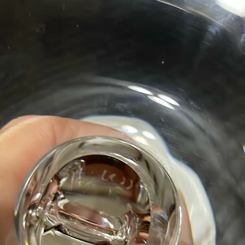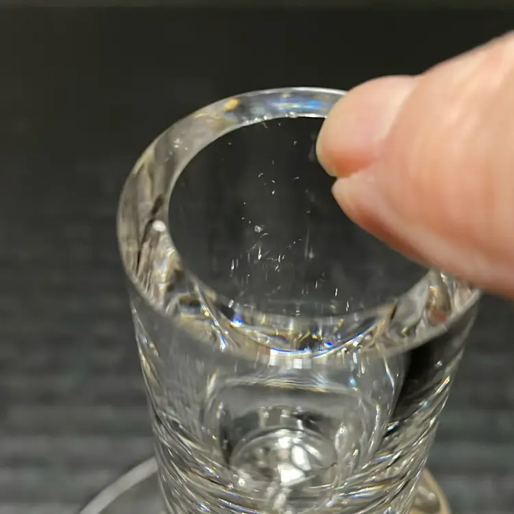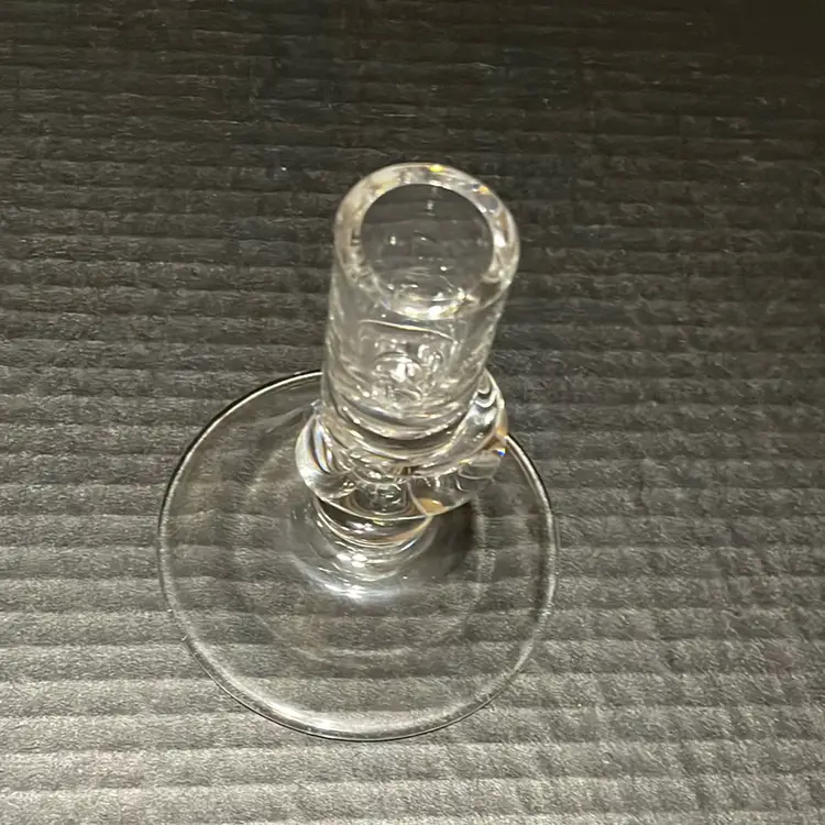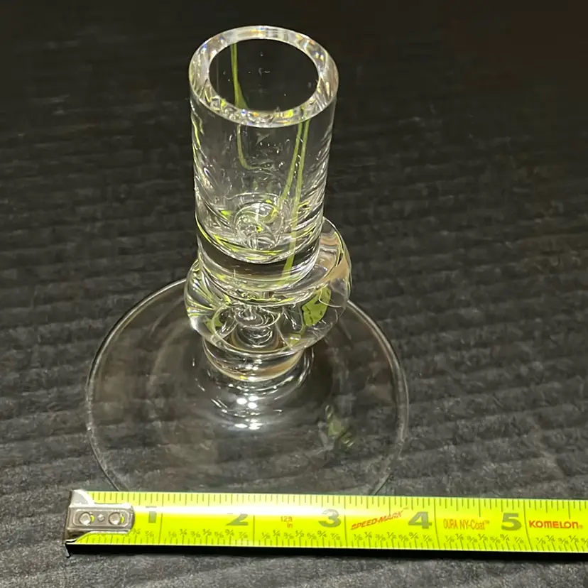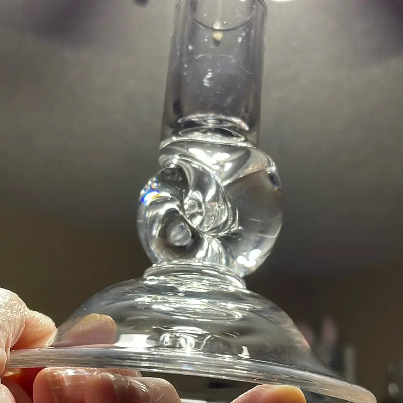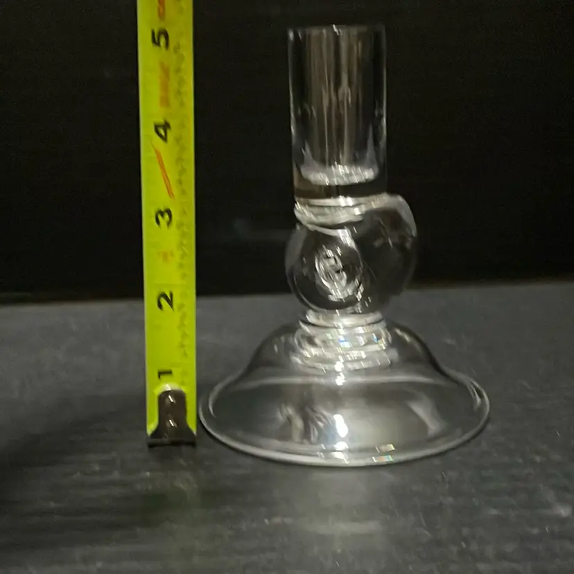 Beautiful glass candlestick holder. One tiny flea bite no other chips and no cracks.