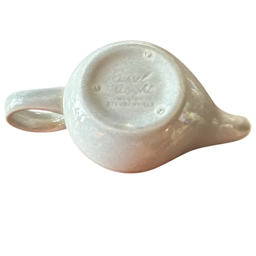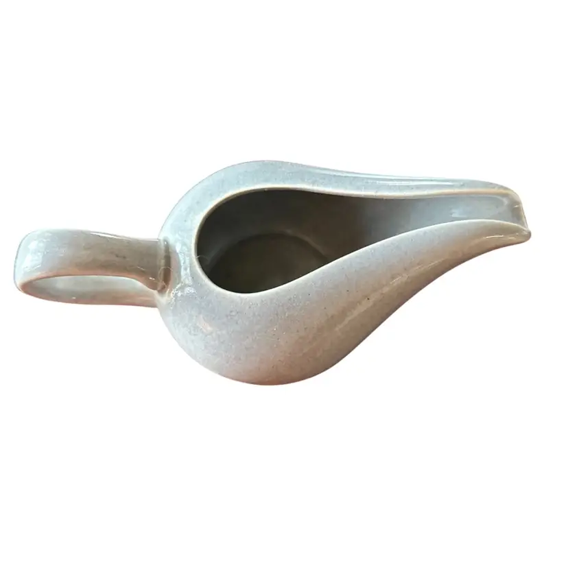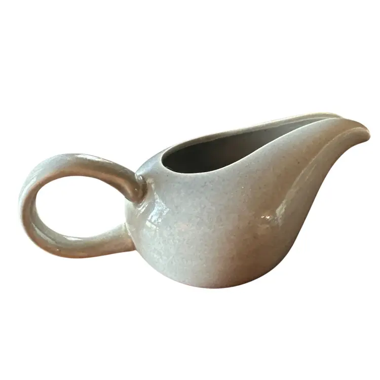 The Steubenville Russel Wright American Modern Granite Gray Creamer is a vintage, mid century modern earthenware piece manufactured in the United States in the 1950s. This original solid gray creamer with a glossy finish has a capacity of 8 oz and features a classic American theme. With its sleek design and quality craftsmanship, it is a perfect addition to any collection of decorative cookware and serveware. No chips, cracks or crazing. Excellent condition.