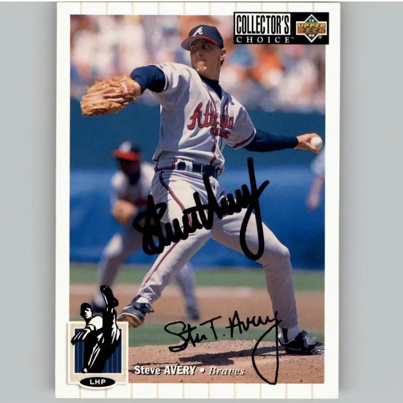 Authentic 1994 Upper Deck Collector's Choice Silver Signature baseball card featuring Steve Avery of the Atlanta Braves, personally signed. A prized collectible for Braves fans and autograph enthusiasts. Your purchase supports Signatures For Soldiers, aiding programs for homeless and disabled veterans.