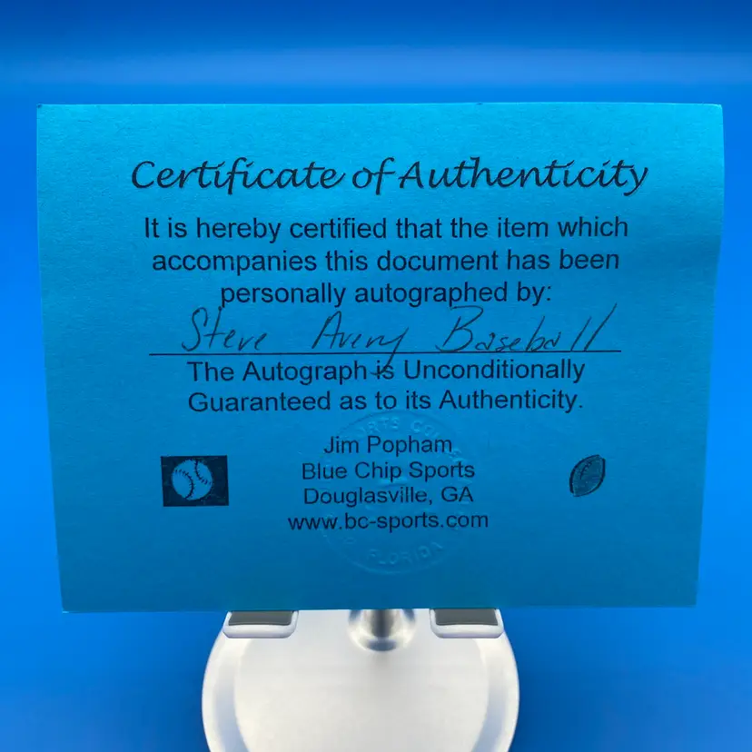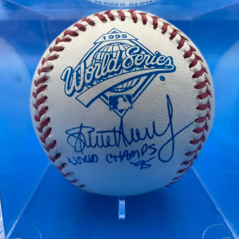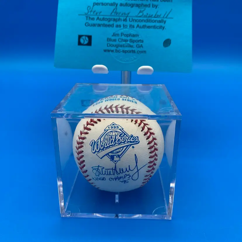 You are purchasing one Steve Avery 'World Champs '95' Signed Rawlings Official 1995 World Series Baseball. This Listing includes one hard plastic display case and one certificate of authenticity by Blue Chip Sports. This Ball is in overall good condition. See images for a closer look at each angle and any area of discoloration. No chips or cracks in the case. No rips on the certificate.