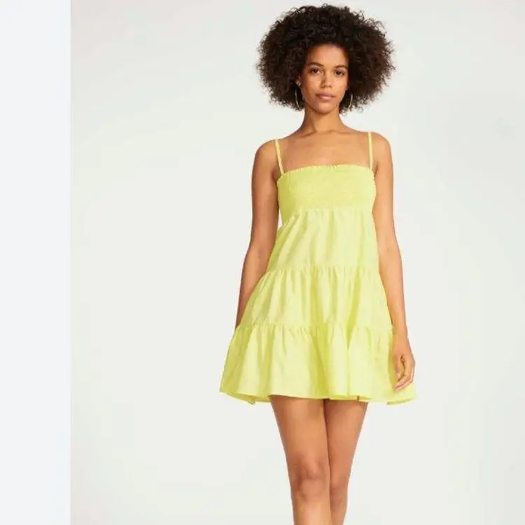 BB Dakota by Steve Madden The Dream About Me Mini Dress in Sunny Lime features spaghetti straps with tiered loose silhouette. This pull-on dress is unlined. Color is listed as Sunny Lime- a combo of green/yellow. Shade is more eclectic green than yellow.