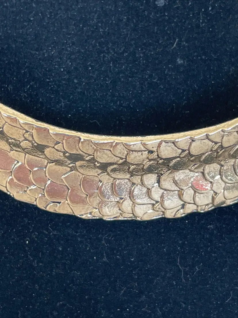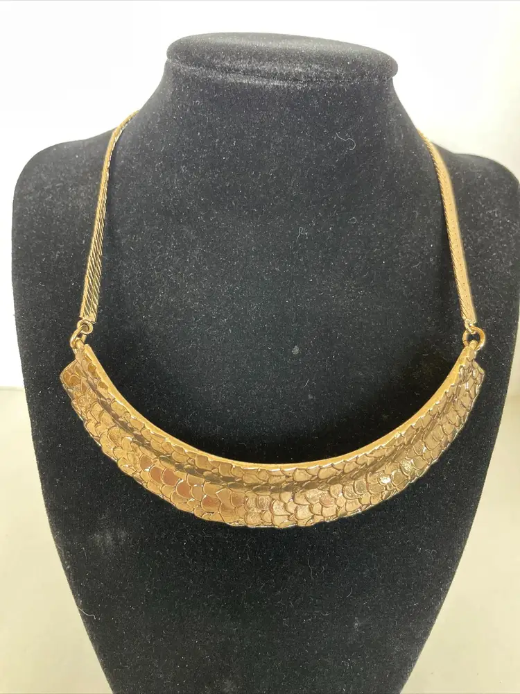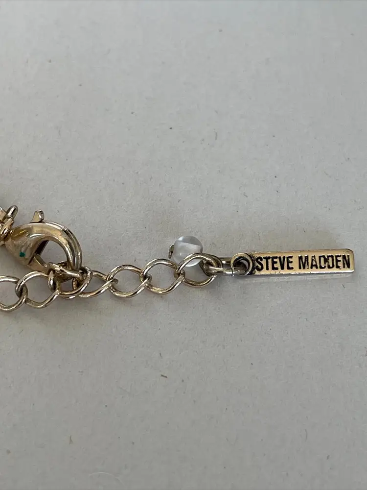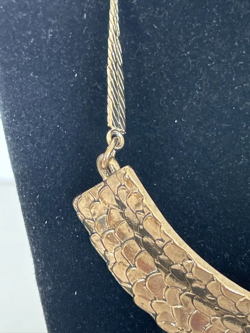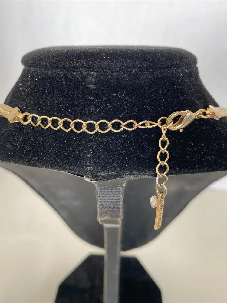 Add a touch of designer style to your look with this Steve Madden Gold Tone Fashion Statement Bib-Style Necklace. The necklace features a crescent, wide "U" pendant and has an adjustable length of 13-16 inches. The lobster claw closure ensures a secure fit. This vintage necklace is signed by Steve Madden. It is a herringbone chain with 1" wide collar. It would be the perfect addition to any outfit, for any occasion. Get this stylish piece of fashion jewelry today! No box.