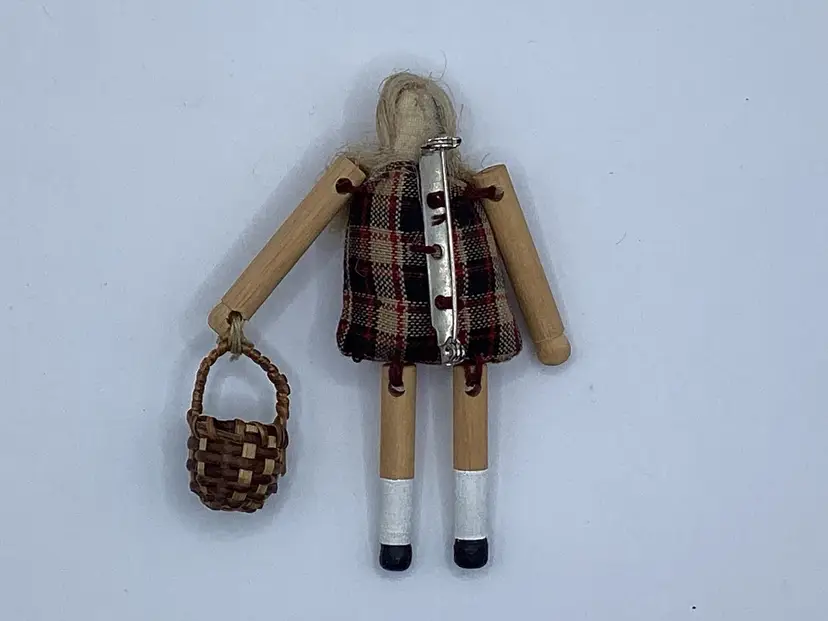 Features: Wooden arms and legs / Cloth body / Doll is handing a miniature woven basket Material: Wood /Cloth Pattern/Design: Made to appear as primitive Color: Navy / Red / Tan plaid Measurements: Height - 3 & 1/2” Width - 2 & 1/4”