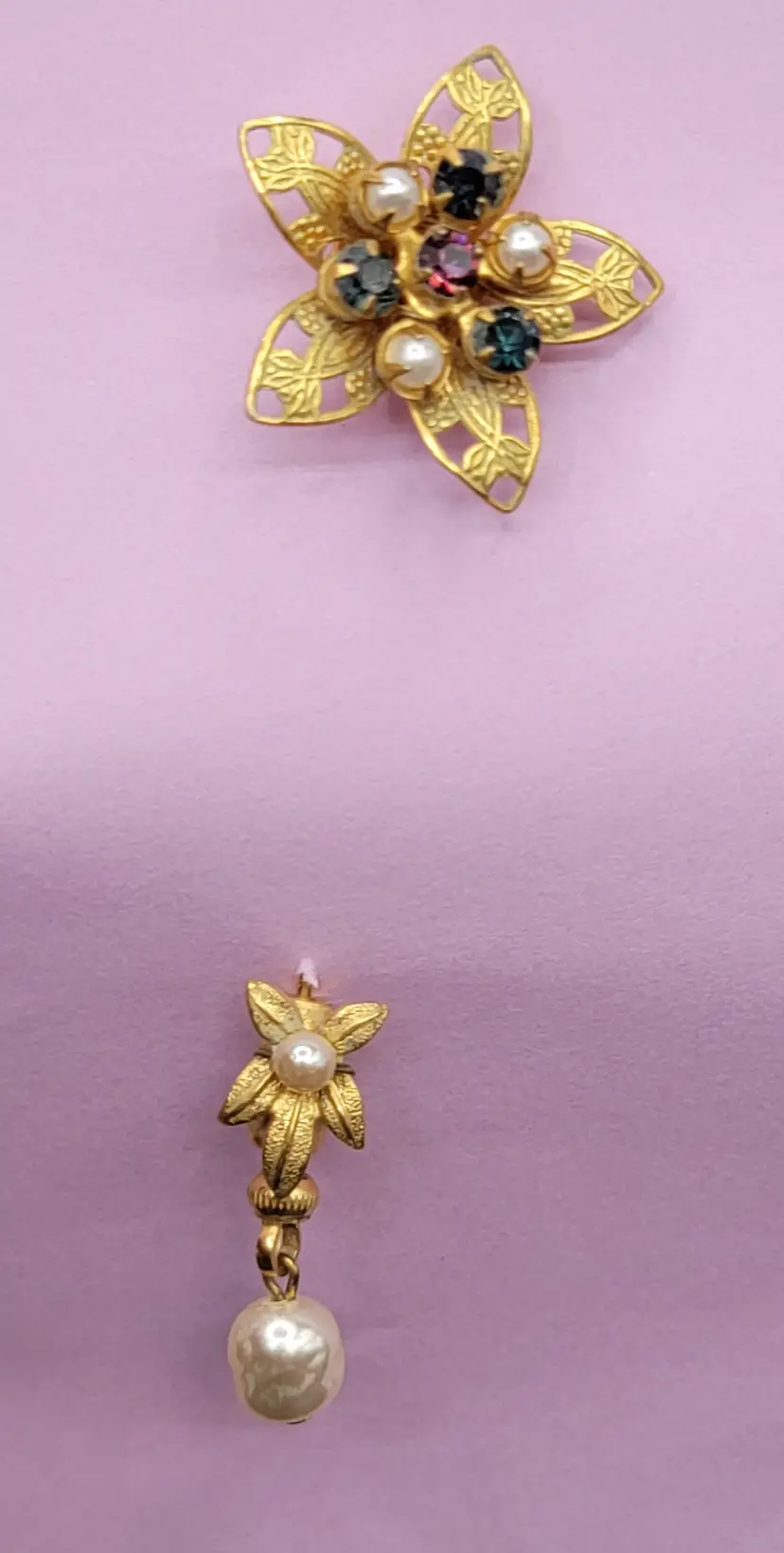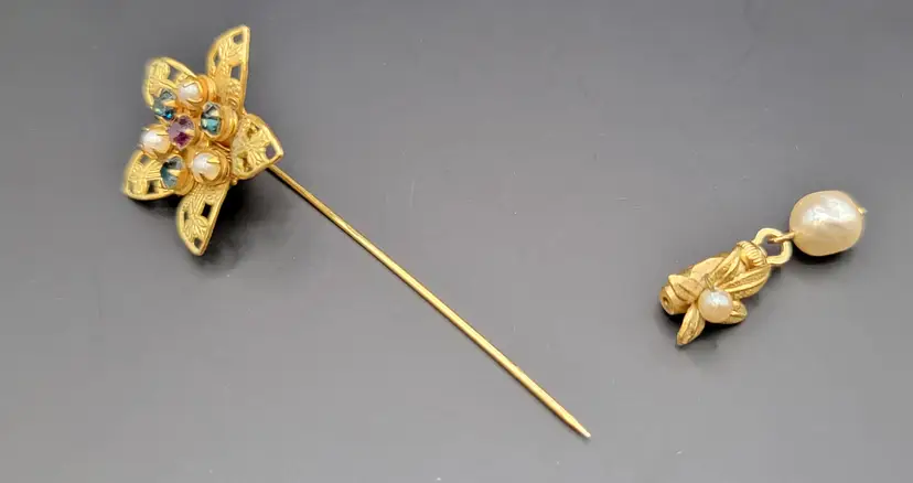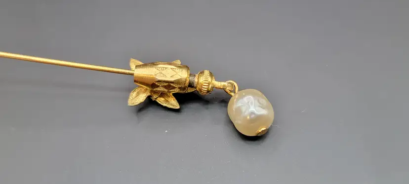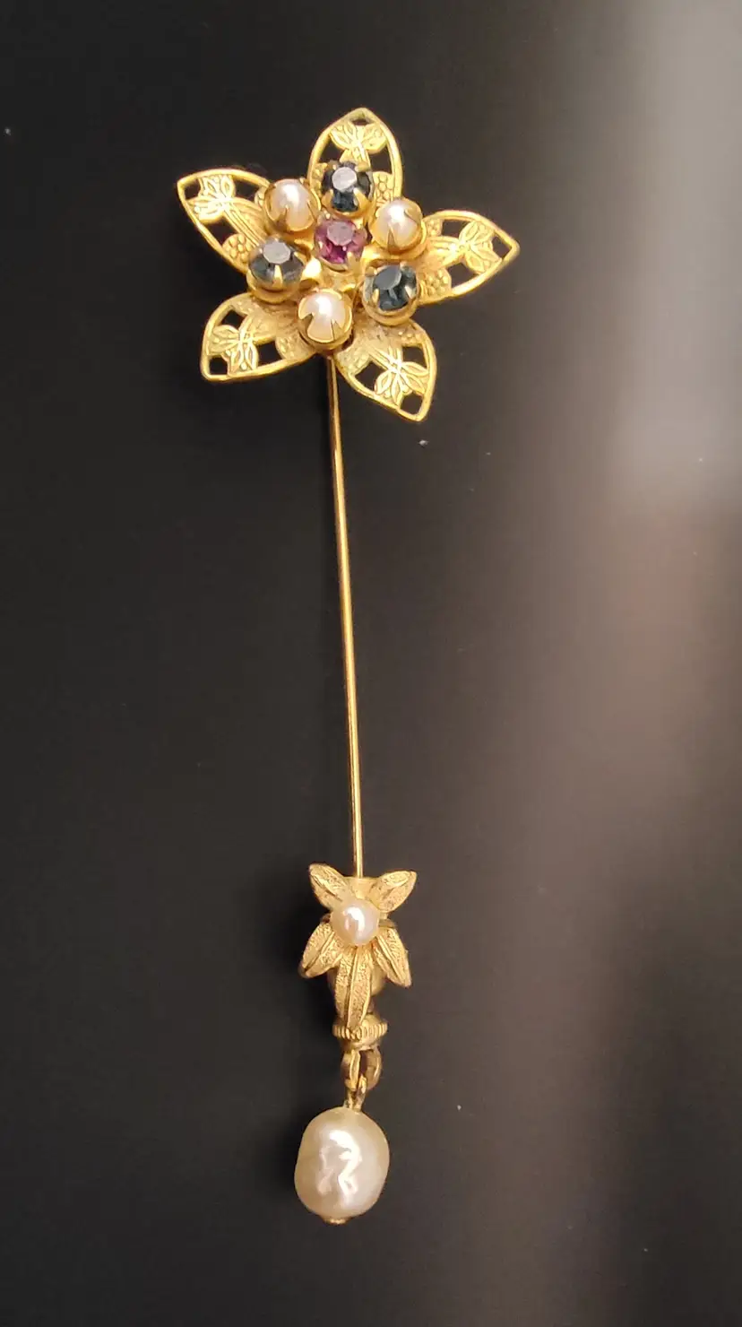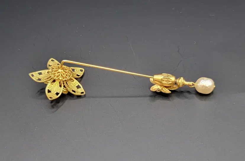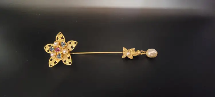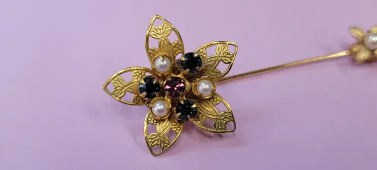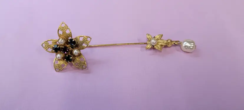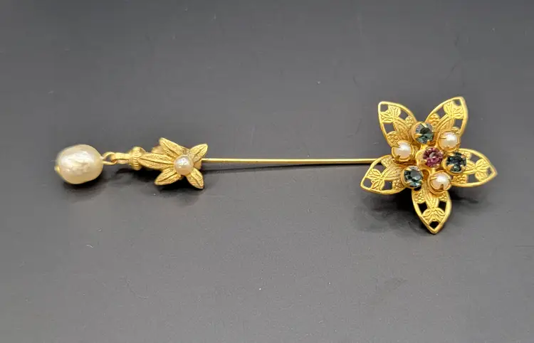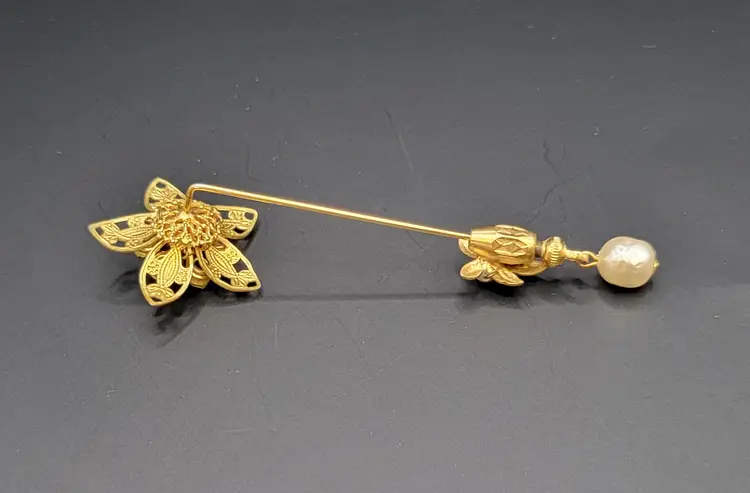Vintage stick pin lapel brooch. Nice gold tone metal flower shape with rhinestones and pearls. 3 3/4 inches long, 1 inch diameter. In great used vintage condition. Unknown maker. End of pin closer is a fun dangling pearl and is a barrel type pull. Such a cool piece, dainty and stylish. Please see all photos.