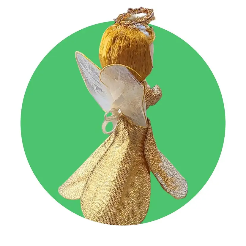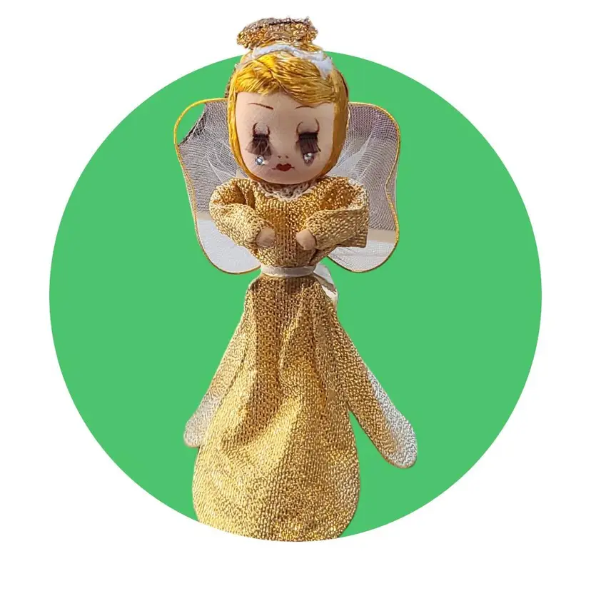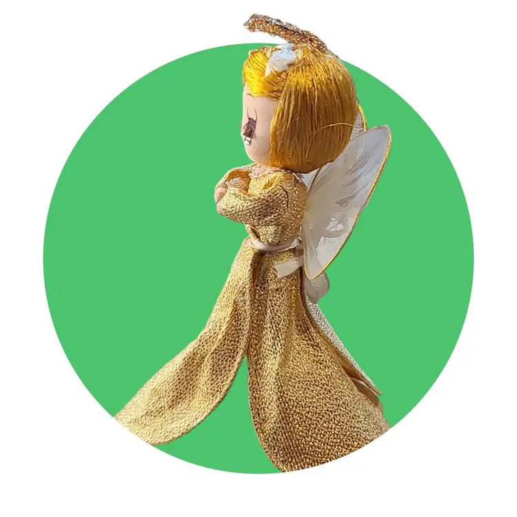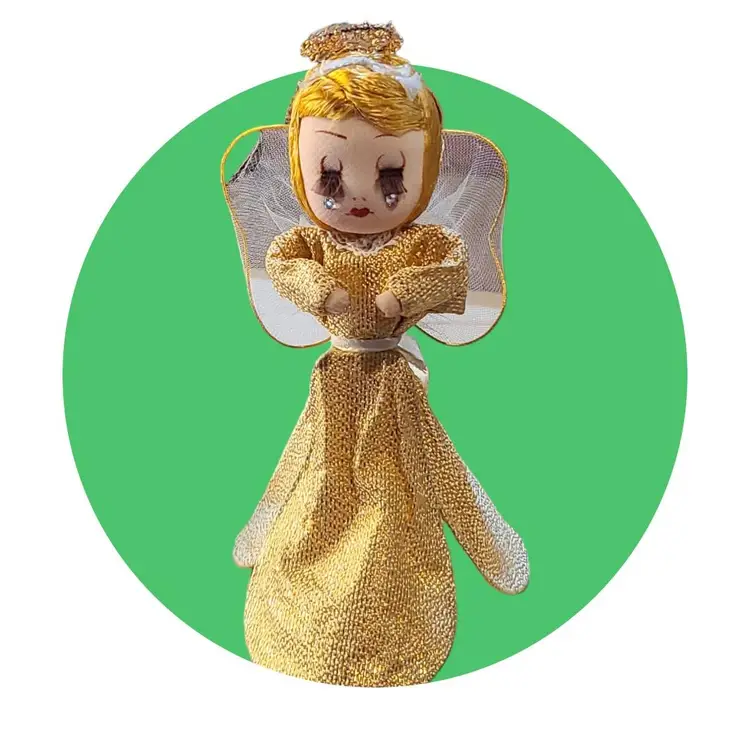 Approx 7 in, made in Japan, Lamé fabric for dress, minor damage to wing, rhinestone teardrops.