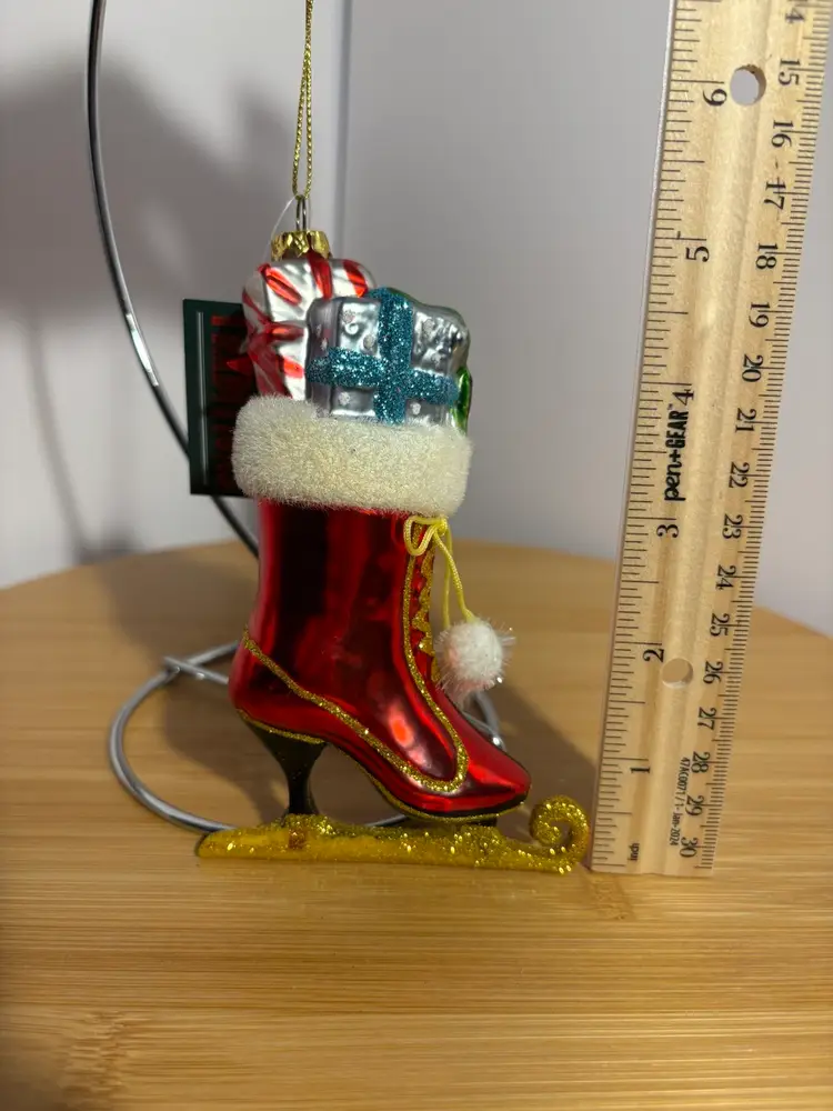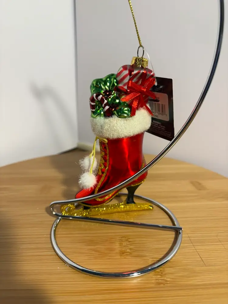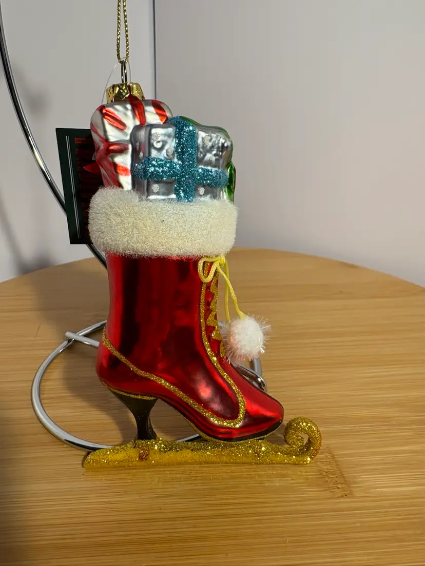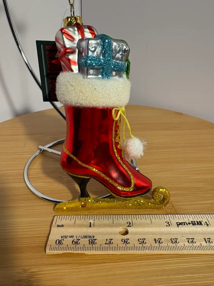 Stocking W/Gifts Presents Faux Fur Trim Pom Poms Blown Glass Christmas Ornament