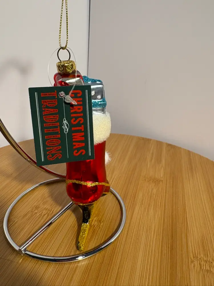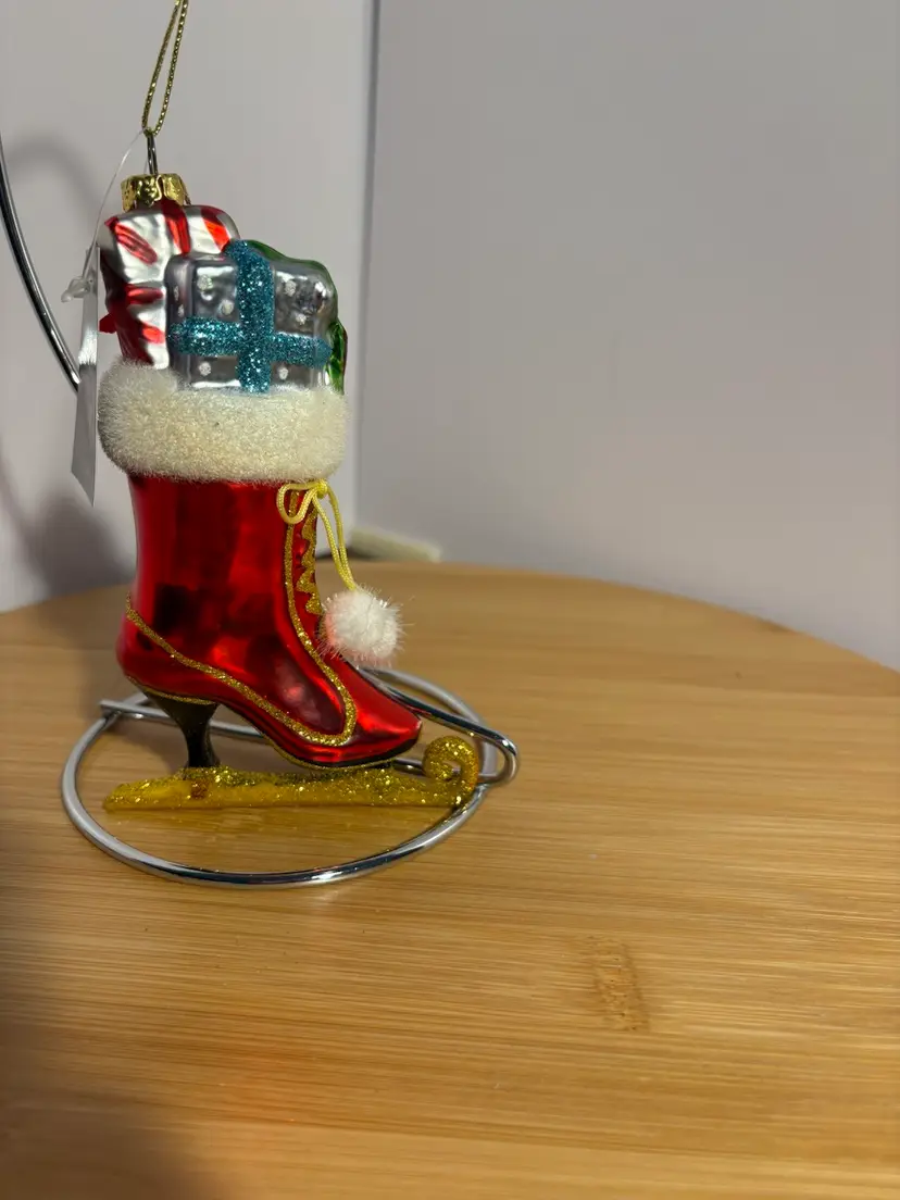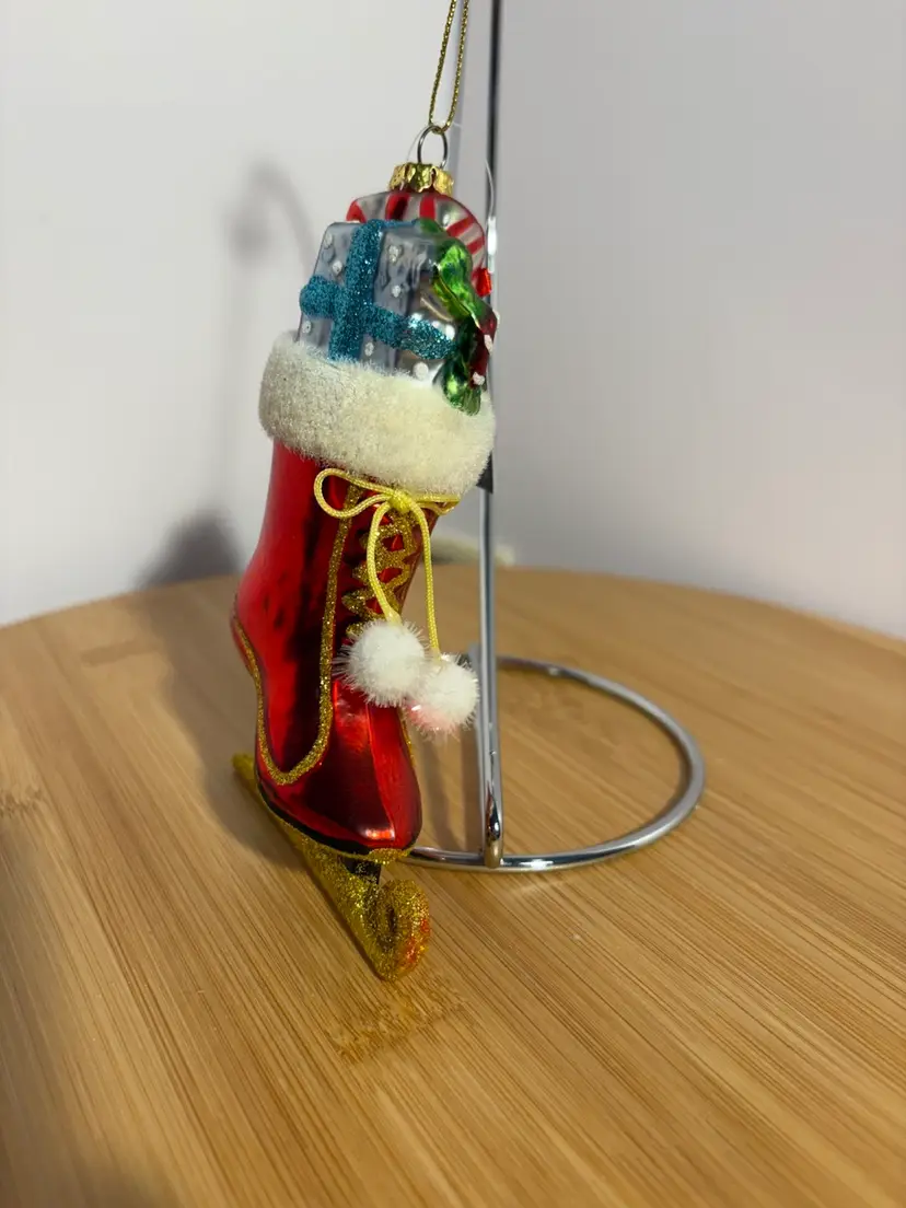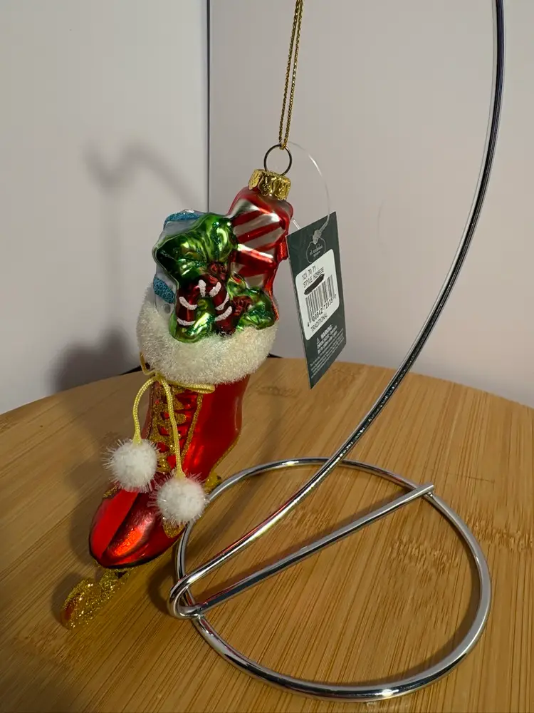 Stocking W/Gifts Presents Faux Fur Trim Pom Poms Blown Glass Christmas Ornament