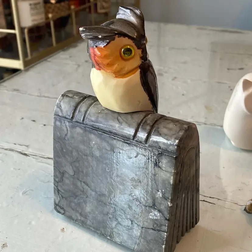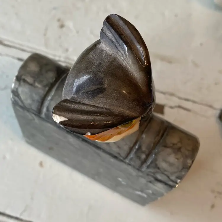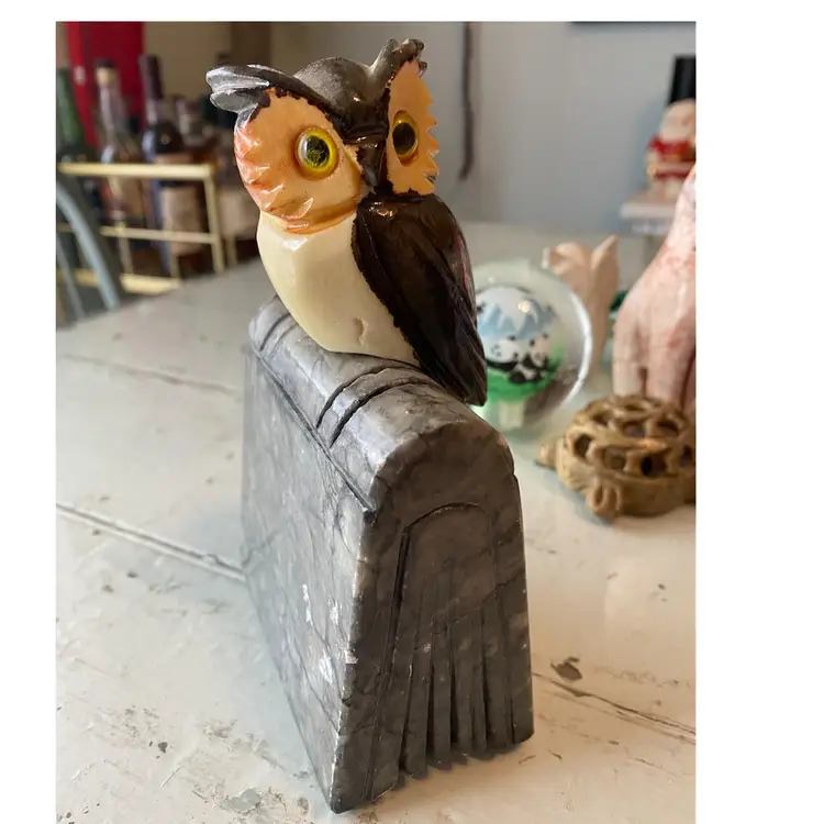 Use as bookends or display alone. The material could be onyx, alabaster, marble, or a combination of different stones. The bookends are 6" high, 4" wide, and 2.5" deep. chip on wing