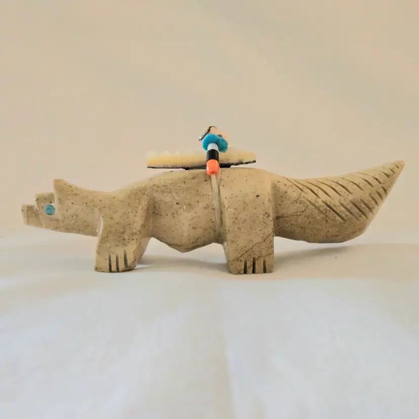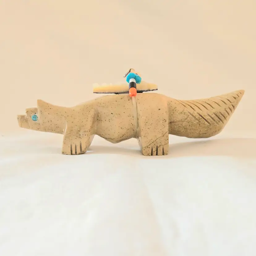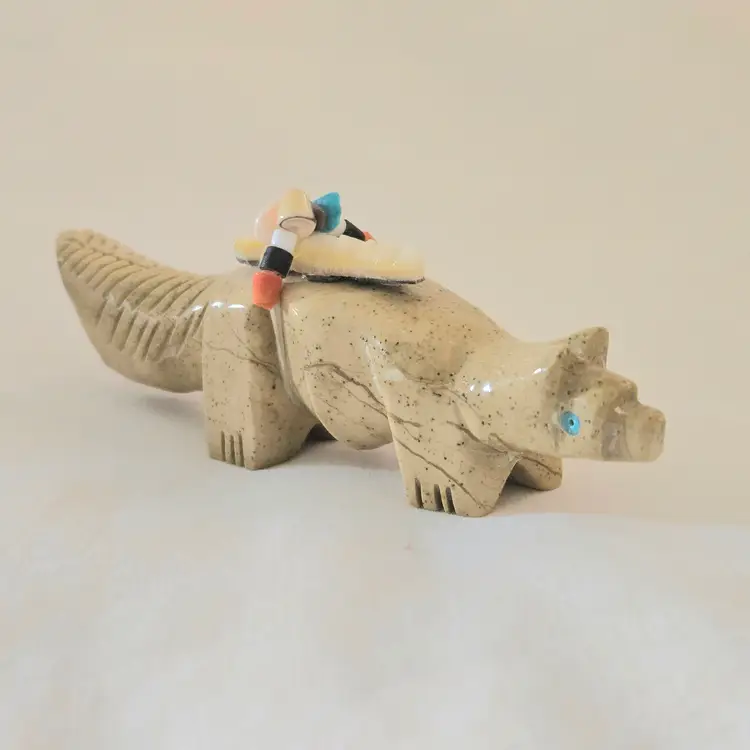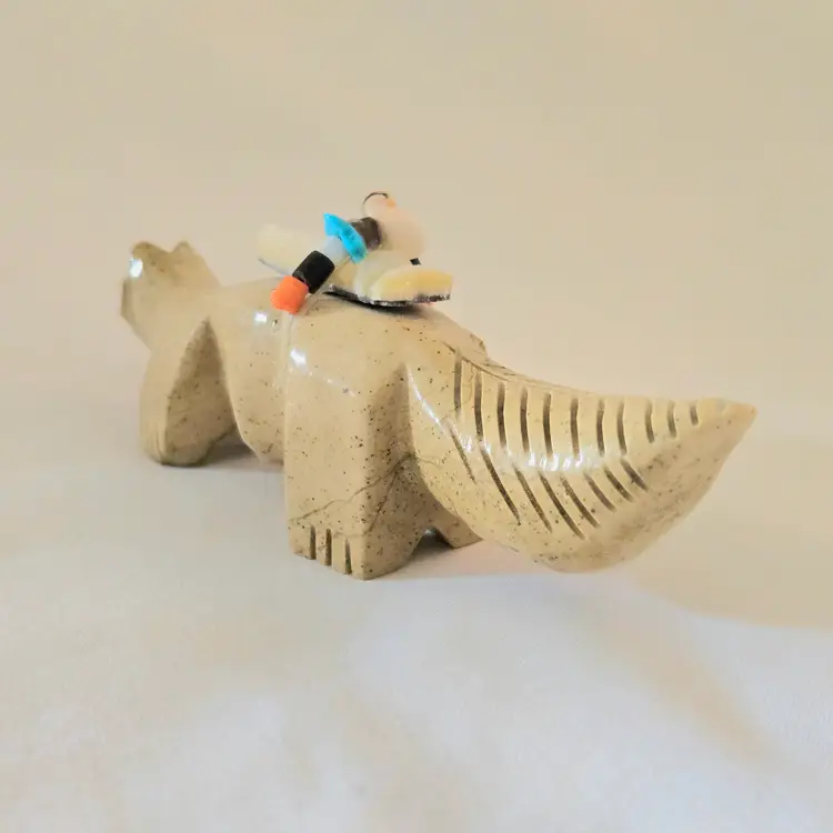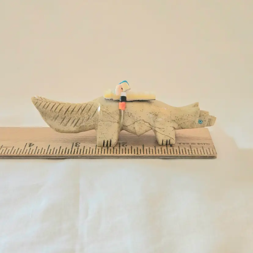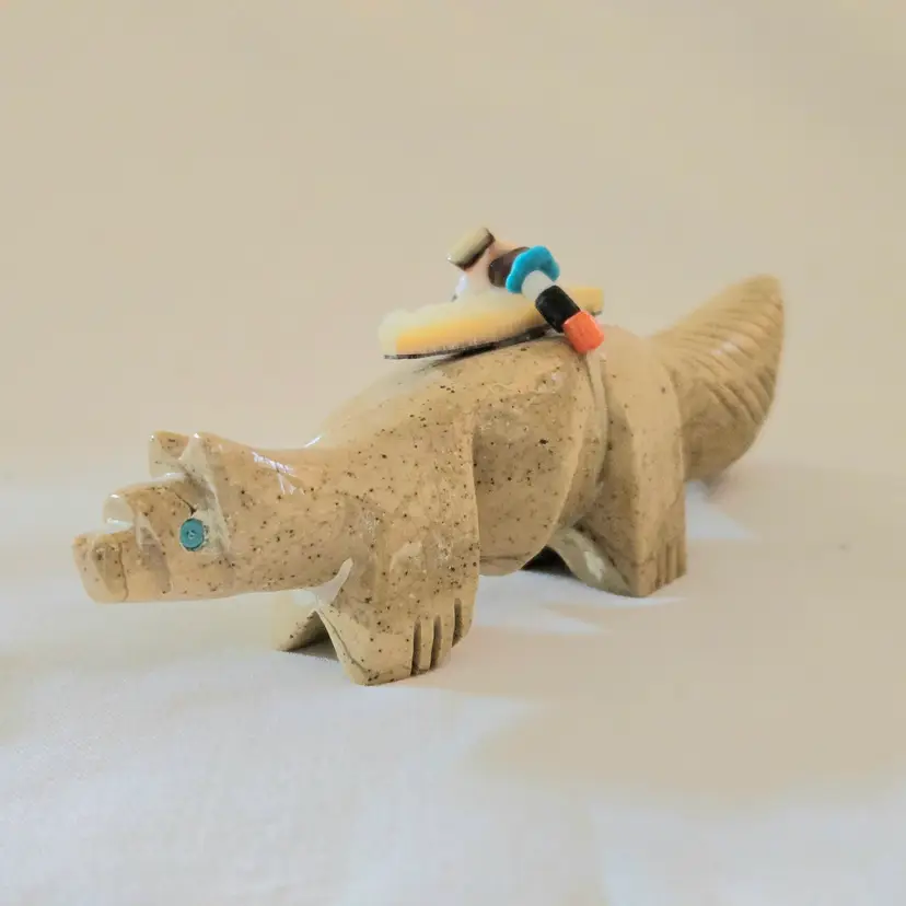 Stone Fox Fetish Indigenous Carving w/ Tied Bundle Unbranded 4" Long approximately Vintage. Used condition with a bit of glue around turquoise eyes and dirt on the bottom of the feet. Please view all the photos and please ask any questions prior to purchase when possible.