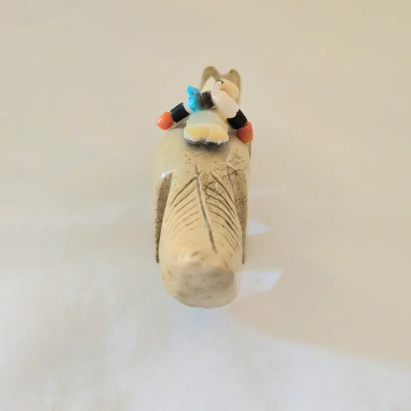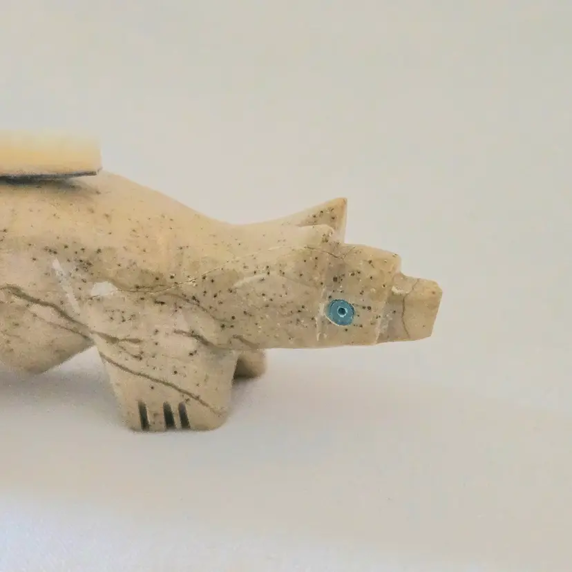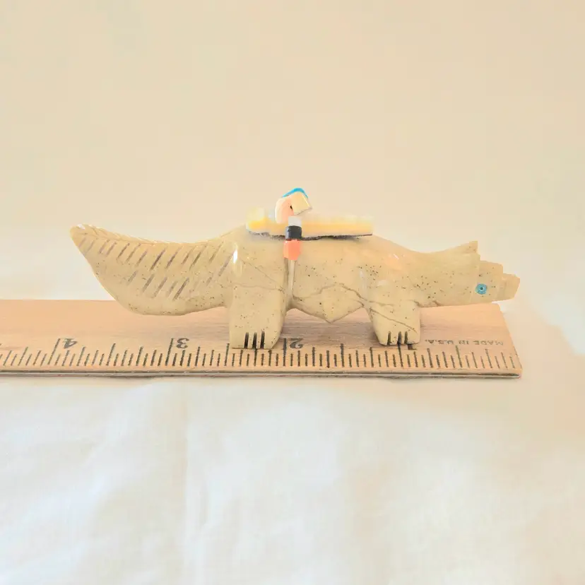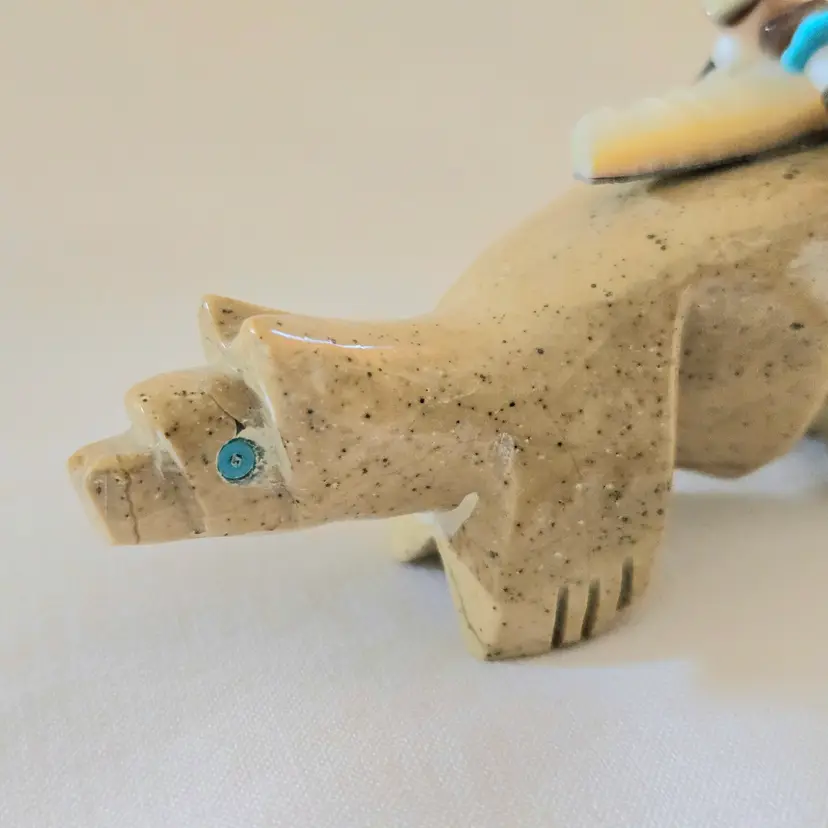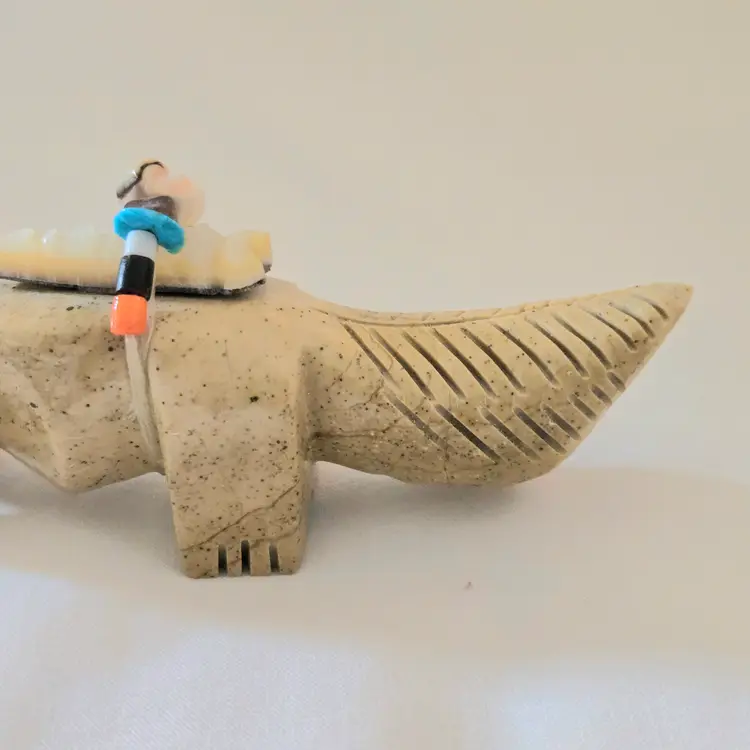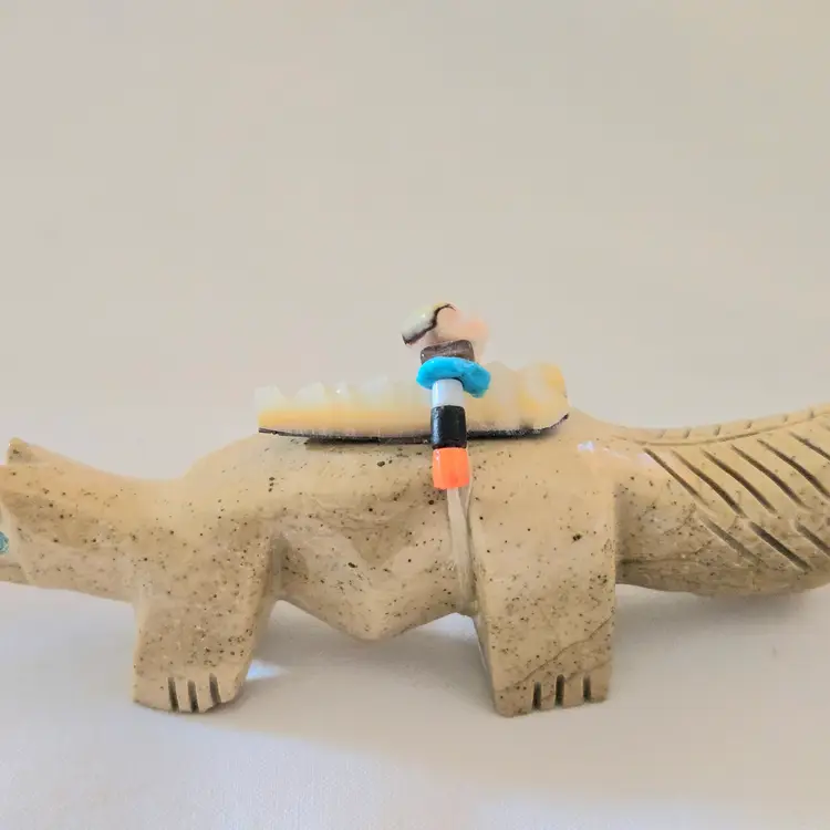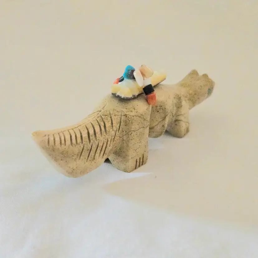 Stone Fox Fetish Indigenous Carving w/ Tied Bundle Unbranded 4" Long approximately Vintage. Used condition with a bit of glue around turquoise eyes and dirt on the bottom of the feet. Please view all the photos and please ask any questions prior to purchase when possible.