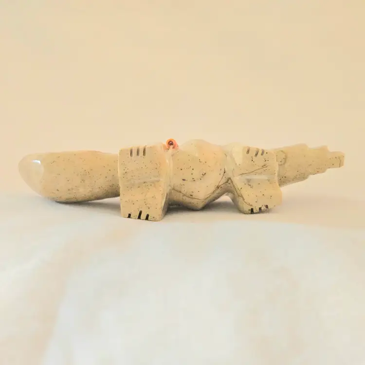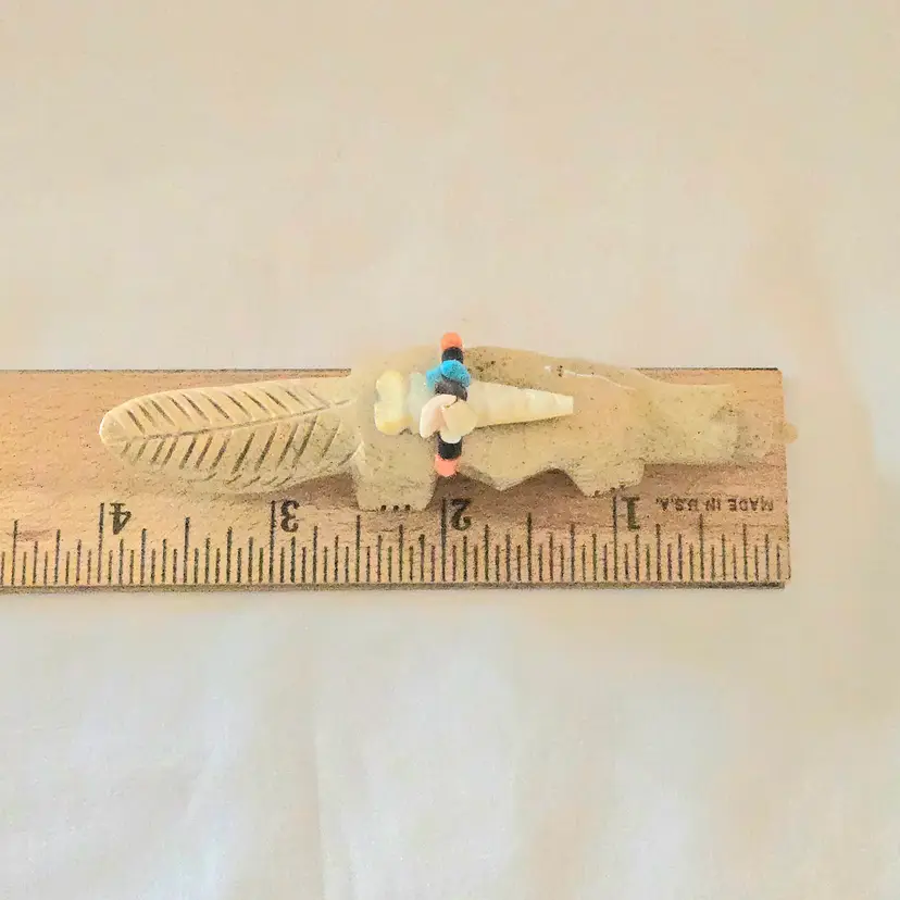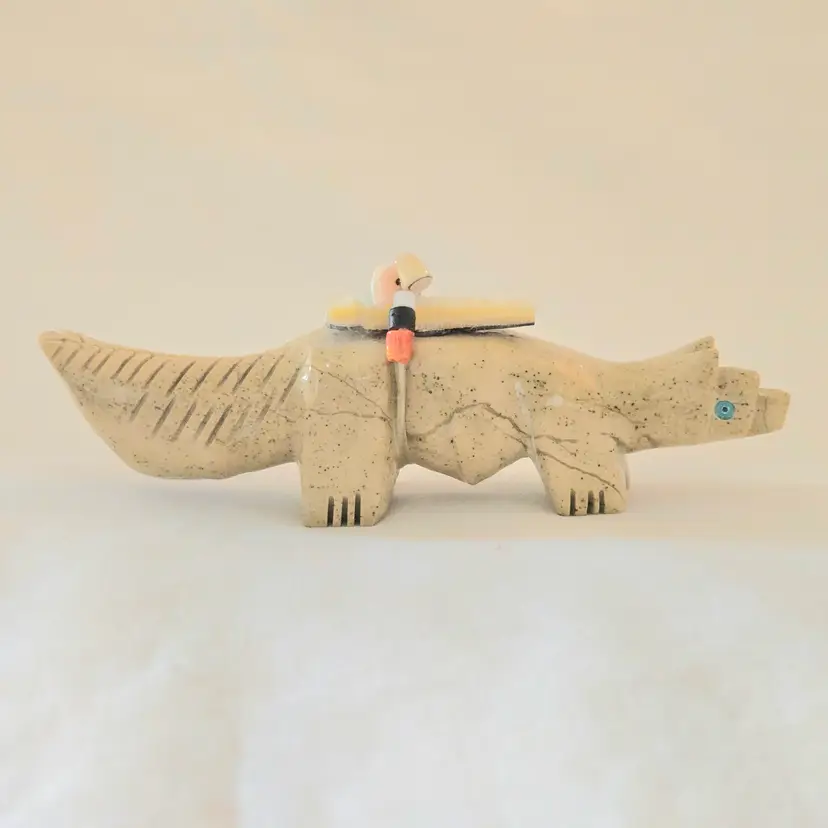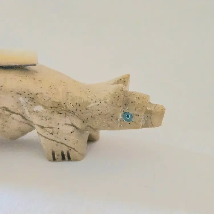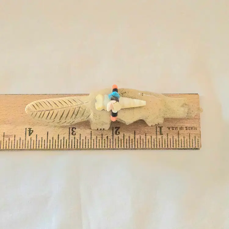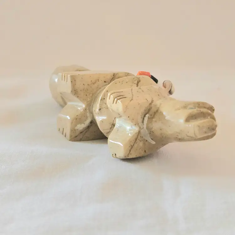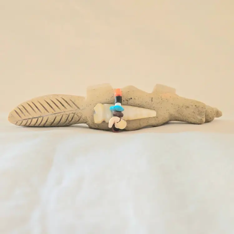 Stone Fox Fetish Indigenous Carving w/ Tied Bundle Unbranded 4" Long approximately Vintage. Used condition with a bit of glue around turquoise eyes and dirt on the bottom of the feet. Please view all the photos and please ask any questions prior to purchase when possible.