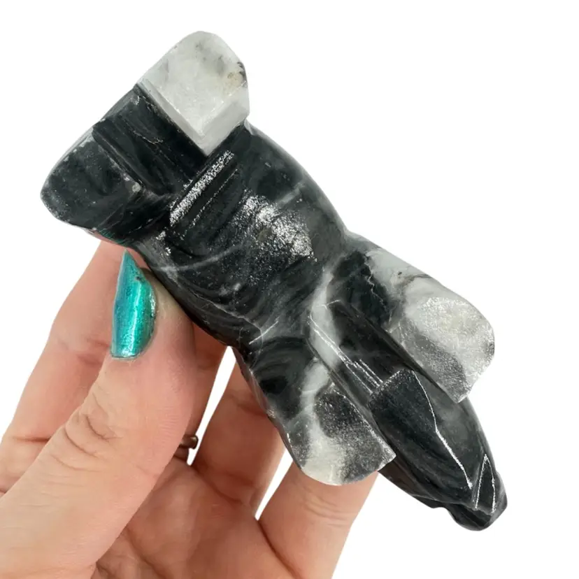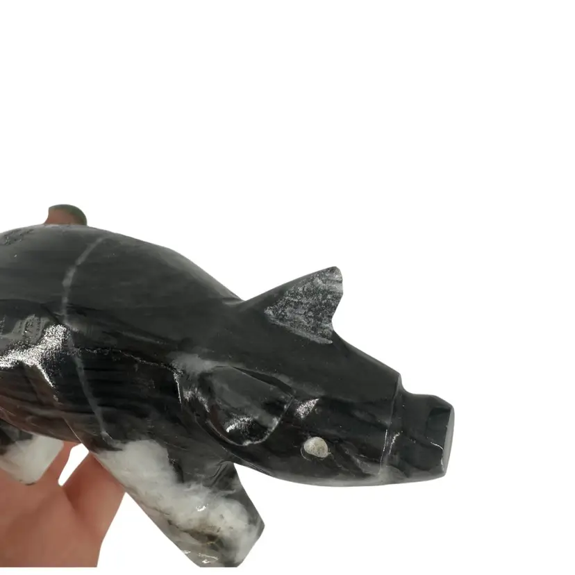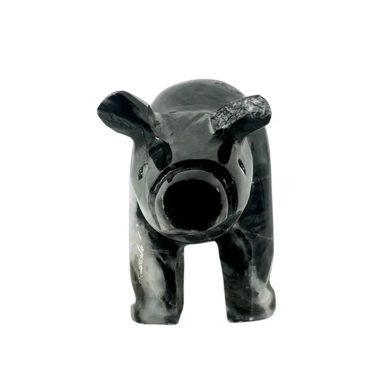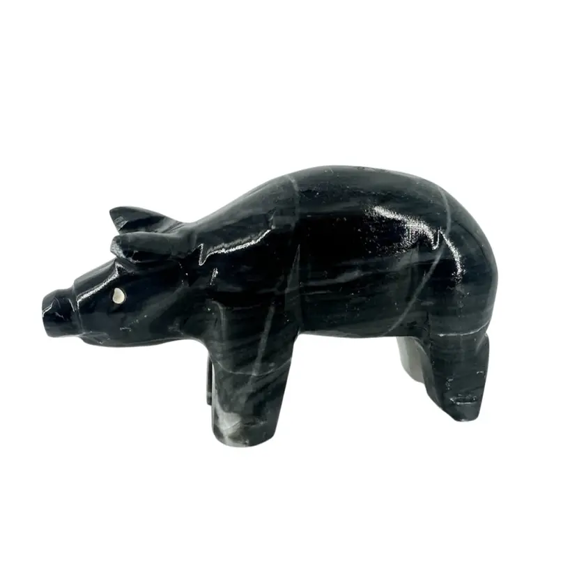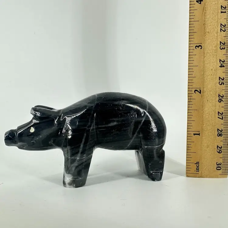 Piggy figurine made of stone. Has a chip on the ear, as shown in photos. Measures approximately 3 3/4” long. No signatures or markings.