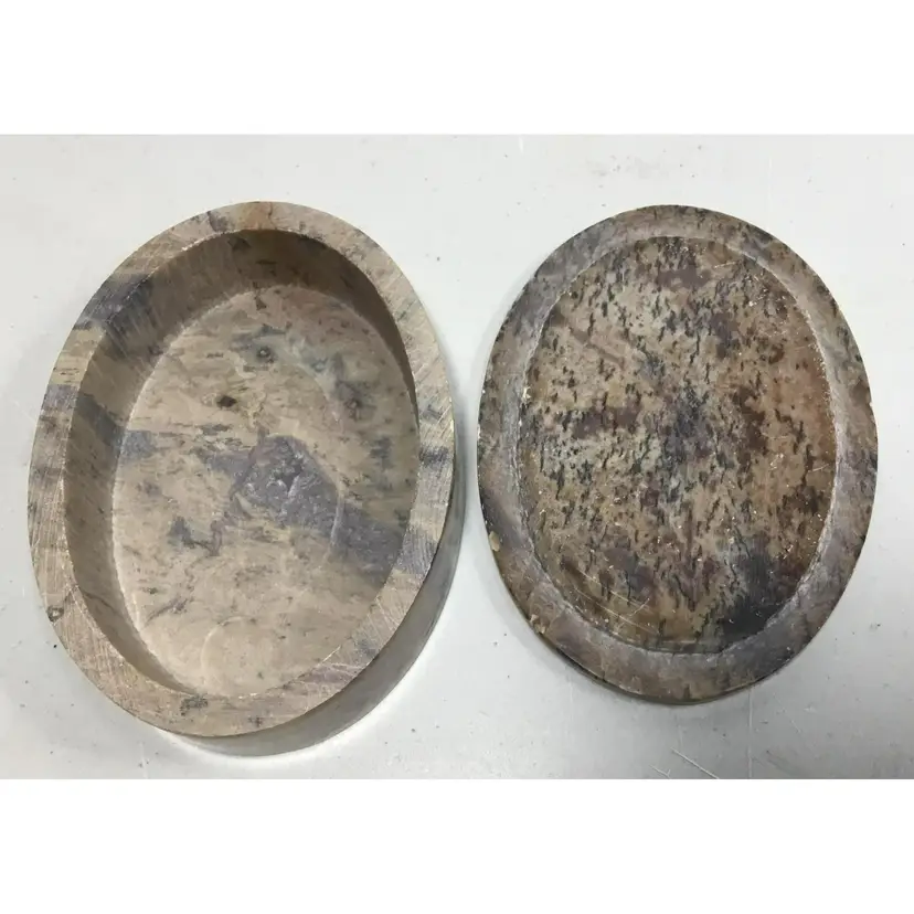 Picture jasper carved stone trinket box, inlaid shell pieces to make flowers on the lid. 4 inches long by 3 inches wide by 3/4 inch deep. Very good condition, some scratches on the bottom, see all photos