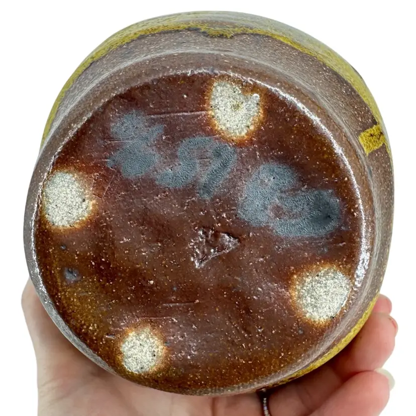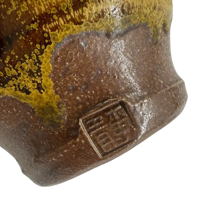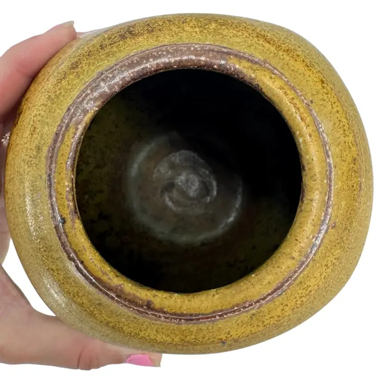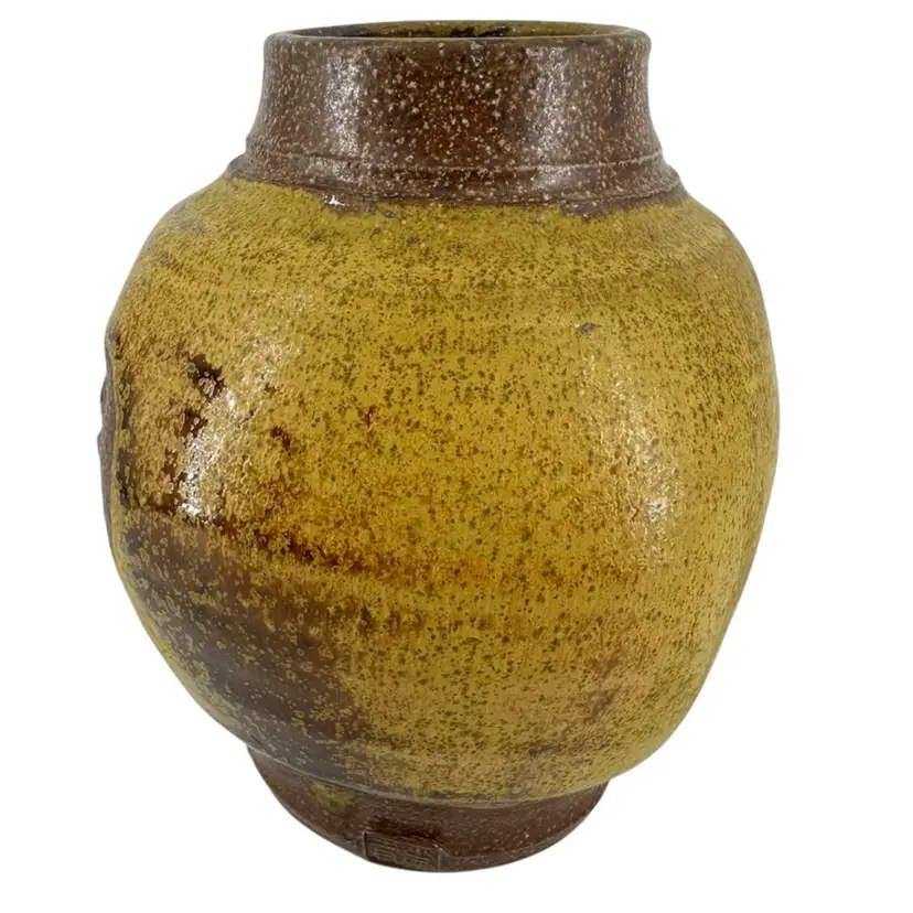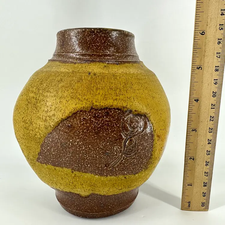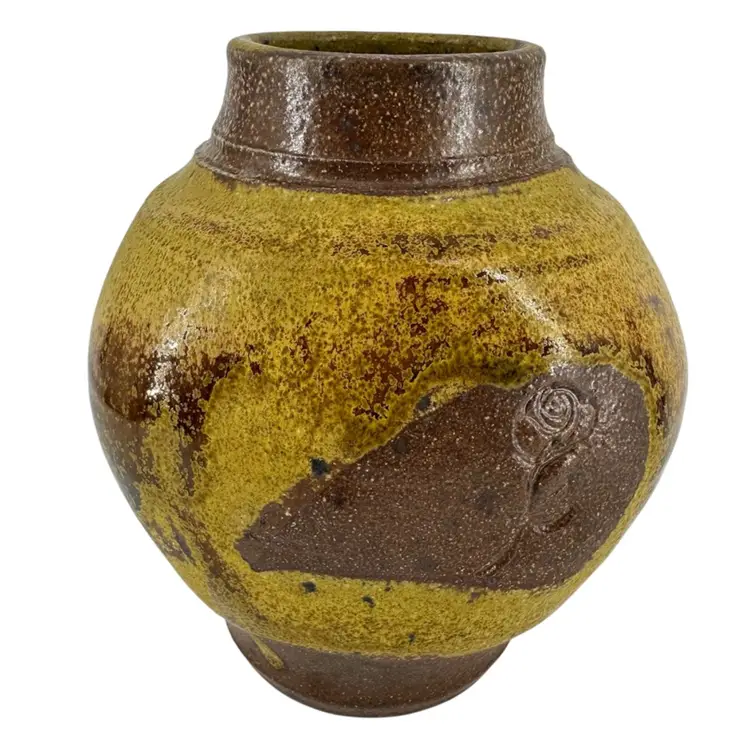 Bulbous Asian vase made of stoneware pottery, featuring a matte yellow glaze and imprinted rose design on each side. No chips or cracks. Vase measures approximately 6” tall. Logo imprinted on side of foot towards bottom, as pictured.