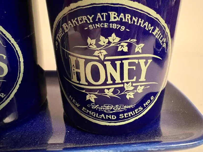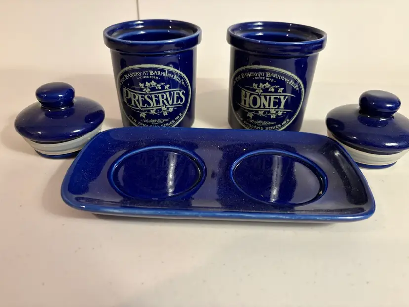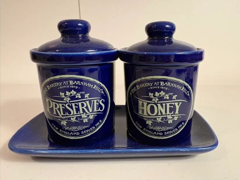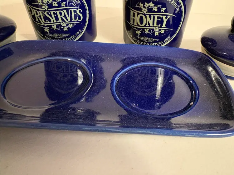 The Bakery at Barnham Hills stoneware jars and carry tray. New England Series 2. Nice heavy small jars with a cobalt blue matte glaze finish, tight sealing lids for freshness plus gaskets to keep preserves fresh longer. Neat old fashion country look. This is a 3 piece set for honey and preserves, each jar measures approx. 3"inches tall x 2.5"inches diameter. In very good condition no chips or cracks.