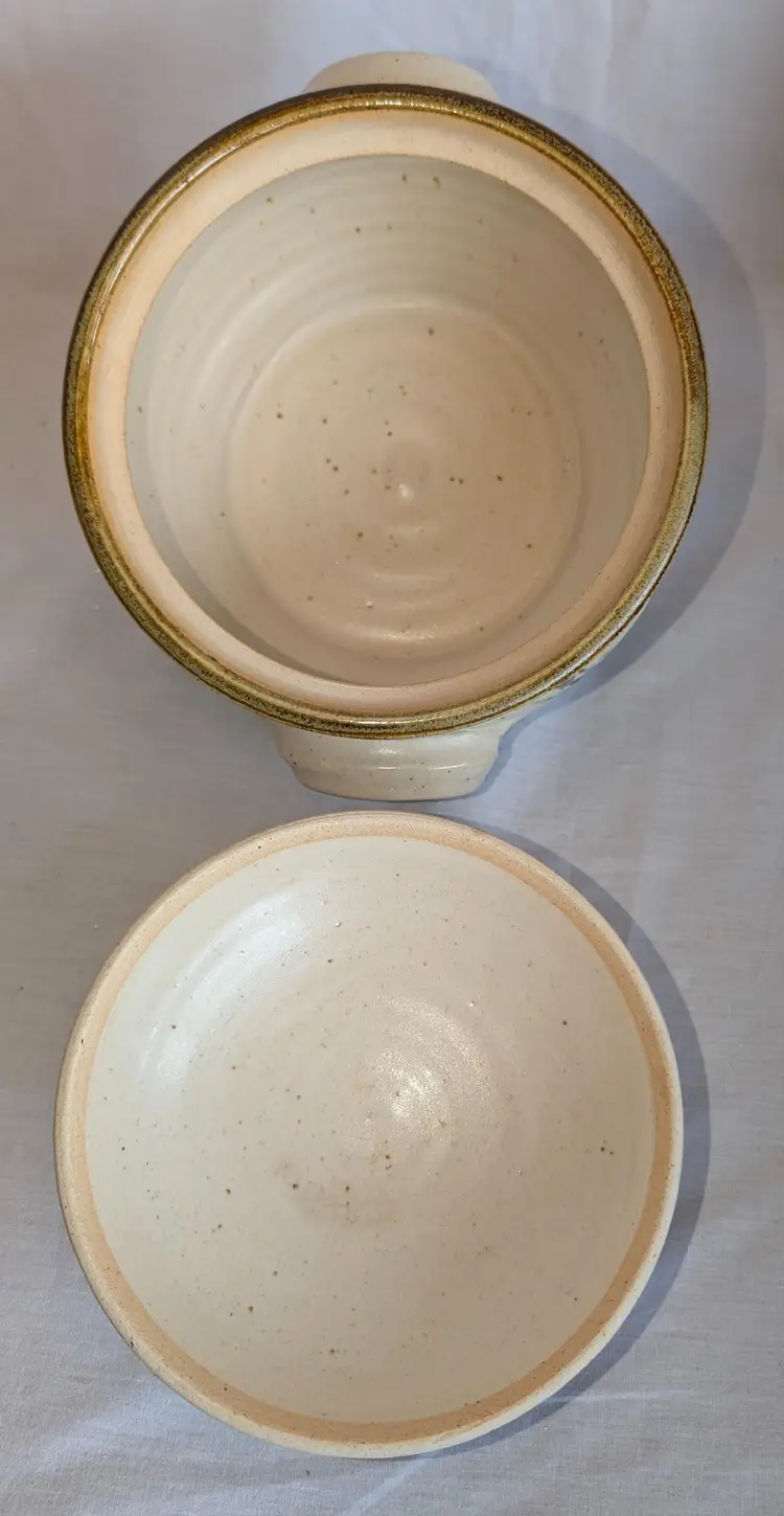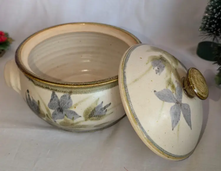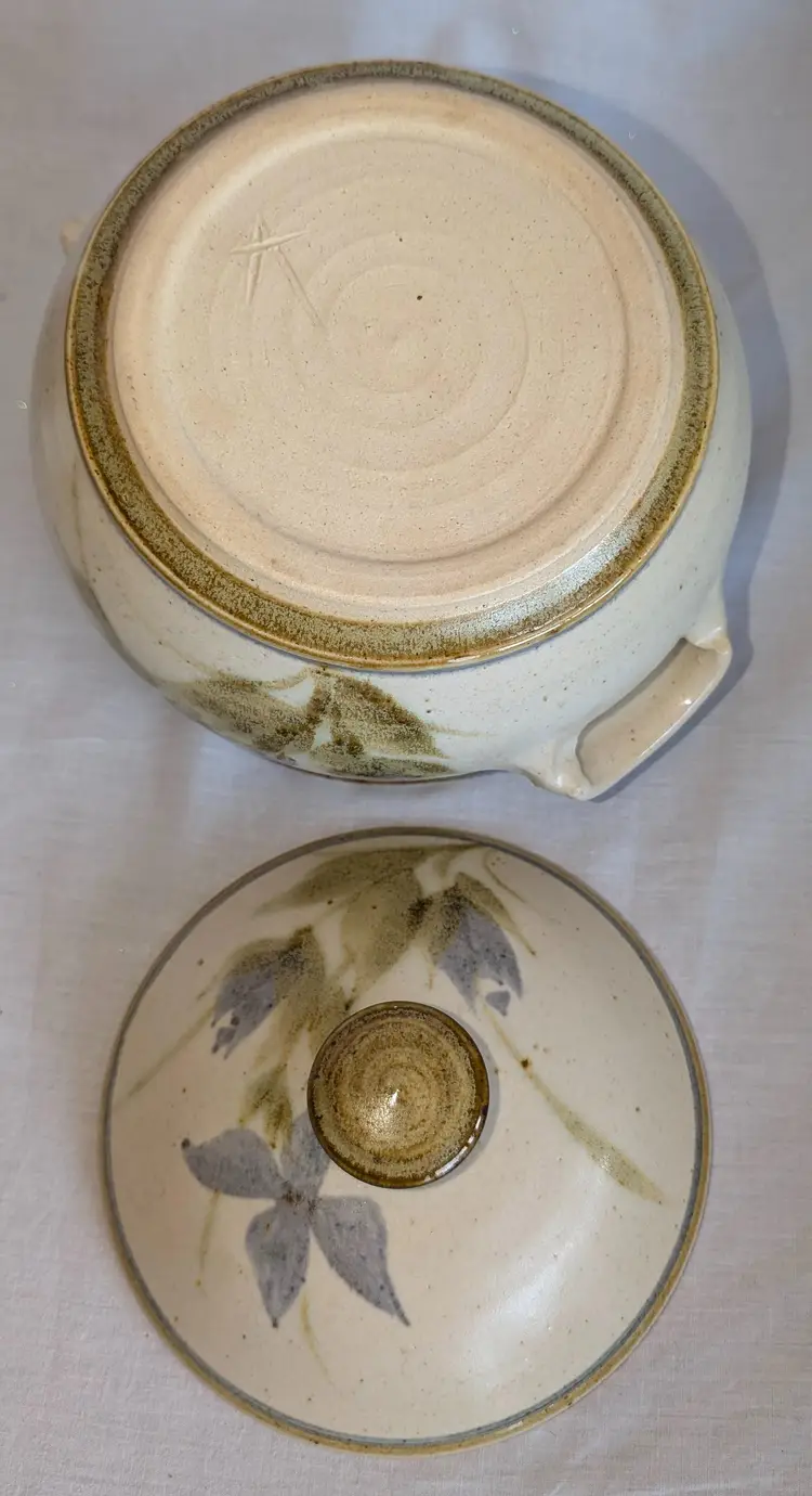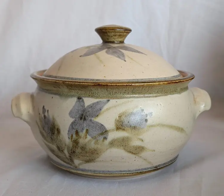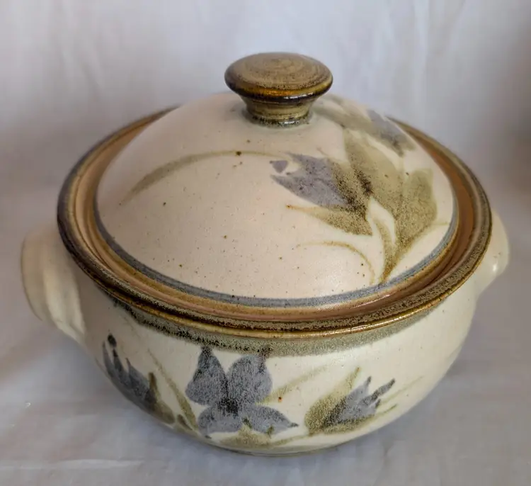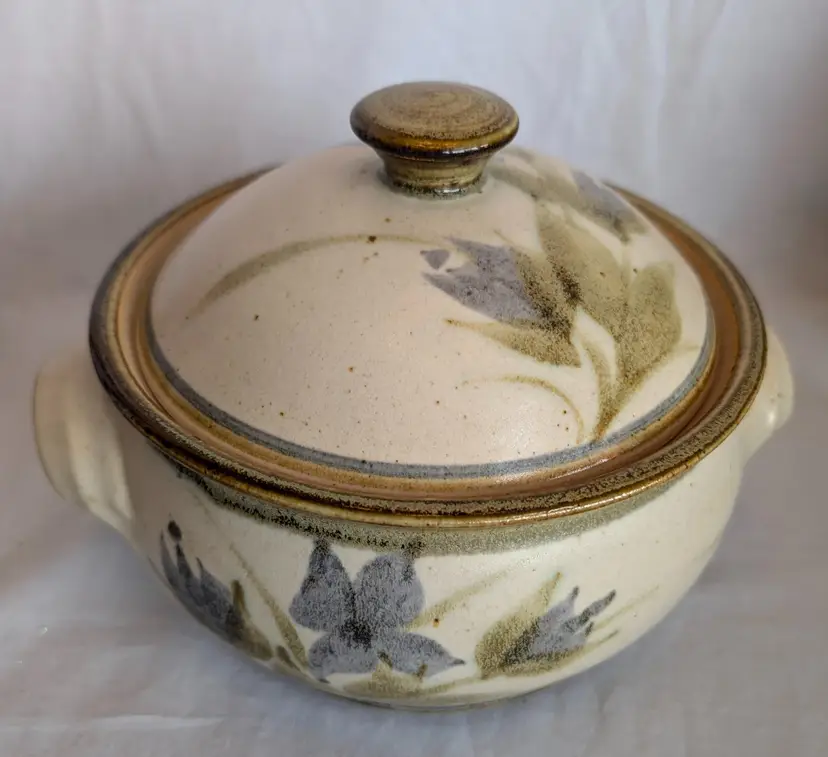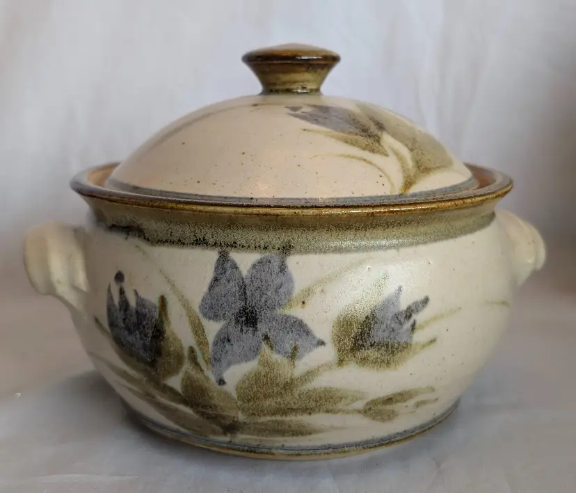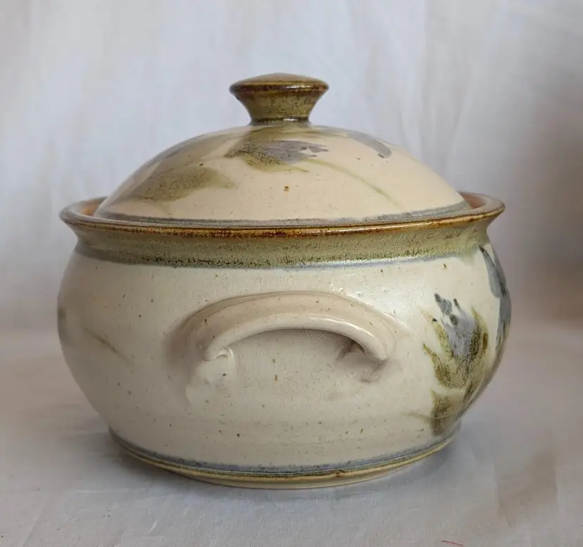 Stunning! Excellent Used Condition. No chips or cracks. 8.5" long including handles x 7" wide diameter bowl x 6" high including lid. Artisan signature on base.