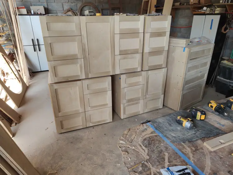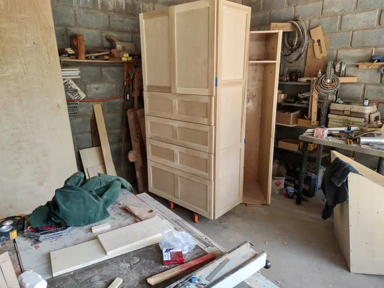 African Mahogany with plywood panels. Drawers have dividers for shoes, socks and individual types of clothes, as well as a concealed printer and computer and a slide out keyboard tray. Drawers are edged in Mahogany and use Blum hidden undermount slides ( as do most of my drawers). Most of my work is custom, made to order. If you would like a similar piece, contact me to discuss style, material, budget, ideas and shipping options. Price below is an estimate for similar furniture.