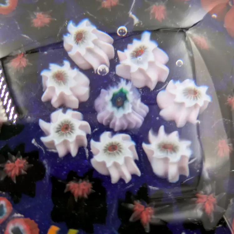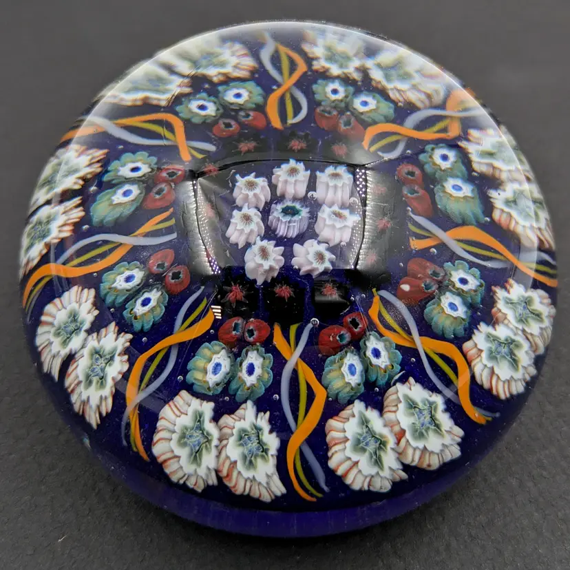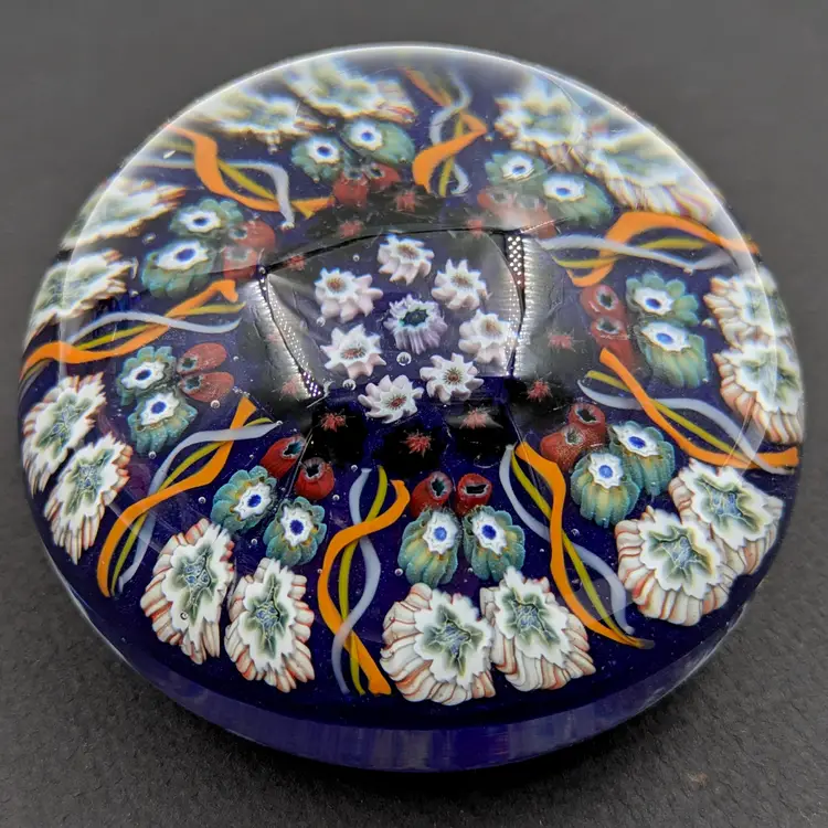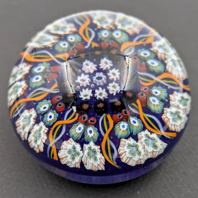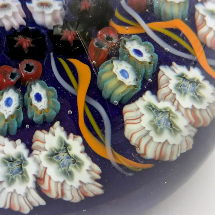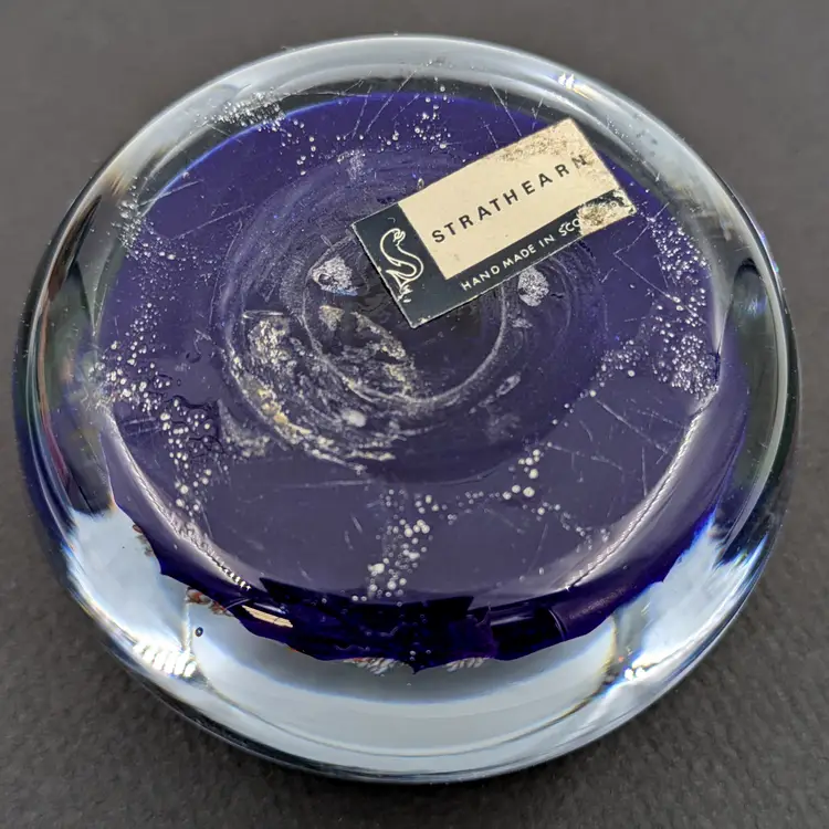 Vintage navy paperweight by Strathearn Scotland with an 8 Spoke design and millefiori details. These paperweights were an attempt to bring the French style of paperweight making to Scotland. Strathearn was active from 1965-1980. There is some wear on the bottom of the paperweight, but it still has its original paper label.