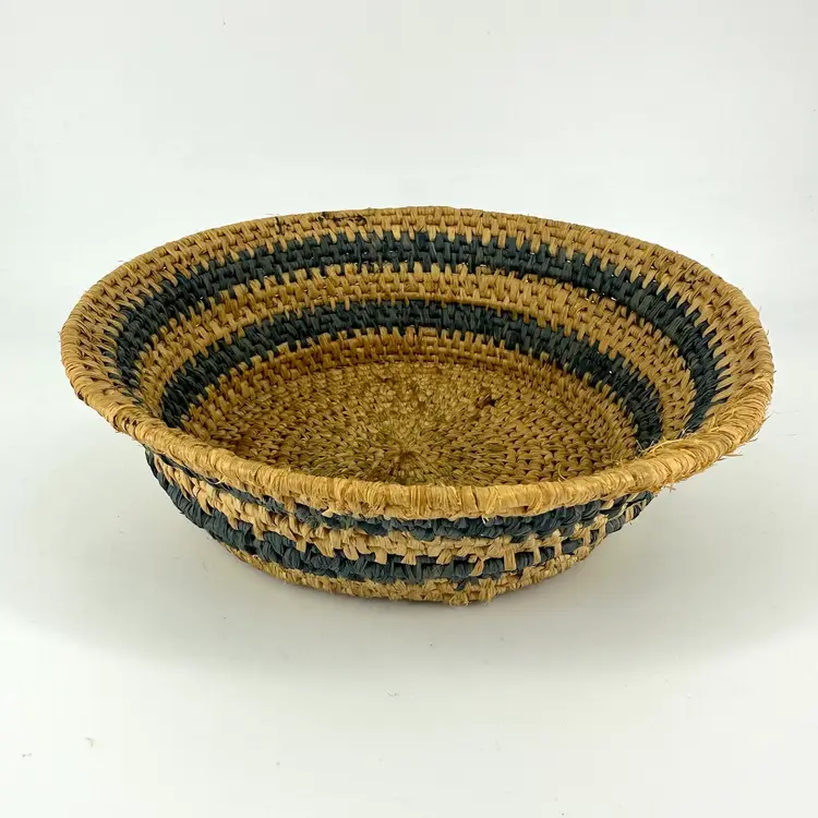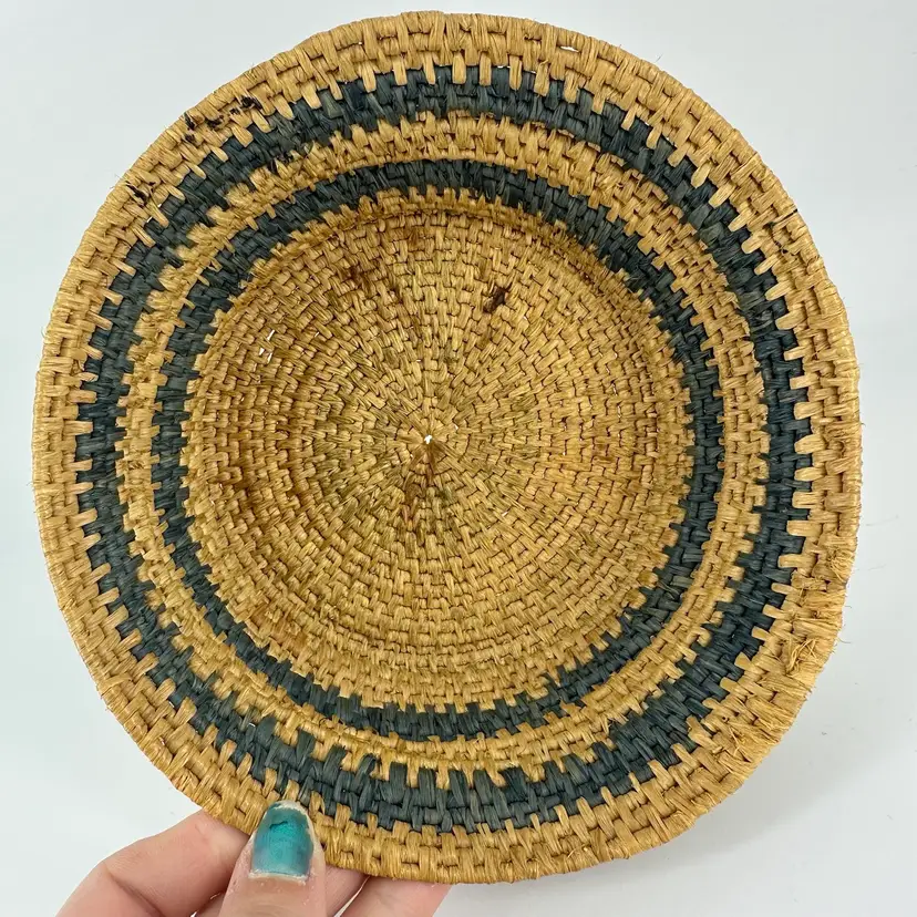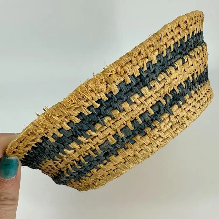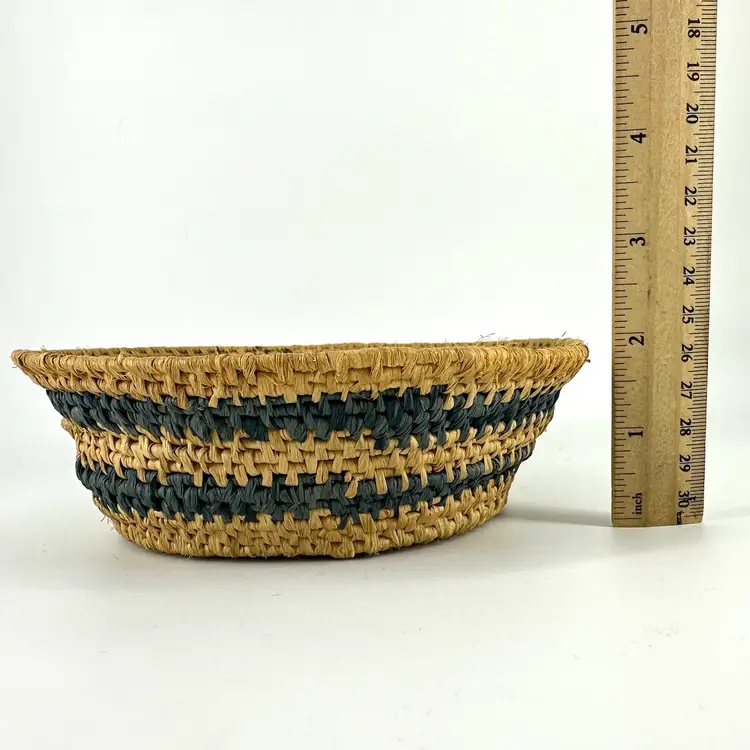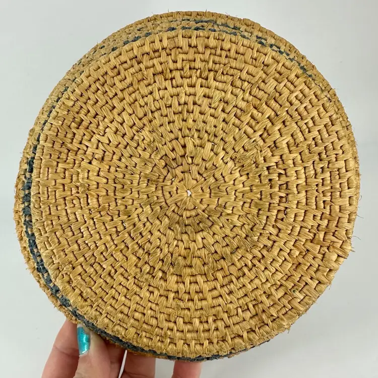 This Straw Woven Basket is apparently 2” in height and approximately 6.5” in width. There are no holes does have some fraying in the straw can be seen in the photos. It doesn’t have any signatures or markings on it.