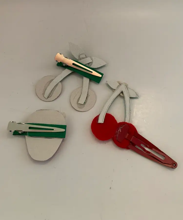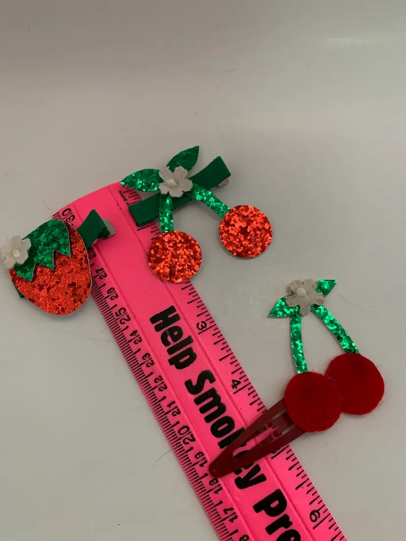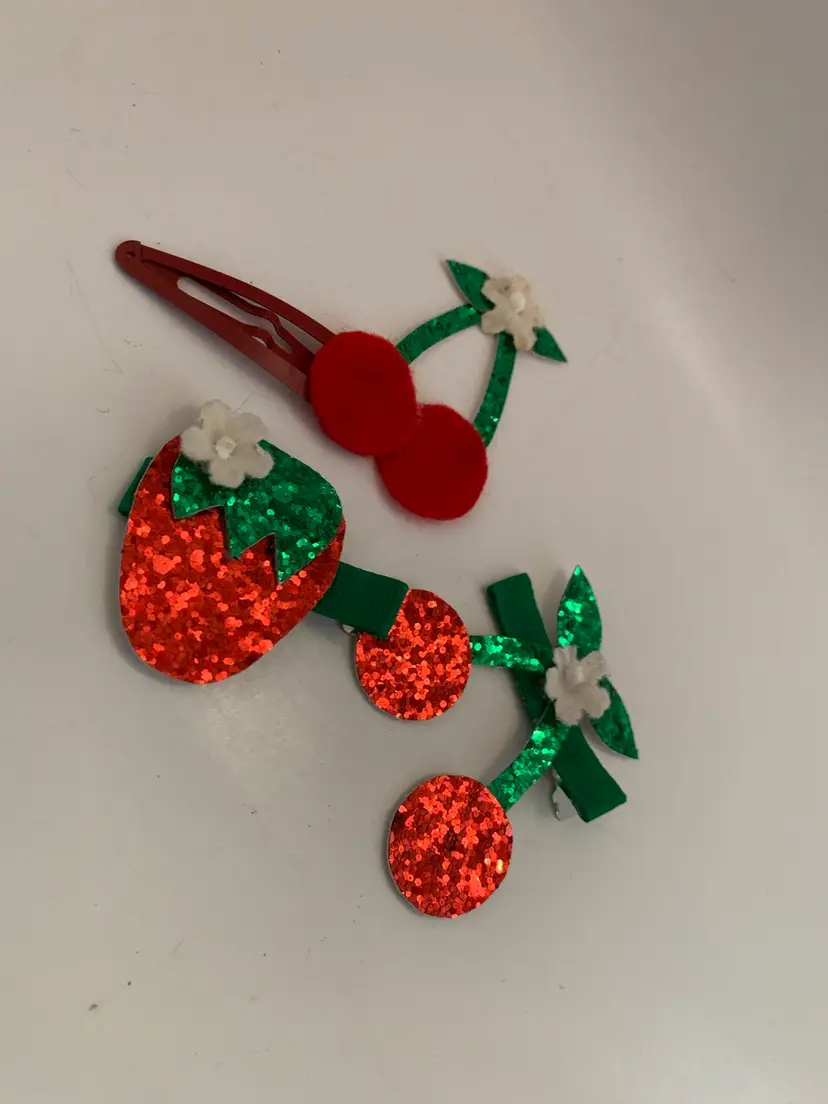 Handmade and designed by me, set of 3 strawberry and cherries hair clips. Made from red and green glittered vinyl, red felt and vintage forget-me-nots. Unique, one of a kind hair accessories!