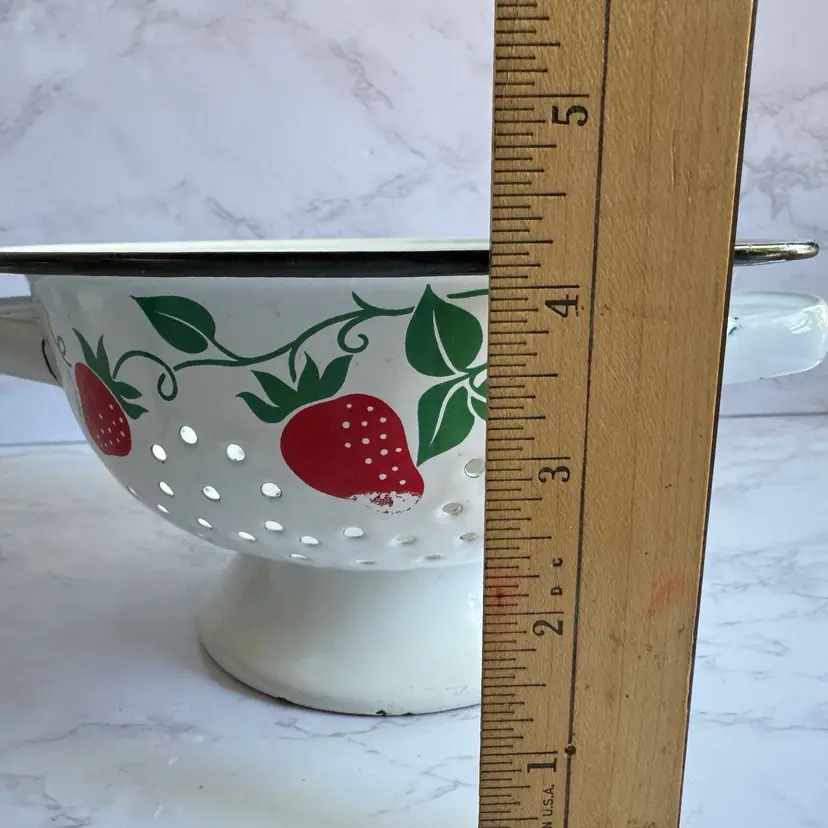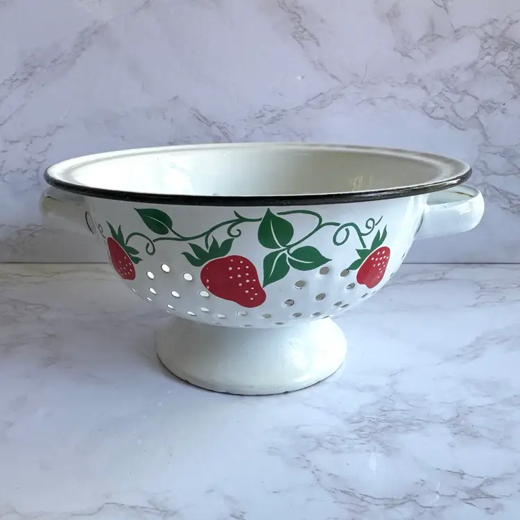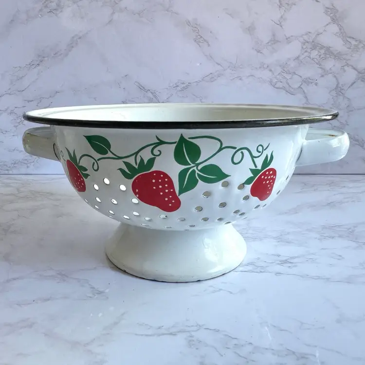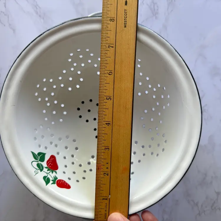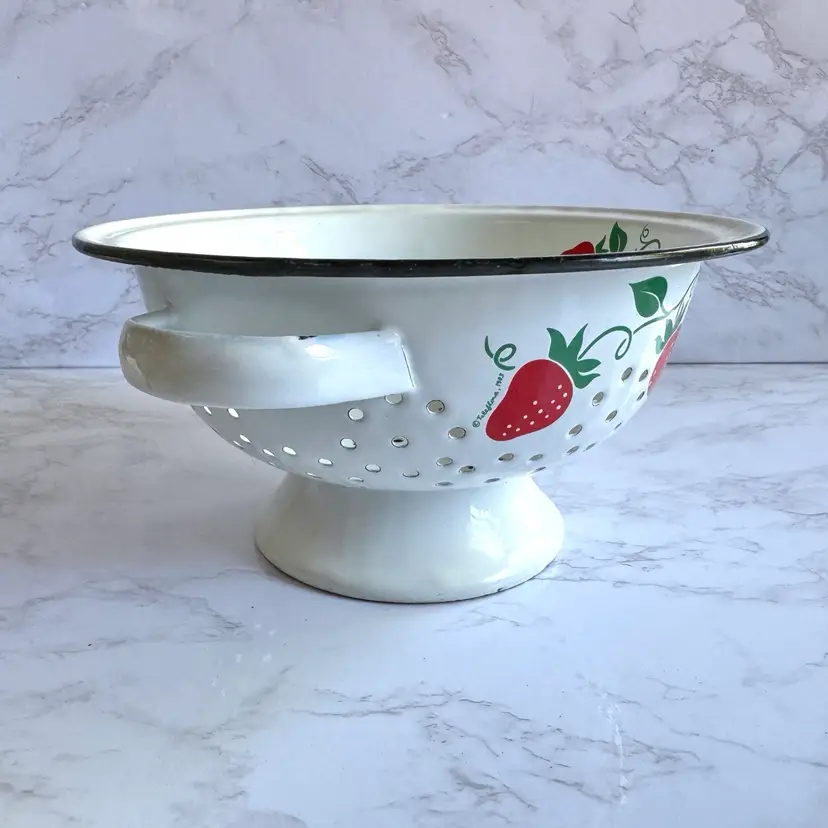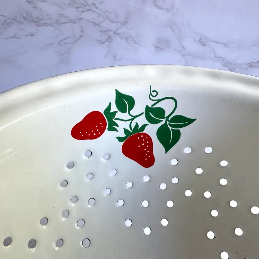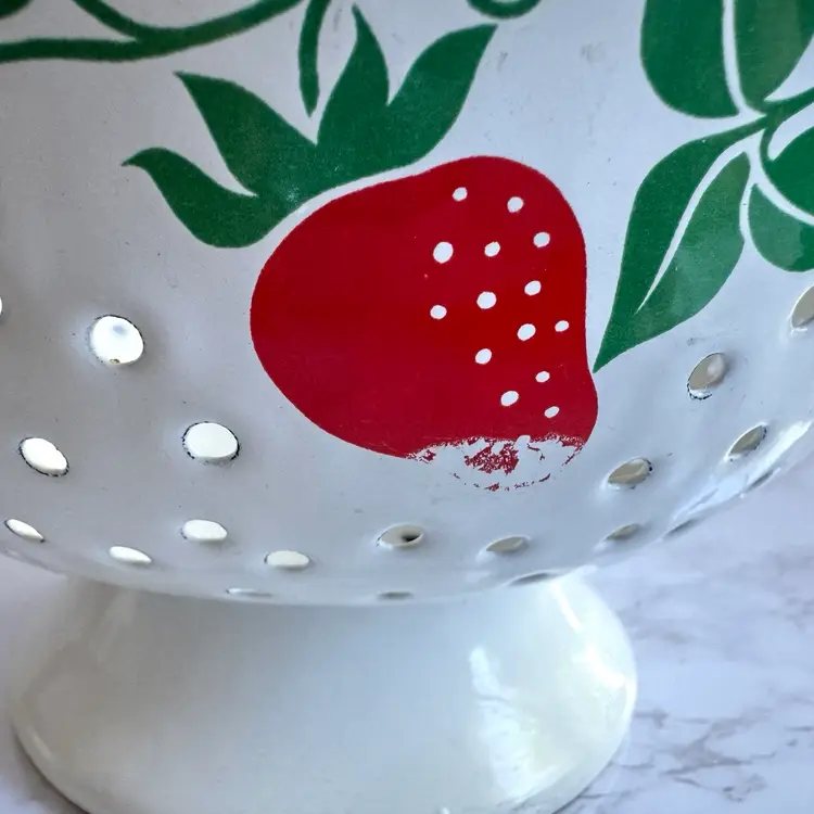 Some chips to the enamel and rust in some areas. Some paint loss to the strawberry pattern. 8”dia x 9”w at handles x 4-1/4”h