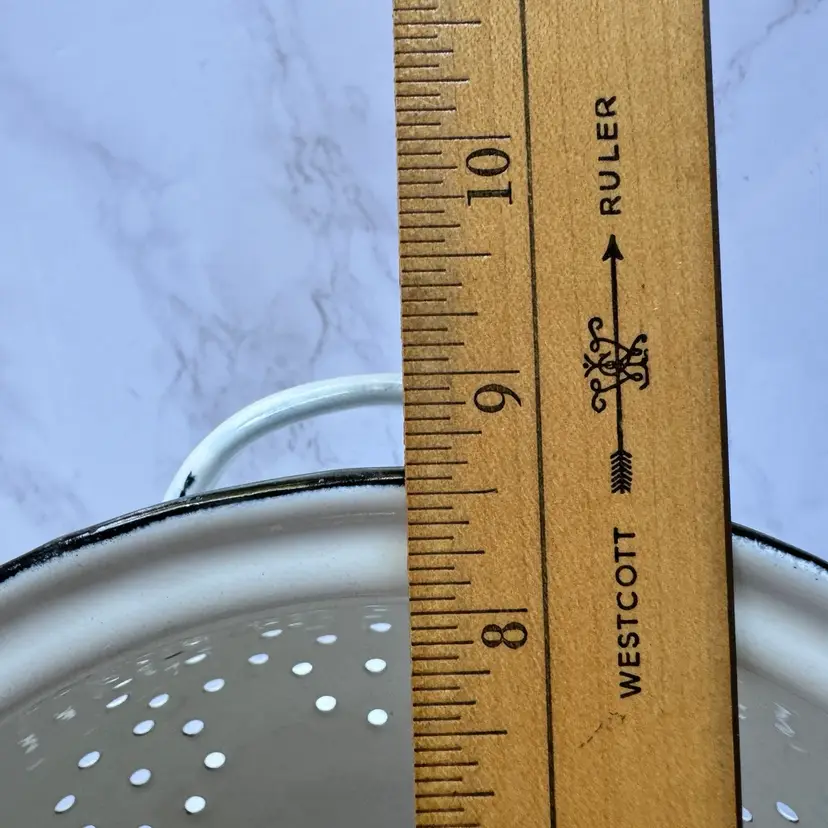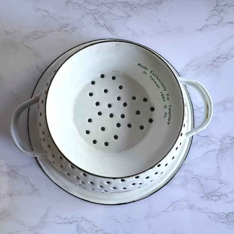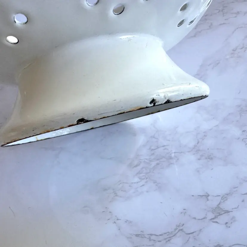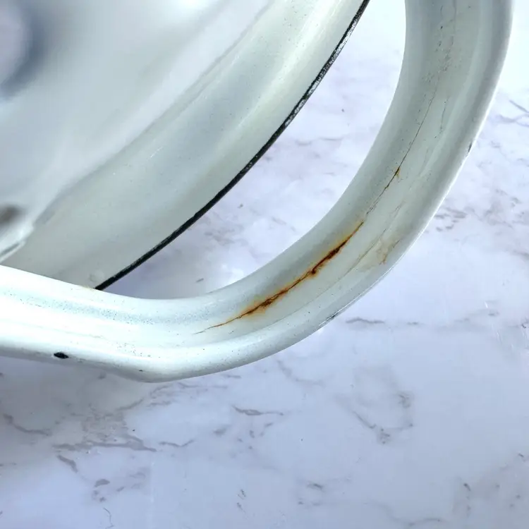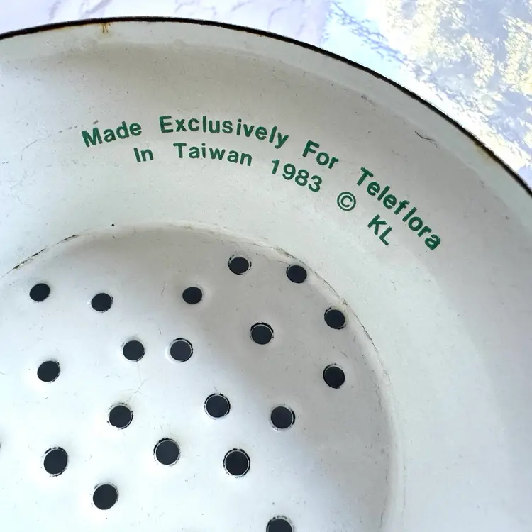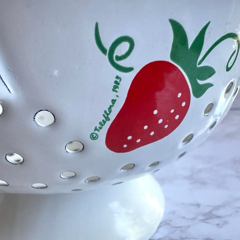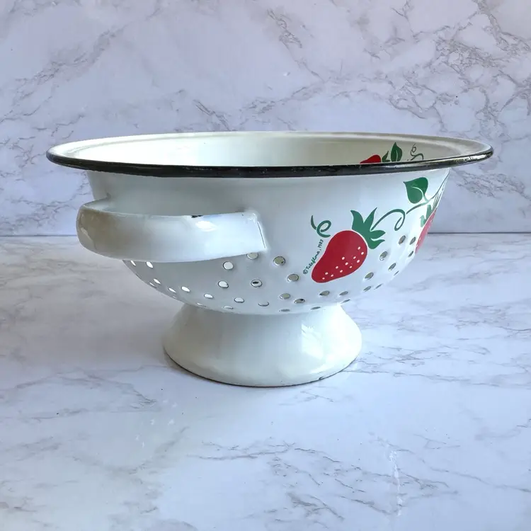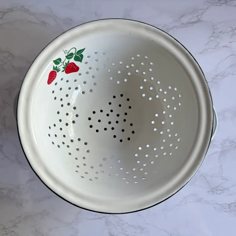 Some chips to the enamel and rust in some areas. Some paint loss to the strawberry pattern. 8”dia x 9”w at handles x 4-1/4”h