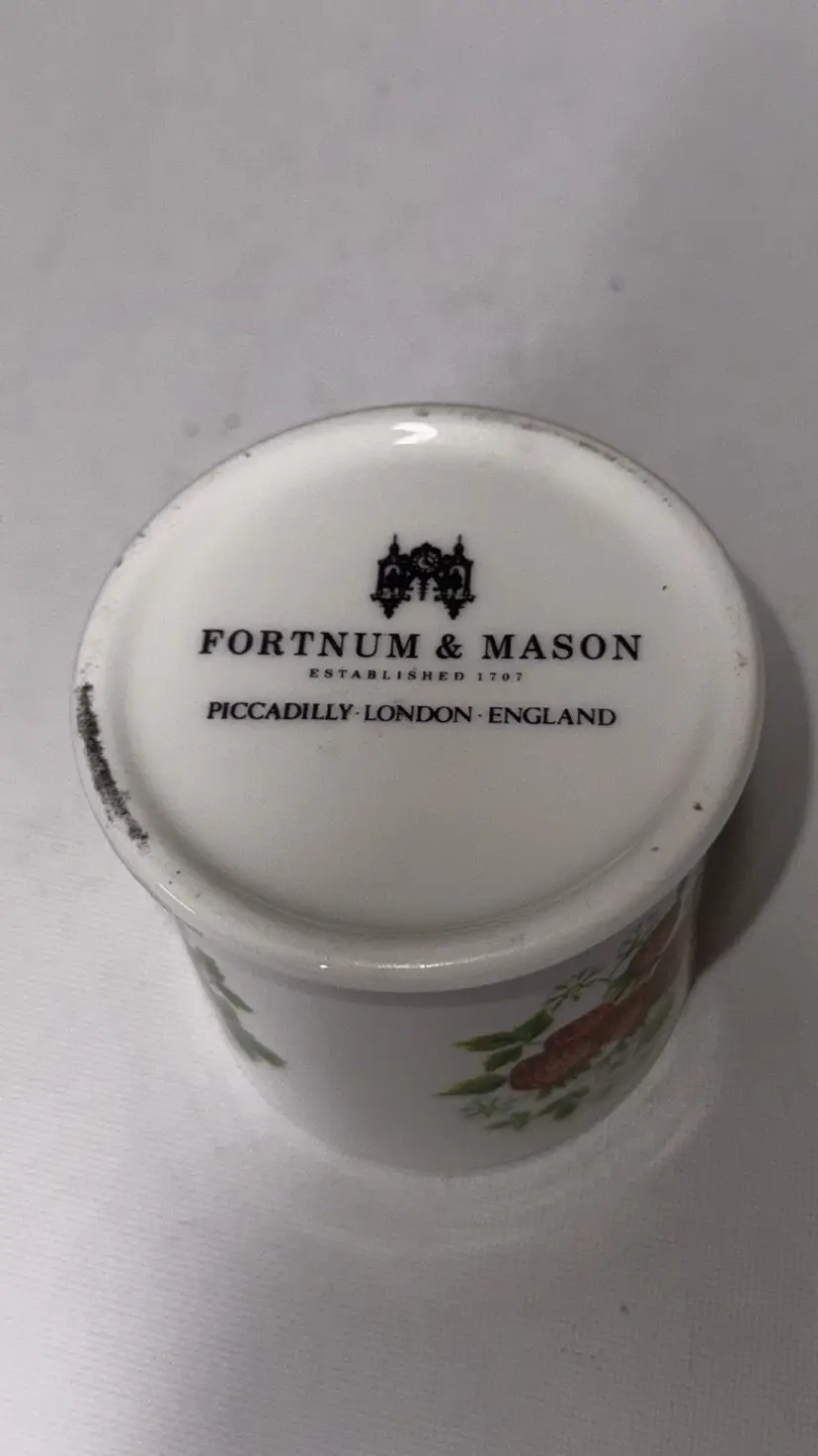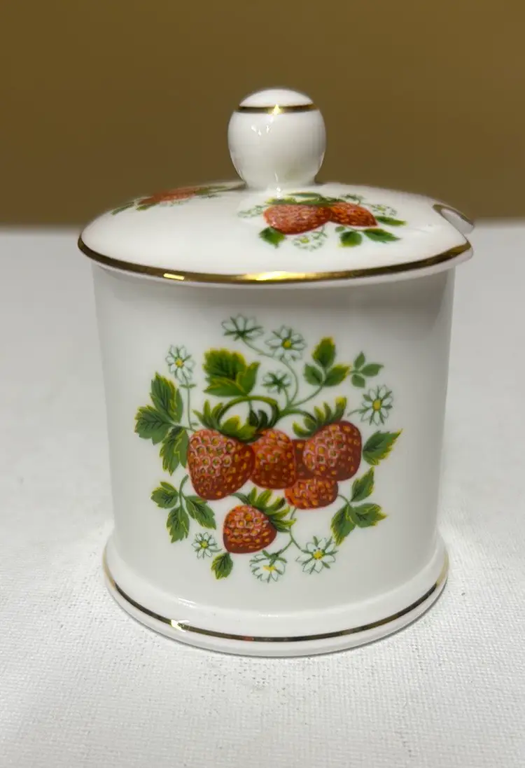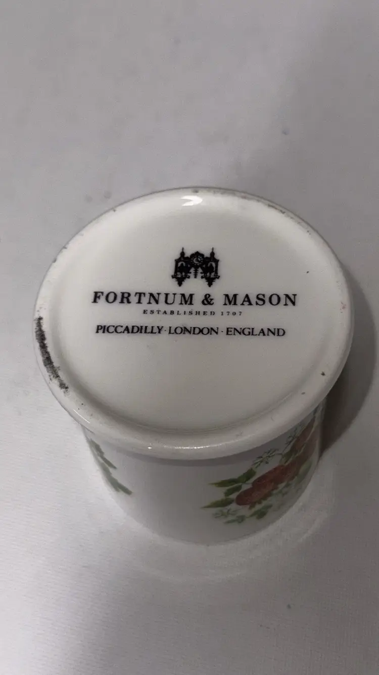 Vintage Strawberry Floral Fine China Jam~Preserves Pot Fortnum & Mason England 3” tall 2.5” diameter Charming porcelain jar with a strawberry design. Features a white base with green and red accents. Excellent like new condition with no breaks or chips (801721252w90)