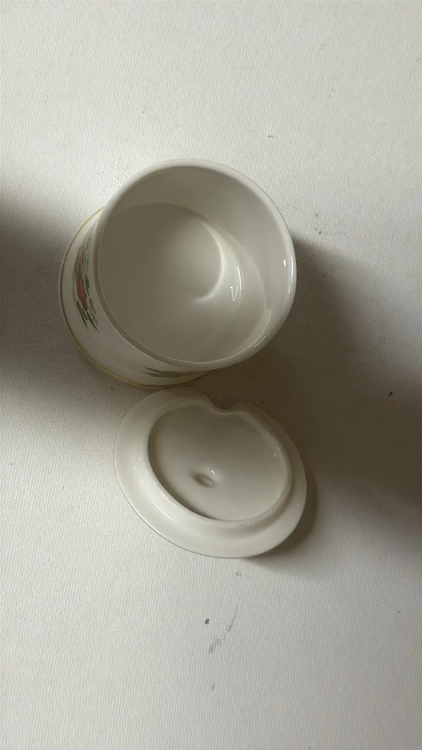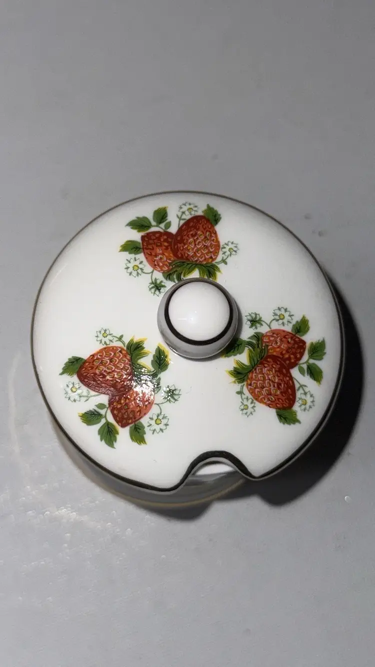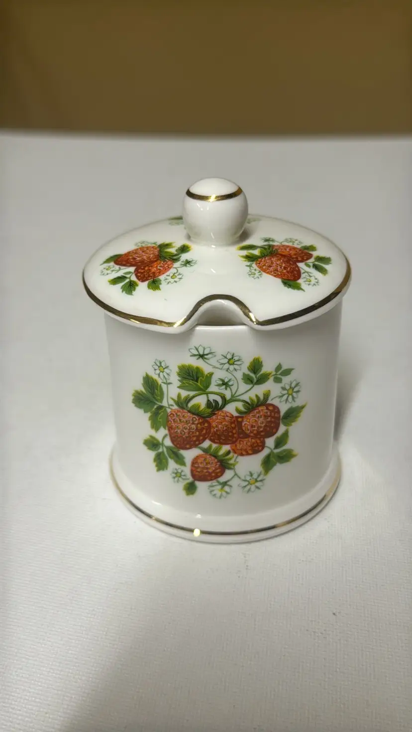 Vintage Strawberry Floral Fine China Jam~Preserves Pot Fortnum & Mason England 3” tall 2.5” diameter Charming porcelain jar with a strawberry design. Features a white base with green and red accents. Excellent like new condition with no breaks or chips (801721252w90)