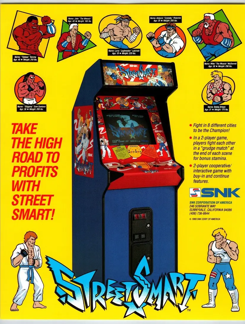 Brand: SNK Year: 1989 Game Title: Street Smart Theme: Retro Original/Reproduction: Original Country/Region of Manufacture: United States Modified Item: No Arcade: Flyer