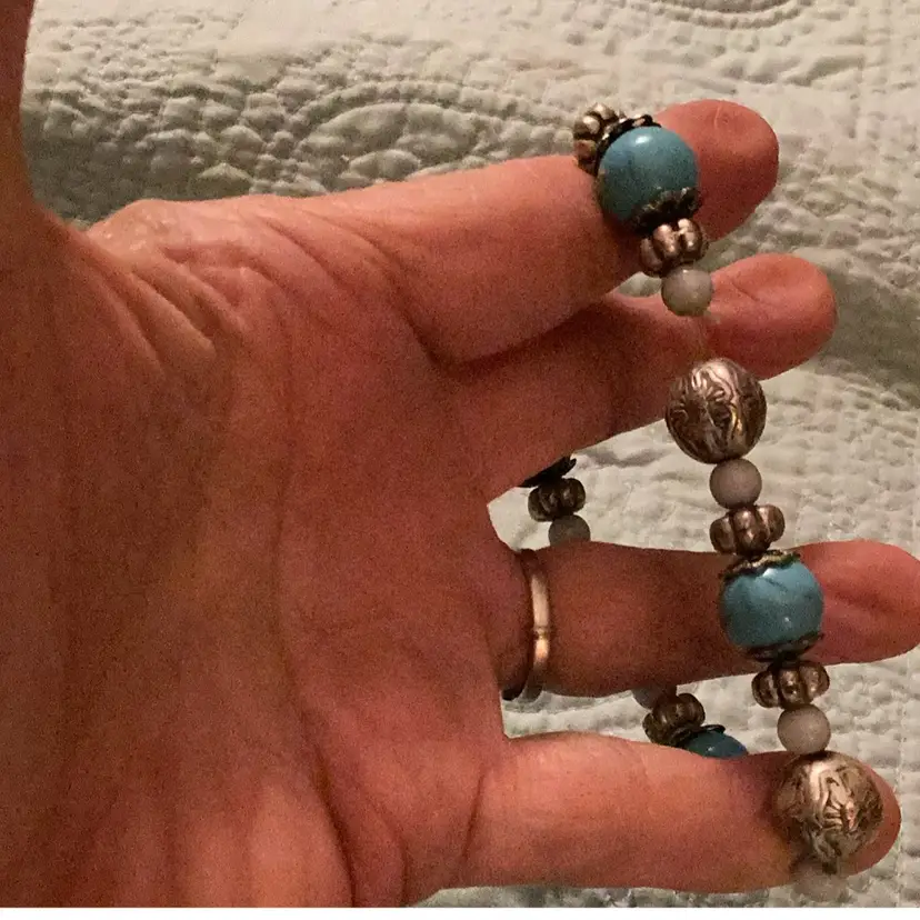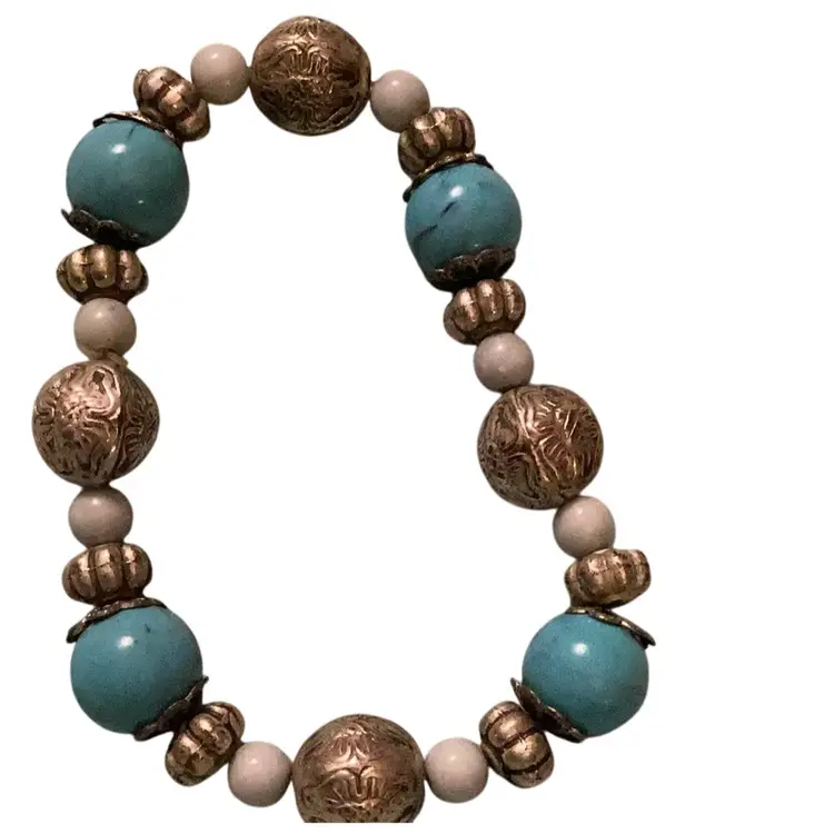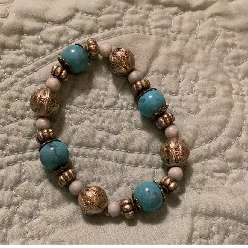 This is a stretch bracelet made with photo turquoise, some bead caps, white beads, silver beads, and stretch material