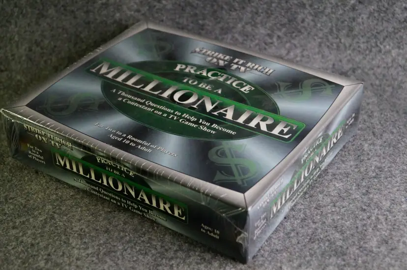 This listing features a brand new, sealed copy of Strike It Rich on TV: Practice to Be a Millionaire, a trivia-based board game designed to simulate the excitement of competing on a TV game show. With 1,000 questions and gameplay for 2 to a roomful of players, it’s perfect for family gatherings, parties, or solo practice.