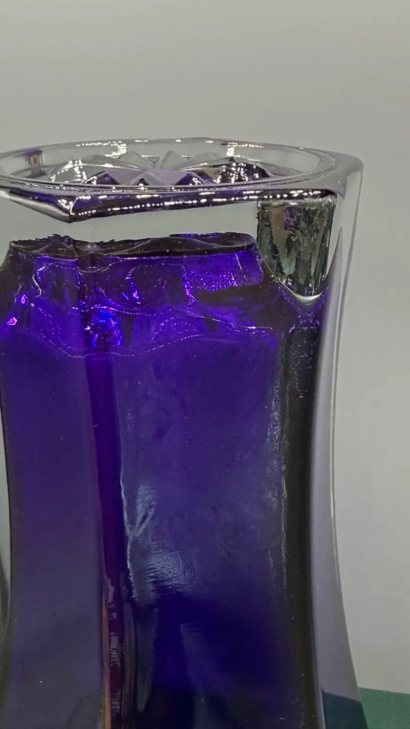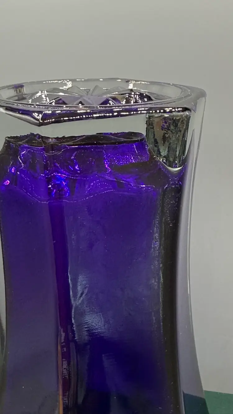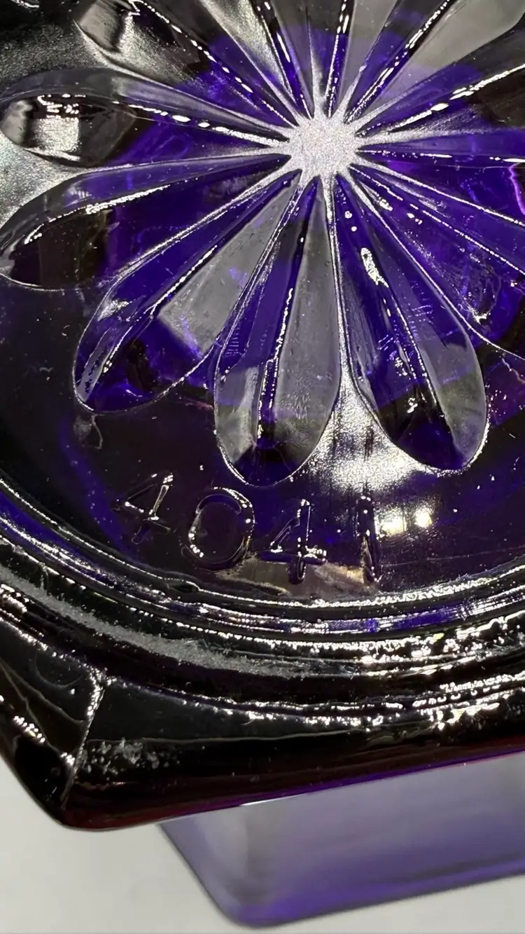 Pressed glass that has been "flashed" with a thin layer of deep purple color over clear glass. Good vintage condition with no chips or cracks. It shows some minor interior surface scratches consistent with age and previous use. Since this is flashed glass, these markings are areas where the purple tint has lightly worn. Hand wash only.