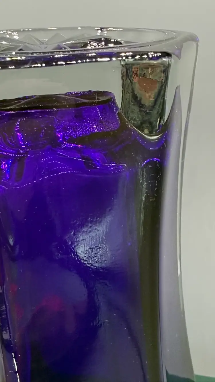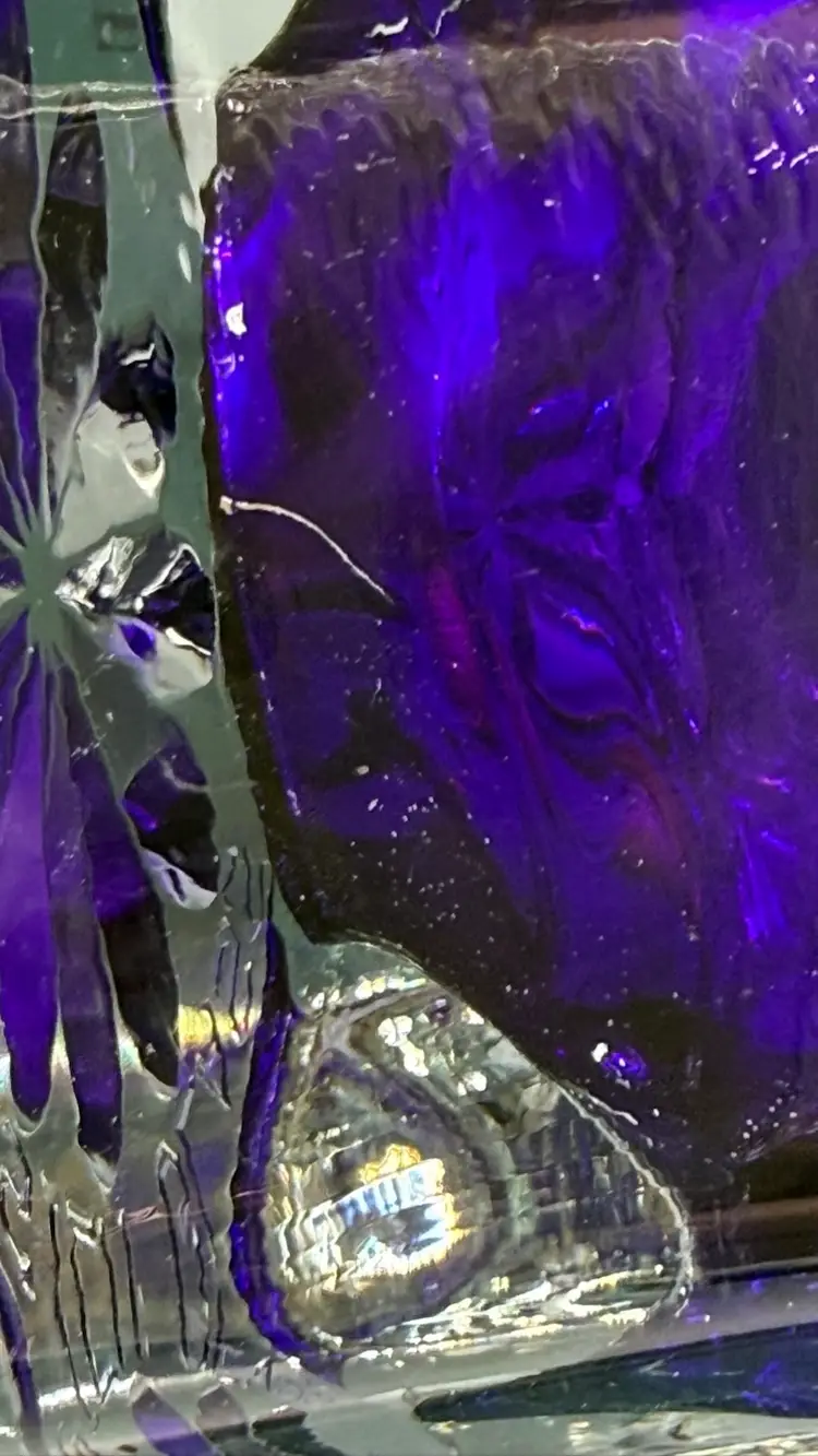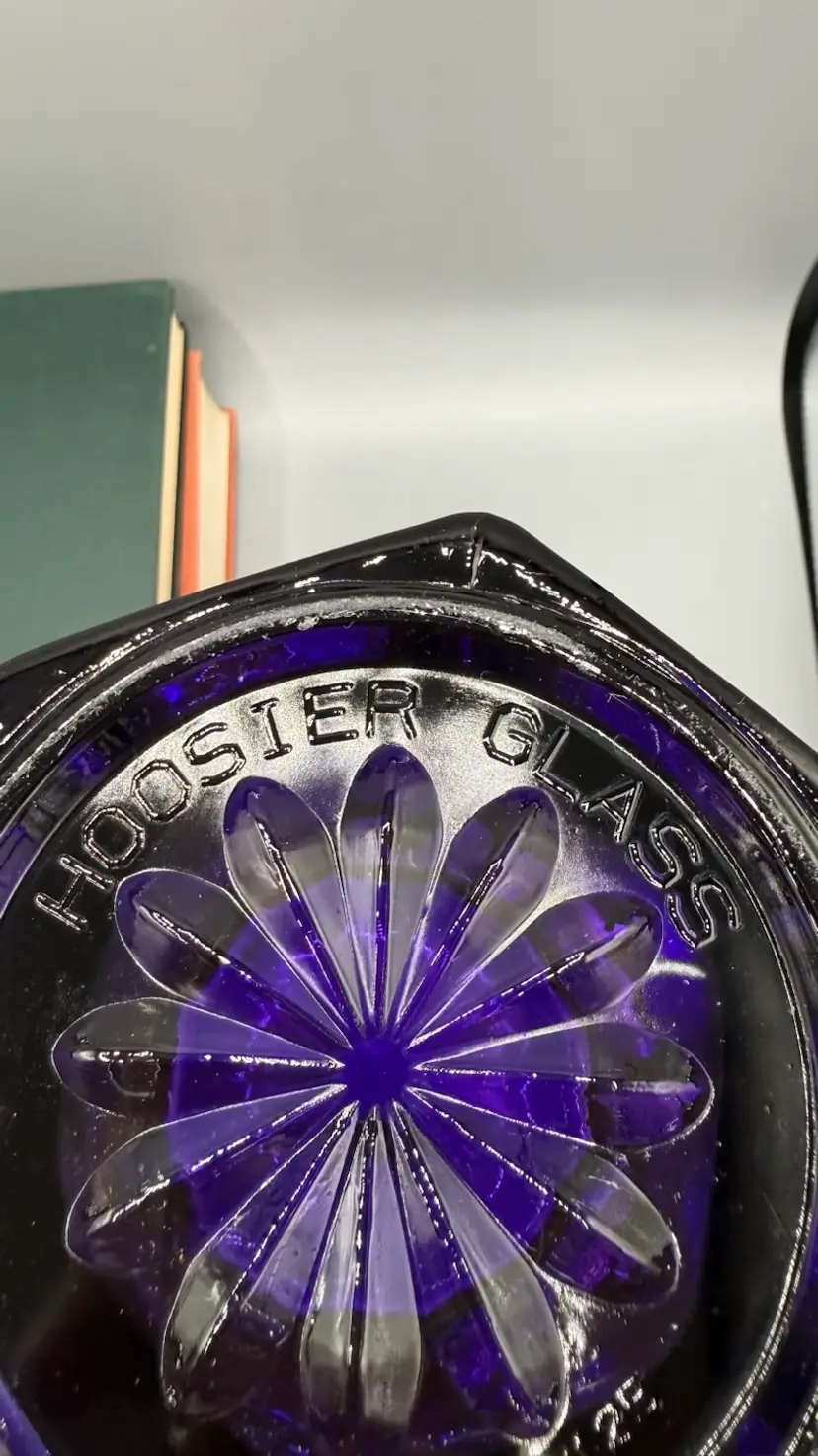 Pressed glass that has been "flashed" with a thin layer of deep purple color over clear glass. Good vintage condition with no chips or cracks. It shows some minor interior surface scratches consistent with age and previous use. Since this is flashed glass, these markings are areas where the purple tint has lightly worn. Hand wash only.