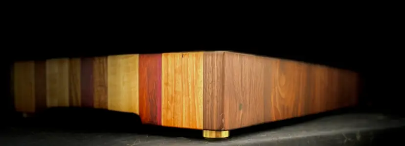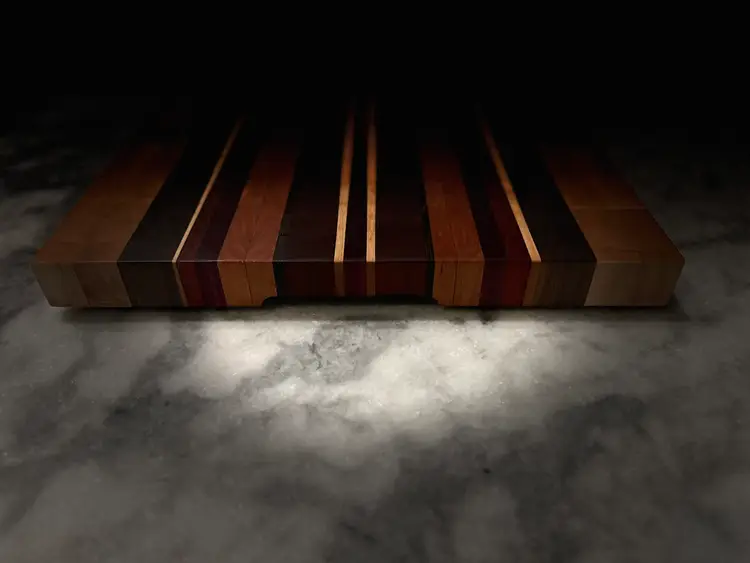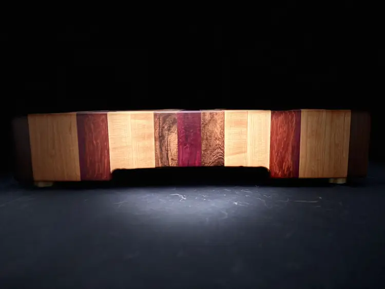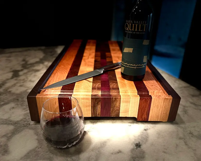 Elevate your kitchen with this custom heirloom-style hardwood cutting board, perfect for showcasing your favorite bottle and glass. A stylish addition to any gathering. This board is made from Maple, Walnut, Cherry, Purpleheart, and Wenge with 1" brass feet and finger grooves. The Maple and Cherry strips are book-matched for an additional accent