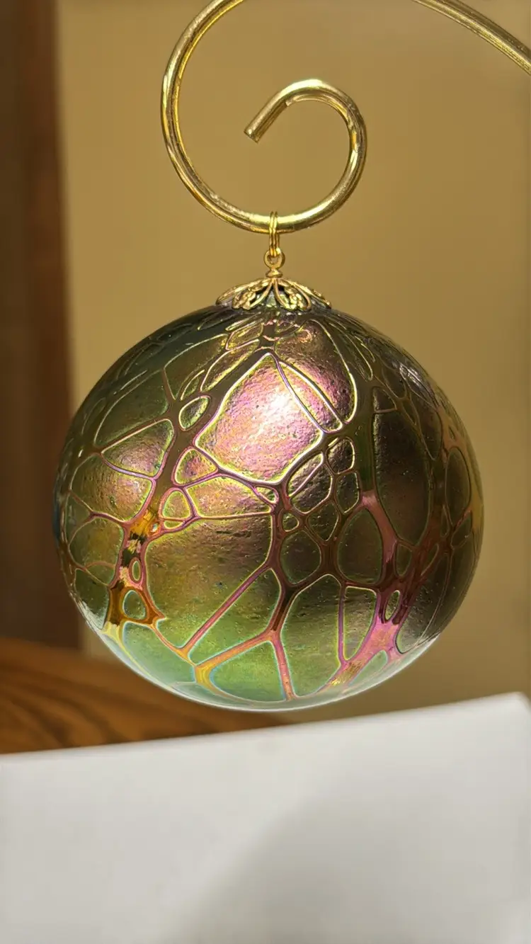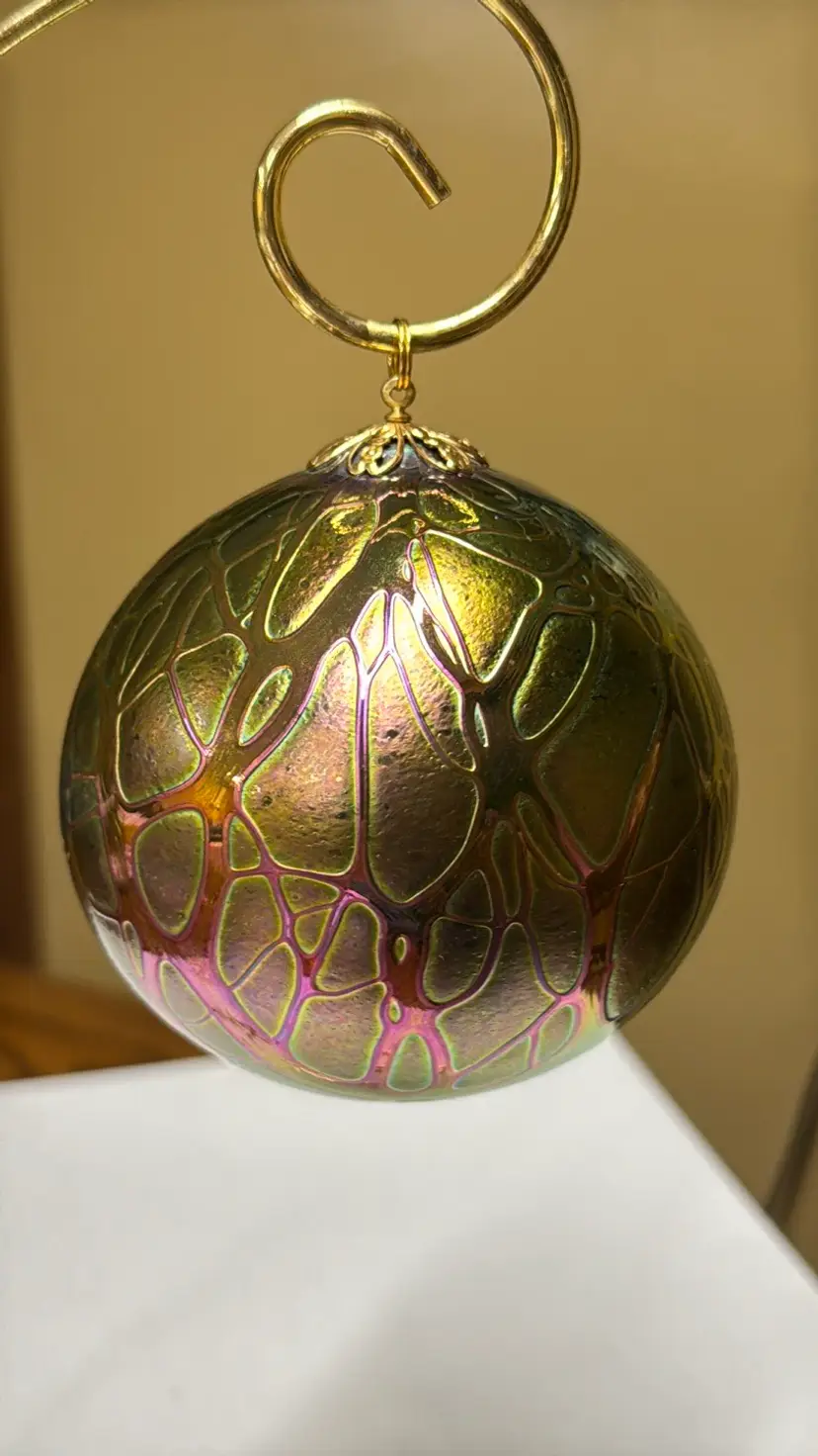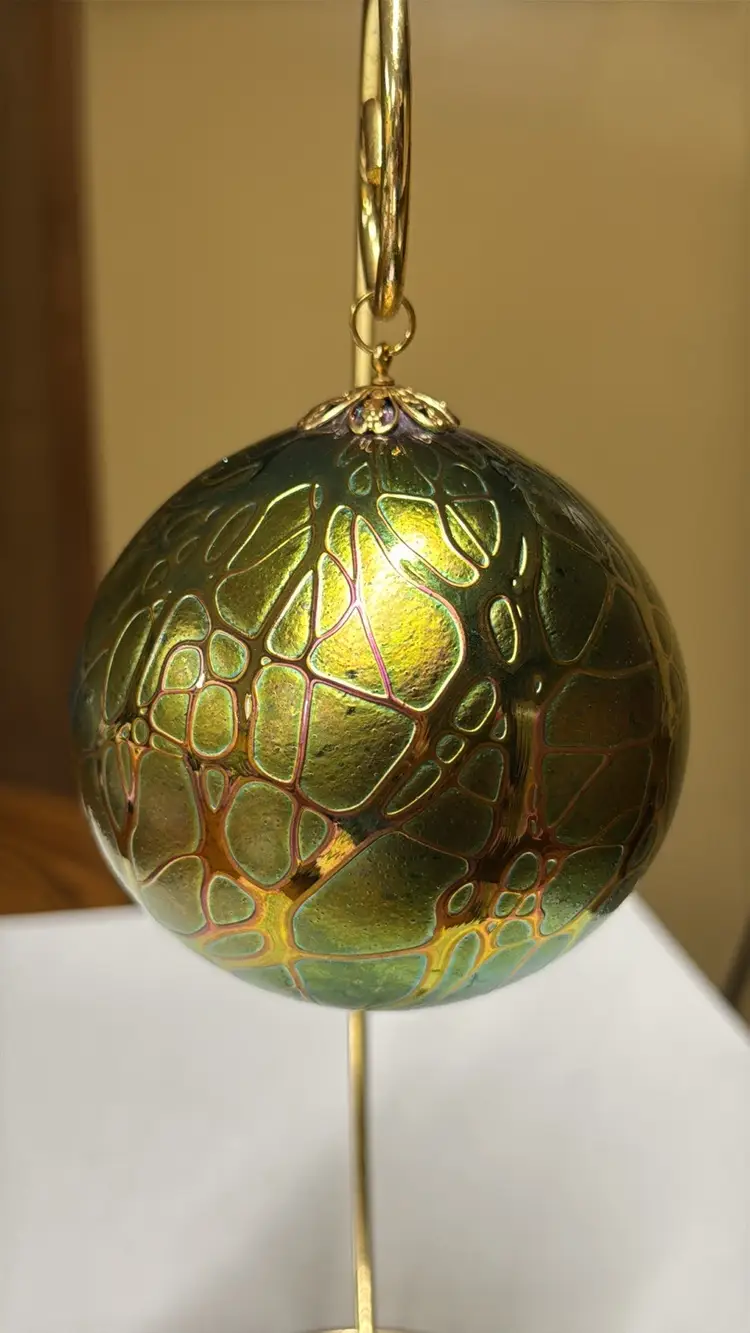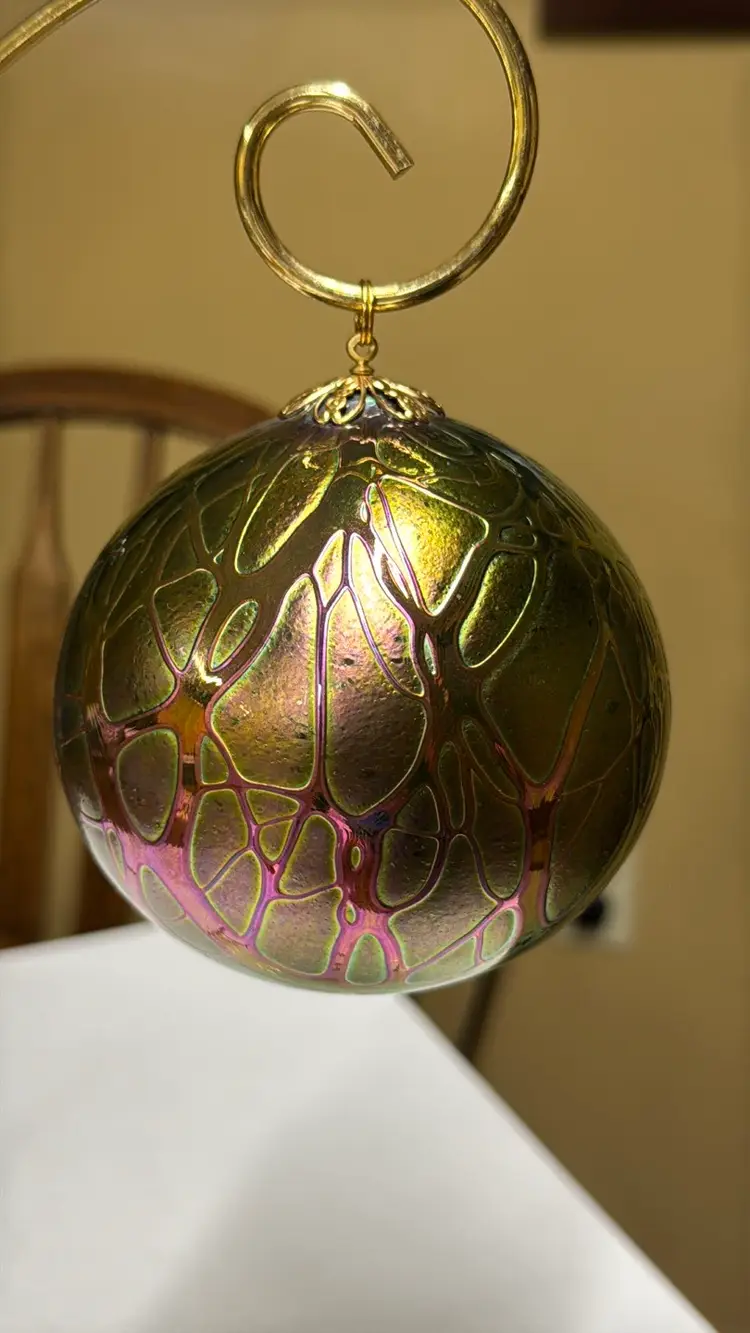 STUART ABELMAN GOLD iridescent GLASS ORNAMENT Gold green and pink absolutely beautiful, the pictures can’t capture how beautiful it is! Spherical 4” across-nice size Signed 2010 (221222415)