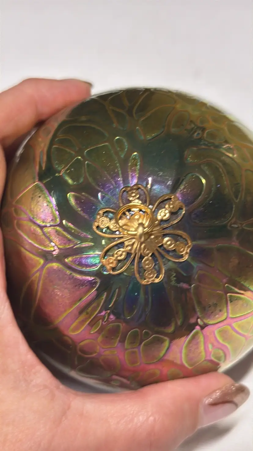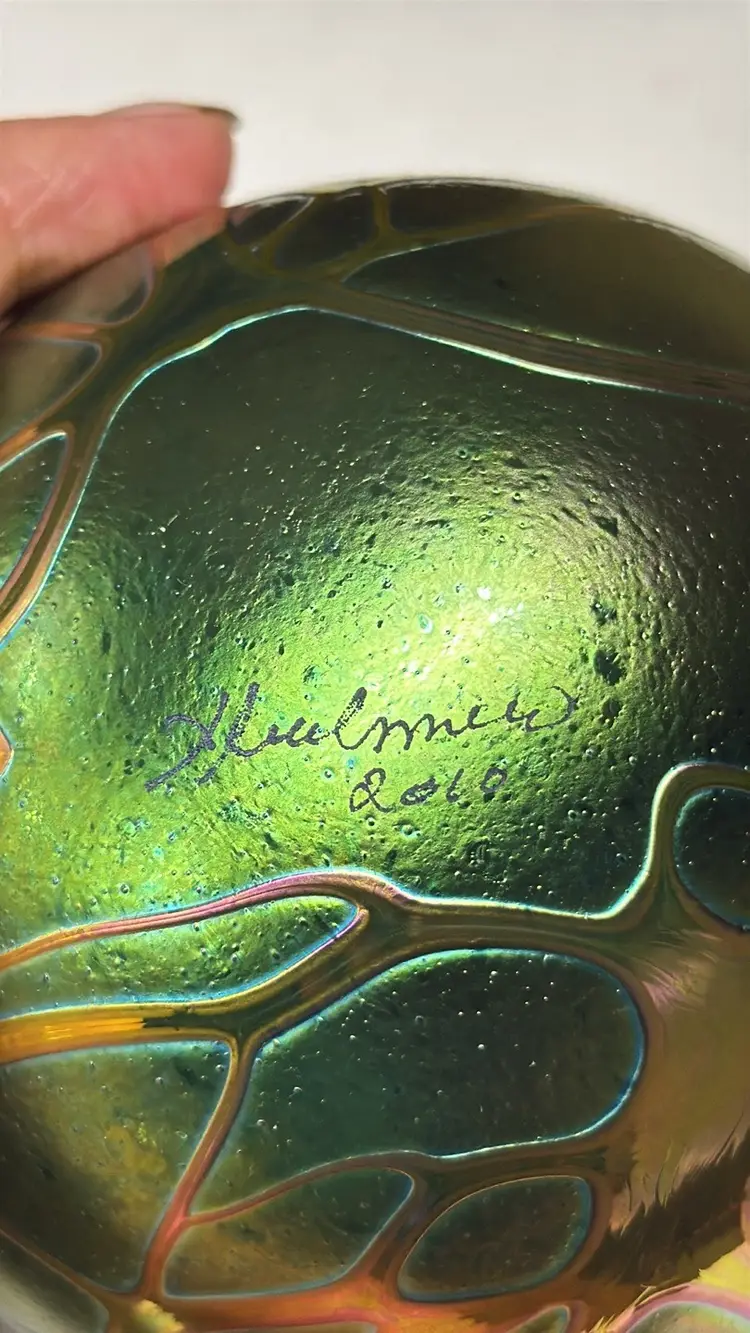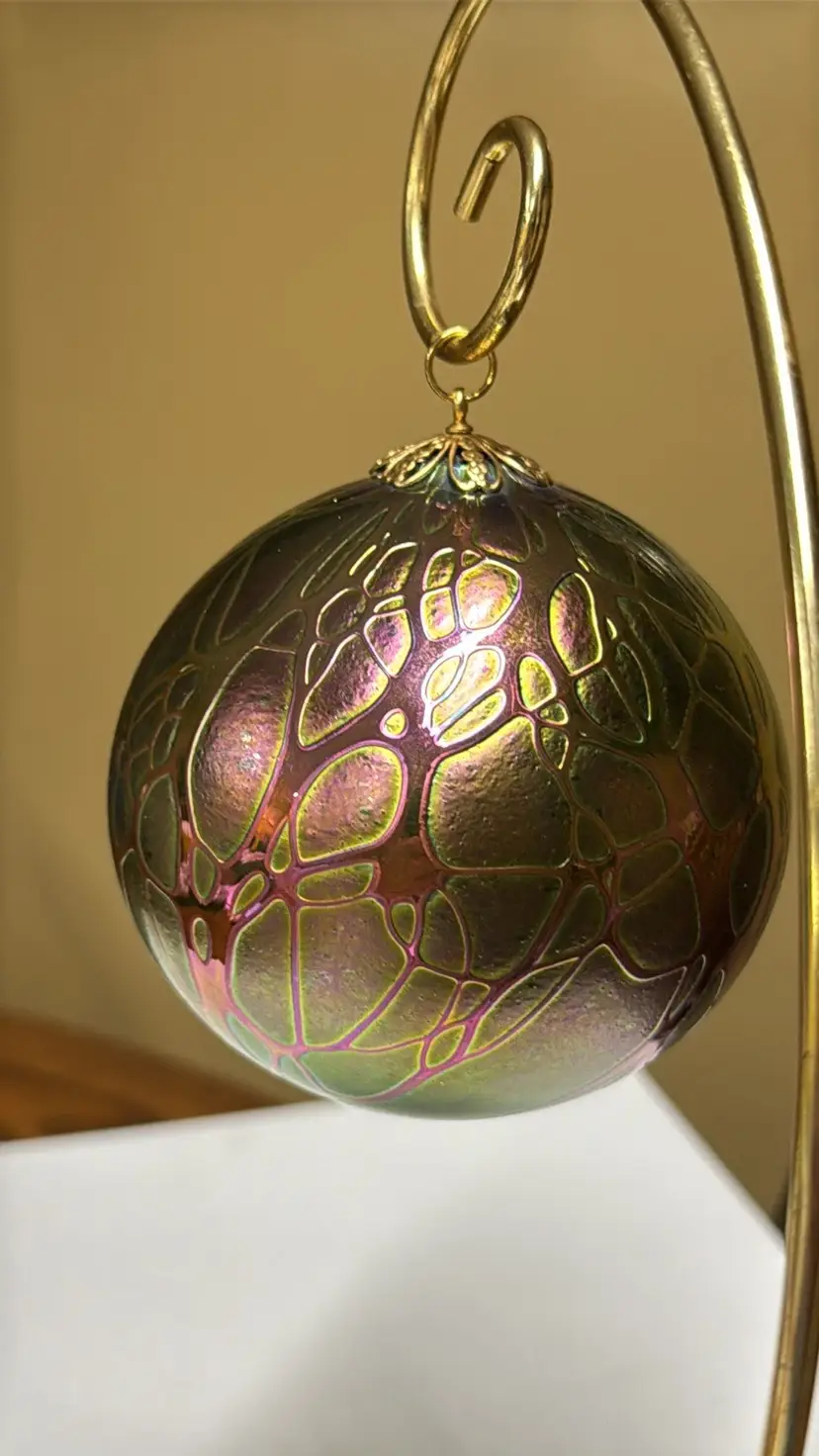 STUART ABELMAN GOLD iridescent GLASS ORNAMENT Gold green and pink absolutely beautiful, the pictures can’t capture how beautiful it is! Spherical 4” across-nice size Signed 2010 (221222415)
