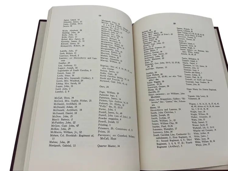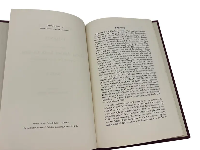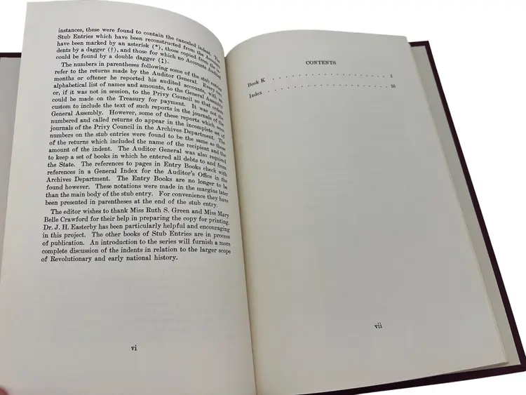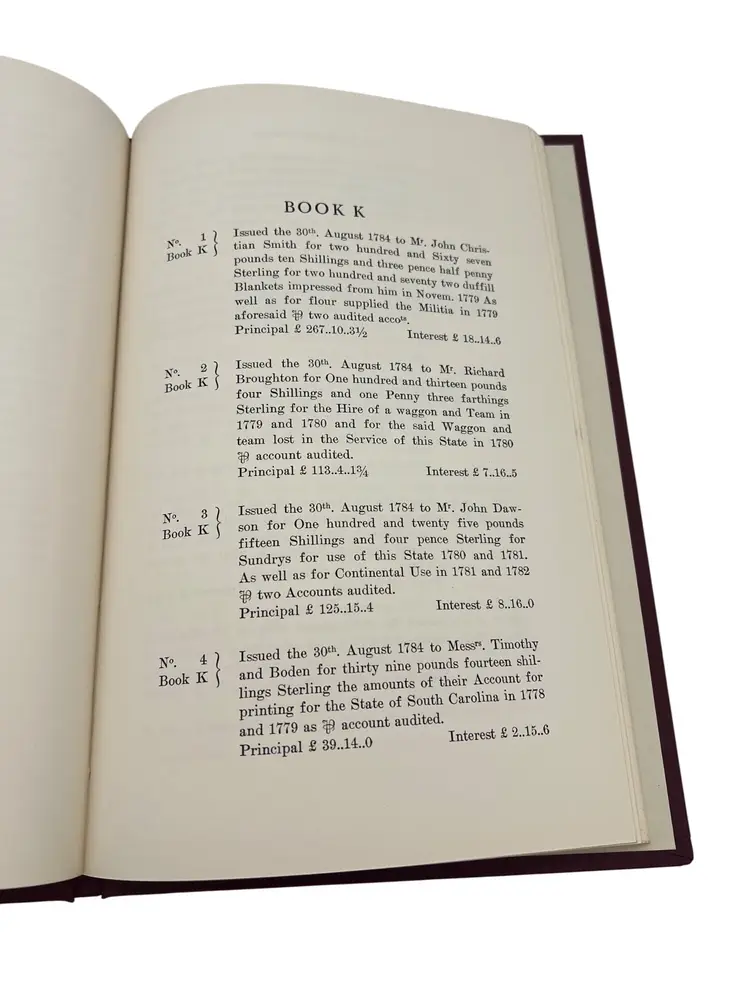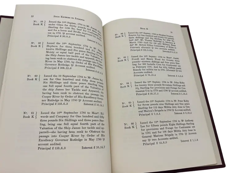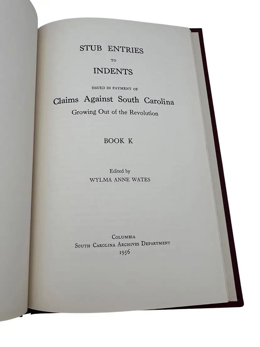 1956 South Carolina Archives Department hardcover reference volume, Stub Entries to Indents, Book K, edited by Wylma Anne Wates. Transcribes treasury “stub” records for indents issued in 1784 to pay Revolutionary War-era claims against the State of South Carolina. Entries give the claimant’s name, brief description of service or supplies, and principal and interest amounts, followed by a detailed index of surnames and subjects at the back. Essential source for South Carolina Revolutionary War history, military research, and genealogy.