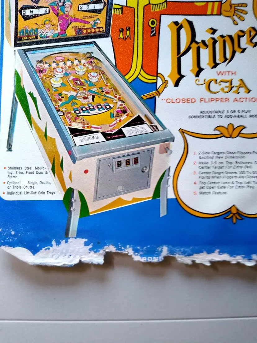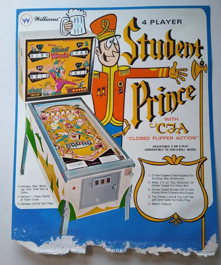 Brand: Williams Modification Description: Water Damaged Year: 1968 Model: Student Prince Theme: Retro Pinball Country/Region of Manufacture: United States Original: Paper Sales Flyer Modified Item: Yes Pinball: Flyer