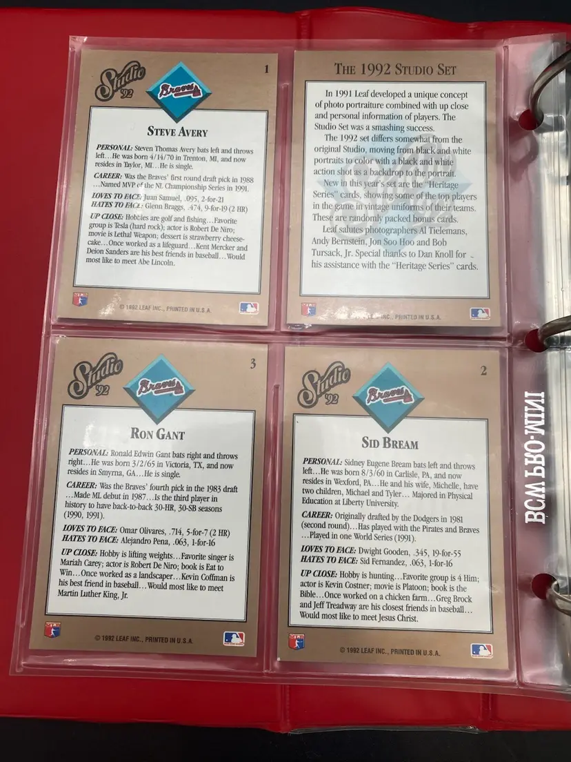You are purchasing the complete MLB 264 Trading Card Set of 1992 Studio by Leaf. This Set is organized in a Baseball Card Album. These Cards are in Excellent to Near Mint Condition.
