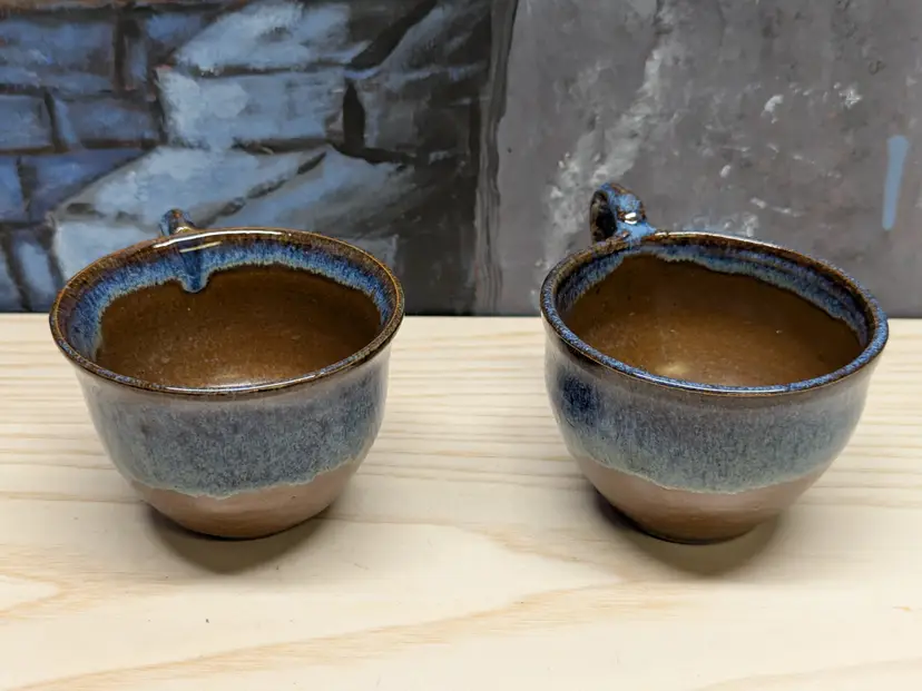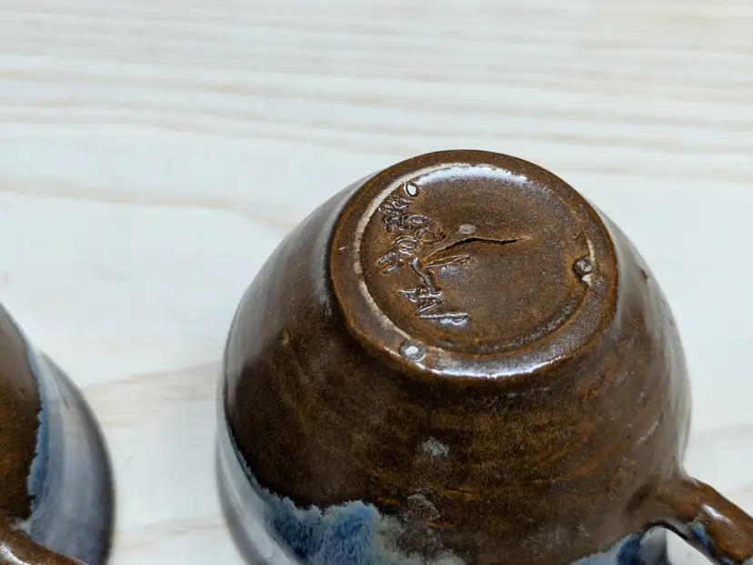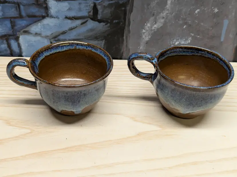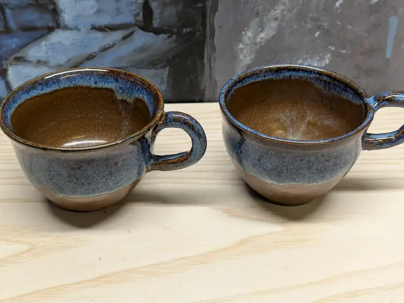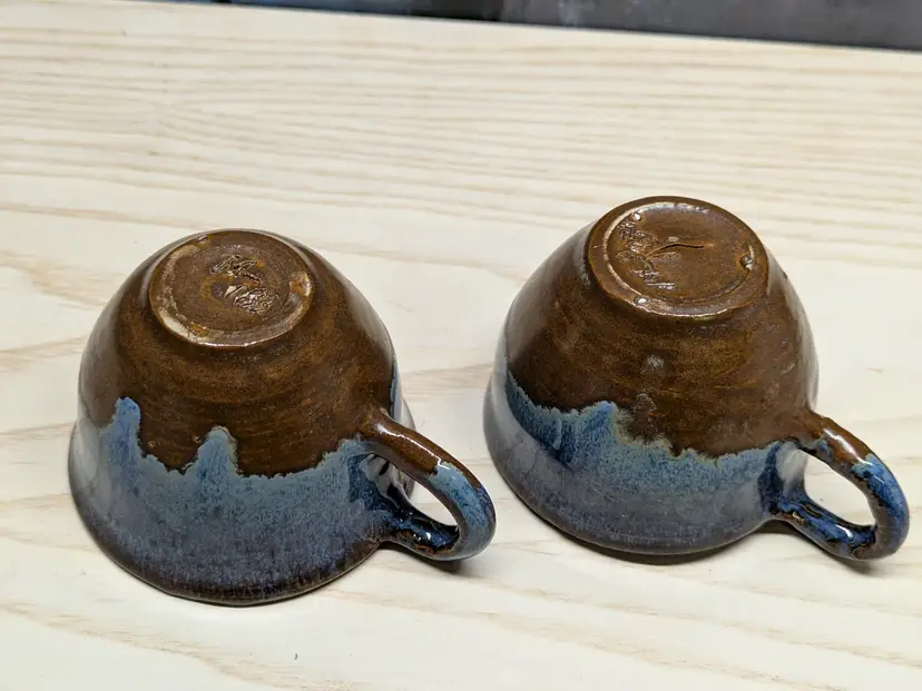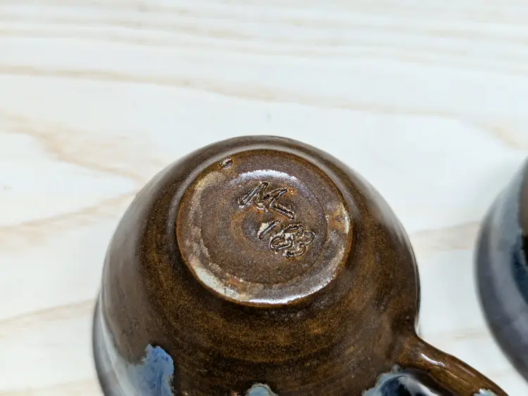 Studio Art Pottery 2 Coffee Mug Tea Cup Signed by Artist Drip Glaze Brown Blue color nice for Boho Natural decor . The cups are made of dark clay , signed ML 83 Very hard to read .The cups measure 2 3/4in tall and 4 3/4 in wide They are very heavy for there size. Great condition Clean with no damage.no chips or cracks no weird smells. Please check the photos for details. Comes from a smoke free home. We do have pets.