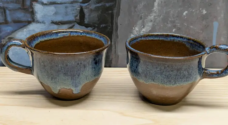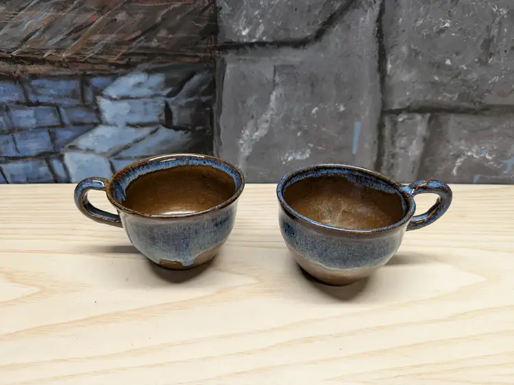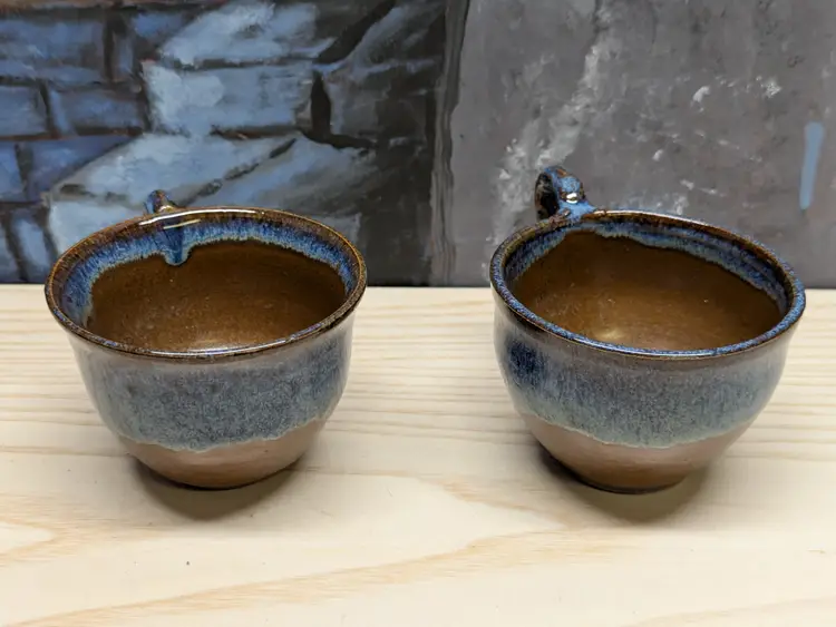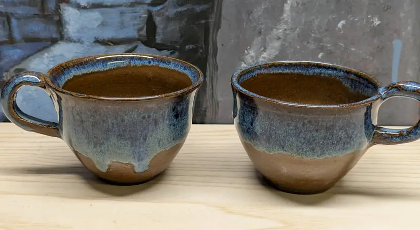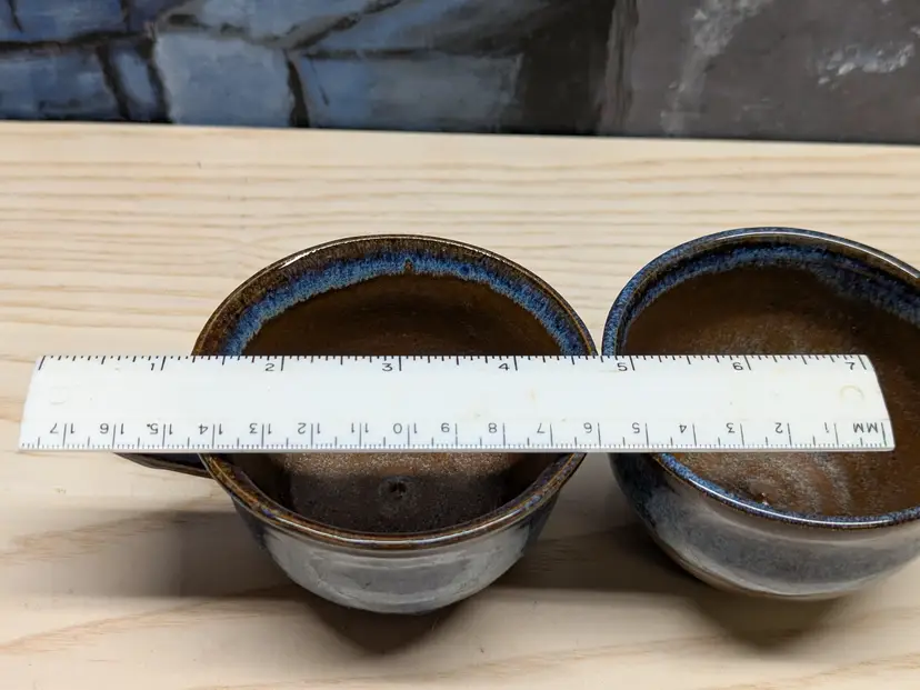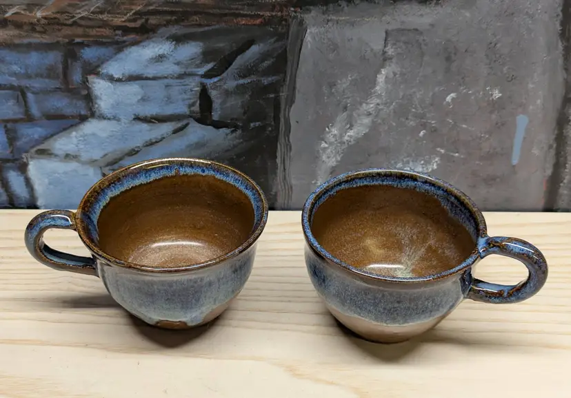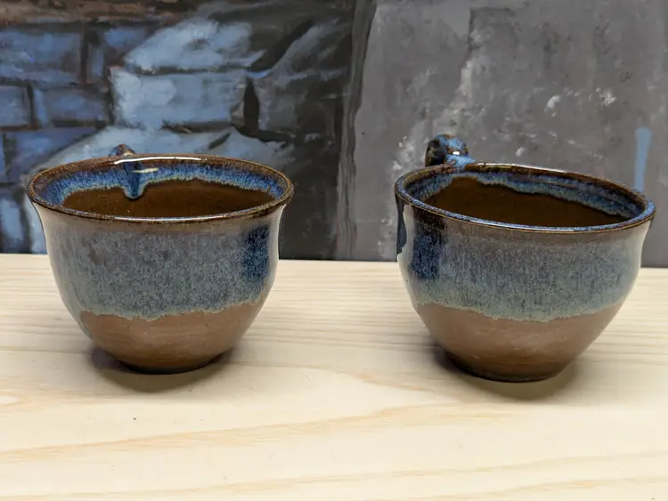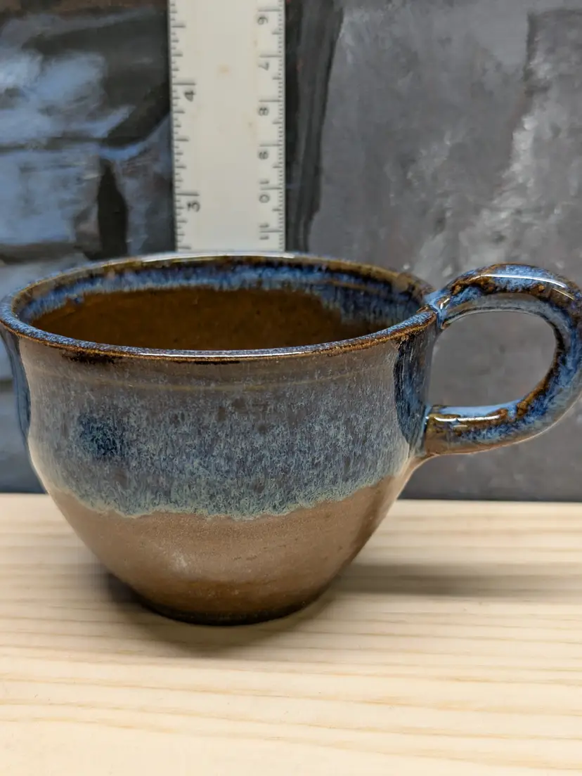 Studio Art Pottery 2 Coffee Mug Tea Cup Signed by Artist Drip Glaze Brown Blue color nice for Boho Natural decor . The cups are made of dark clay , signed ML 83 Very hard to read .The cups measure 2 3/4in tall and 4 3/4 in wide They are very heavy for there size. Great condition Clean with no damage.no chips or cracks no weird smells. Please check the photos for details. Comes from a smoke free home. We do have pets.