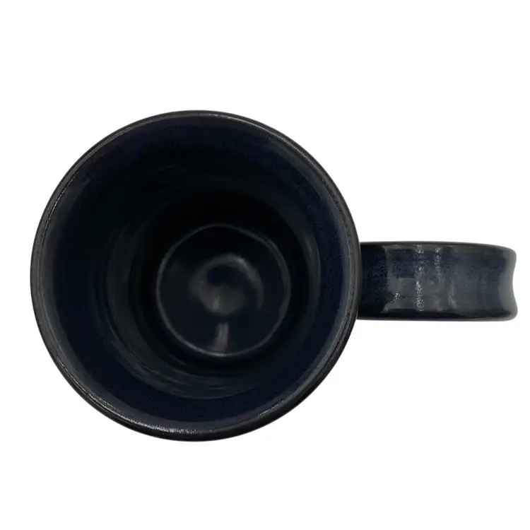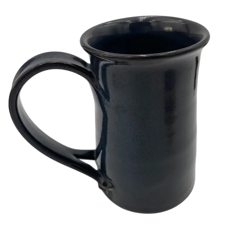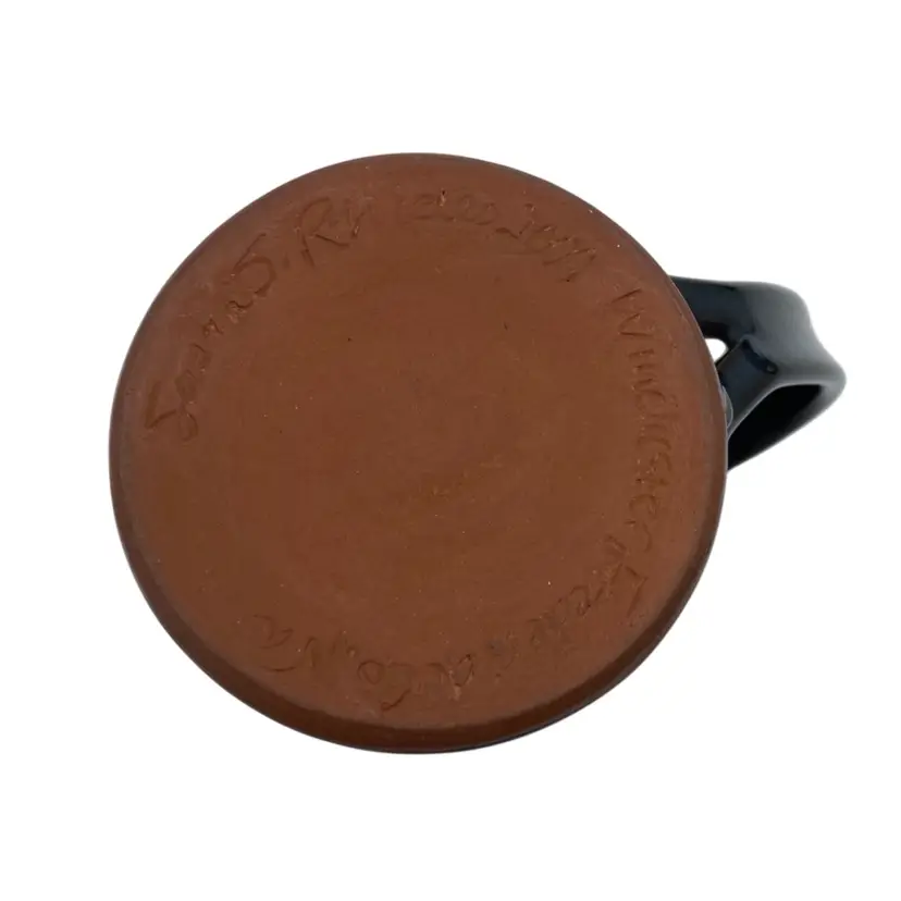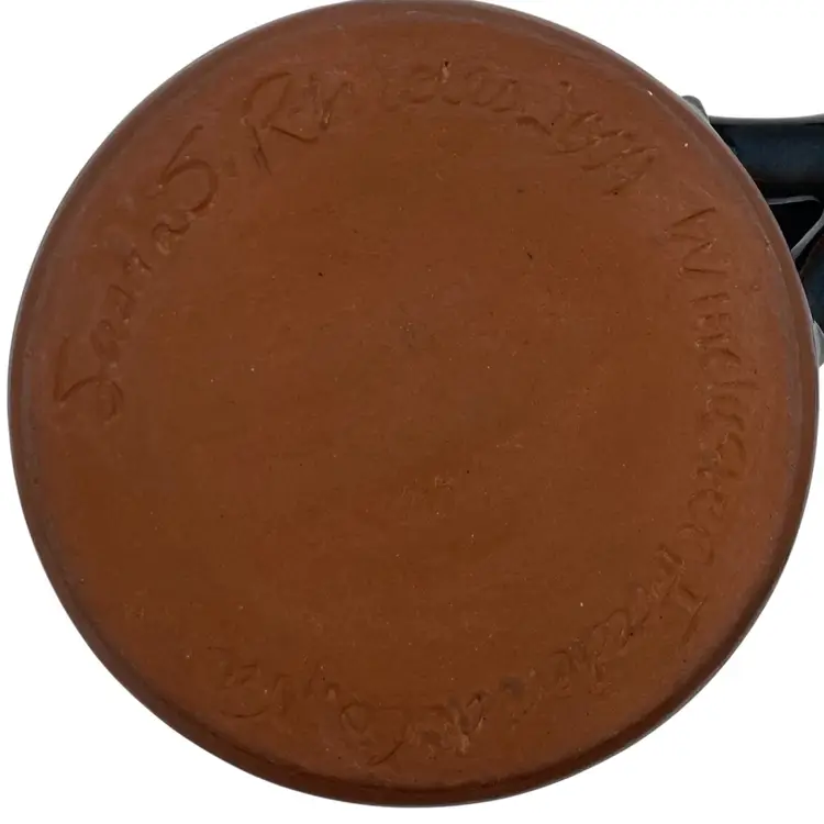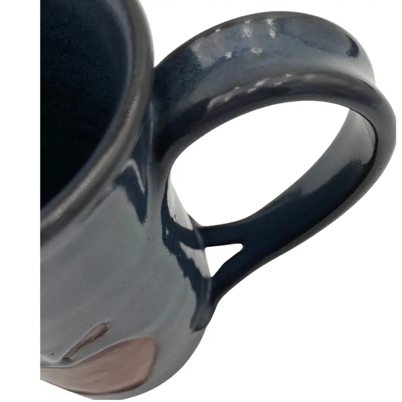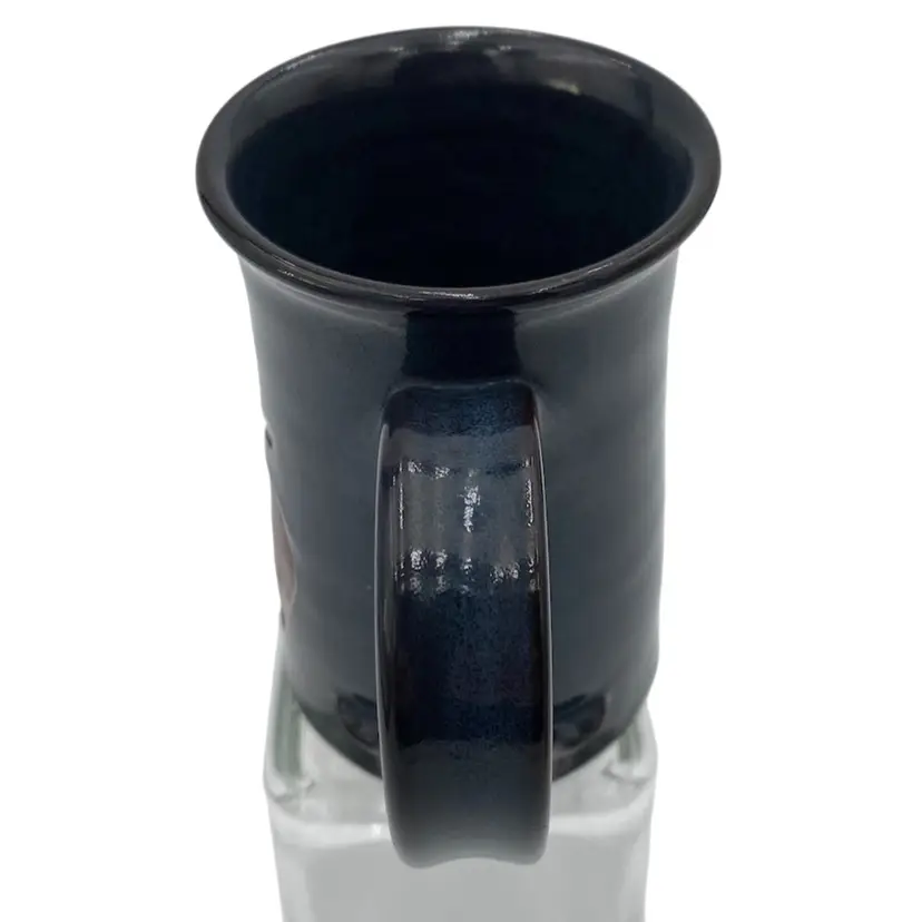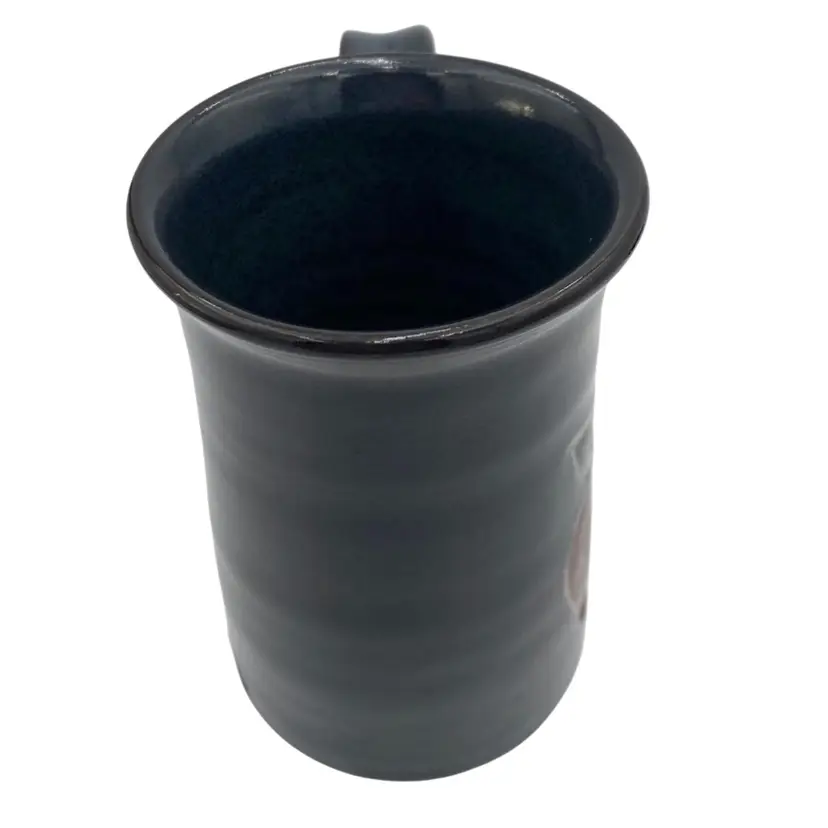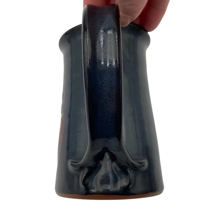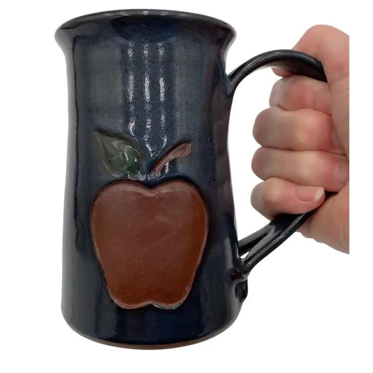 This beautiful Studio Art Pottery Apple Mug is a great gift or addition to a collection of handmade pottery. The mug features a deep blue/teal glaze and a large apple incised on it, colored with rust red and green. The handle is large for easy gripping and has an interesting split decorative lower portion where it attaches to the cup. It has a 3.2 inch diameter and stands at 4.8 inches tall, with a weight of 13.9 ounces. The mug is signed and dated 2009 by the artist, Susan S. Rhides, and was created in Winchester, Virginia.
