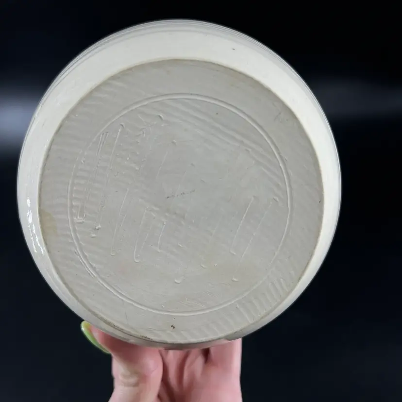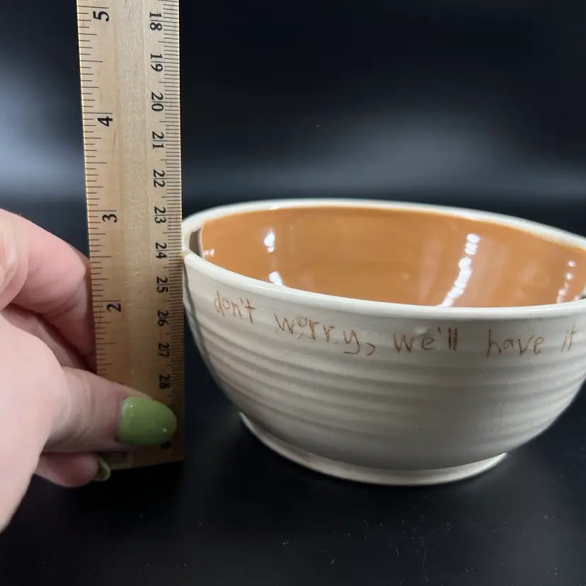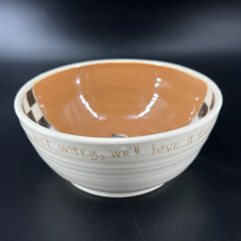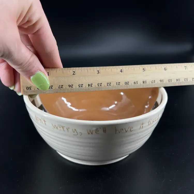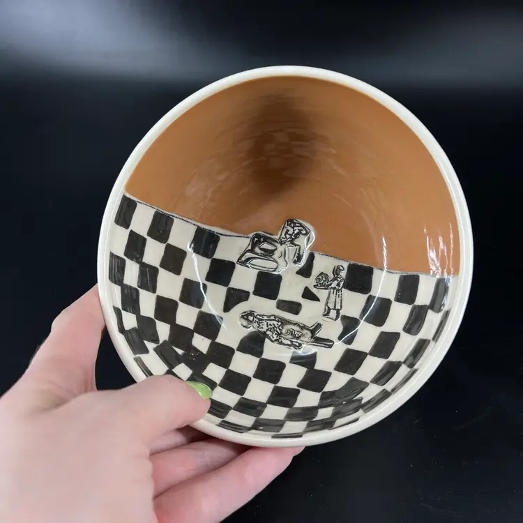 The bowl is checkered with a marking on the bottom. It measures approx 6” wide. There are no chips or cracks.