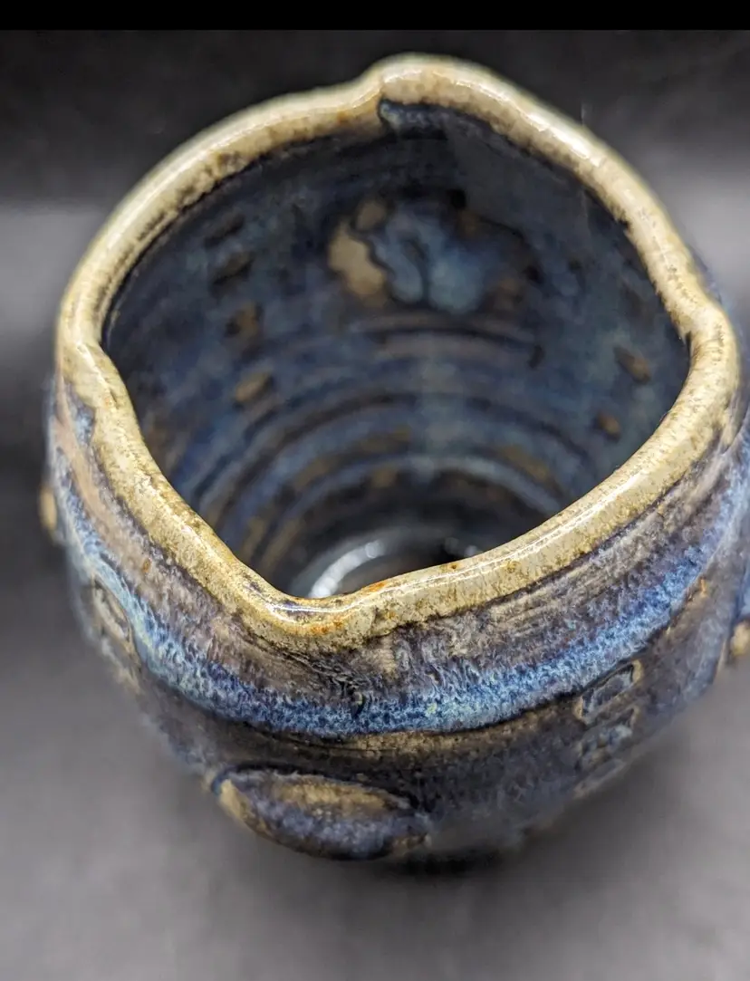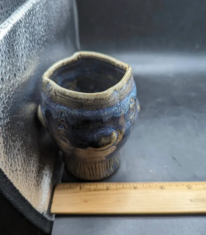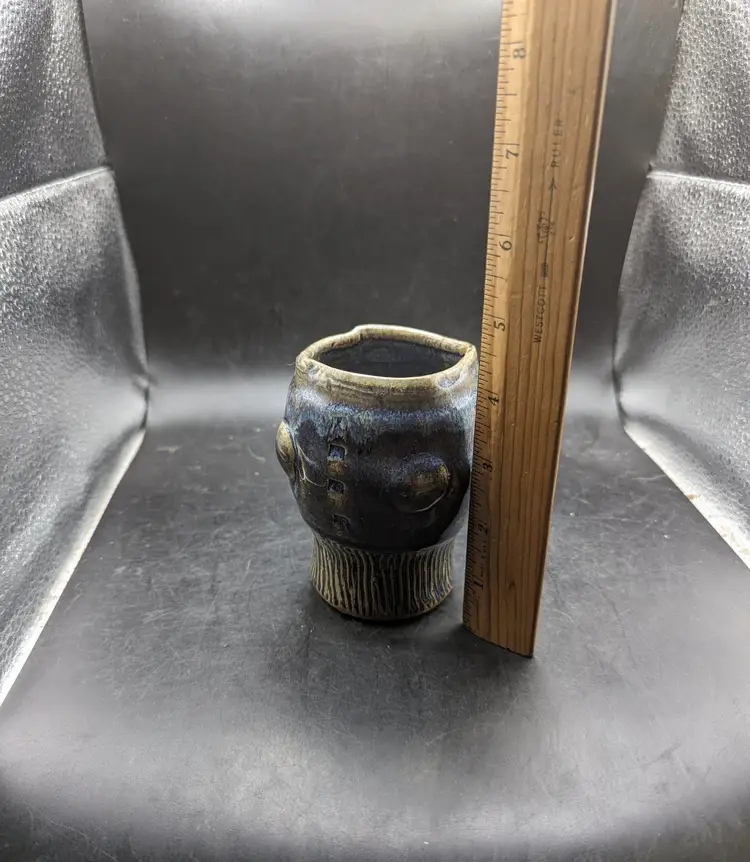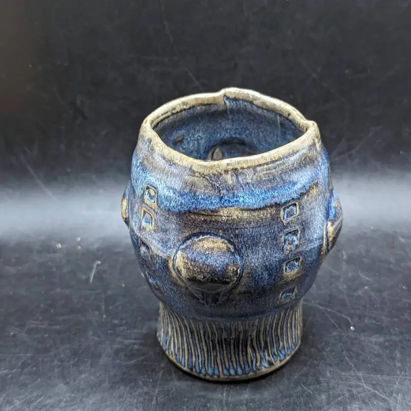 This is a lovely Studio Art Pottery Brutalist Small Pot Vase Unidentified Mark. It is done in blue, purple and tan glazes. No chips or cracks. Please see all pictures for condition and measurements.