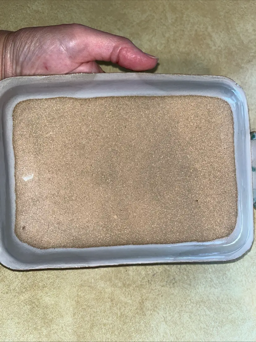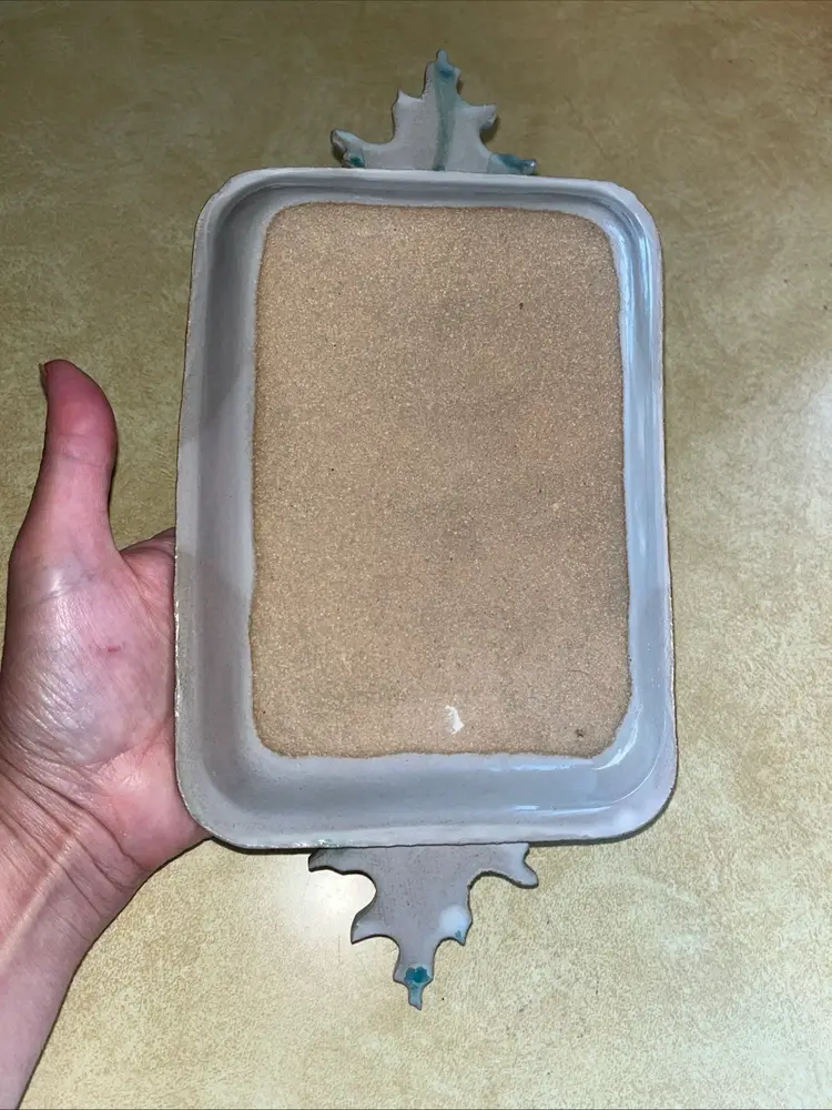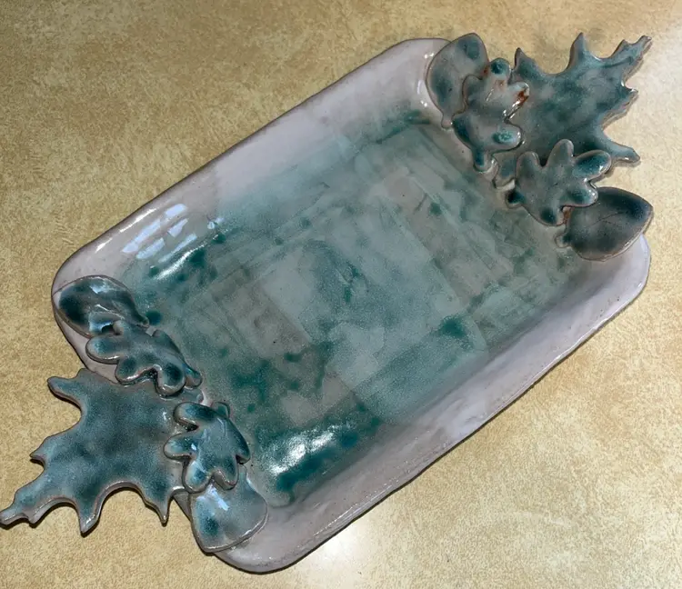 Handmade, studio art pottery, light gray and teal, cheese and cracker/appetizer dish with applied leaves on both ends which serve as handles. No signature, stamp or marking. Full length is approximately 11.25". Could also be used as a catch all or trinket dish. Pre-owned and gently used. Expect normal wear. See photos and ask any questions prior to purchase. Thank you for your interest in this item. I try my best to accurately describe each item that I list for sale including any known defects. All items are sold AS IS. What you see in the photos is exactly what you get, nothing more, nothing less. If an item is not specifically listed as new then it is in pre-owned, used condition and wear should be expected. I do not accept returns so please take your time to review the item description, condition description and photos.