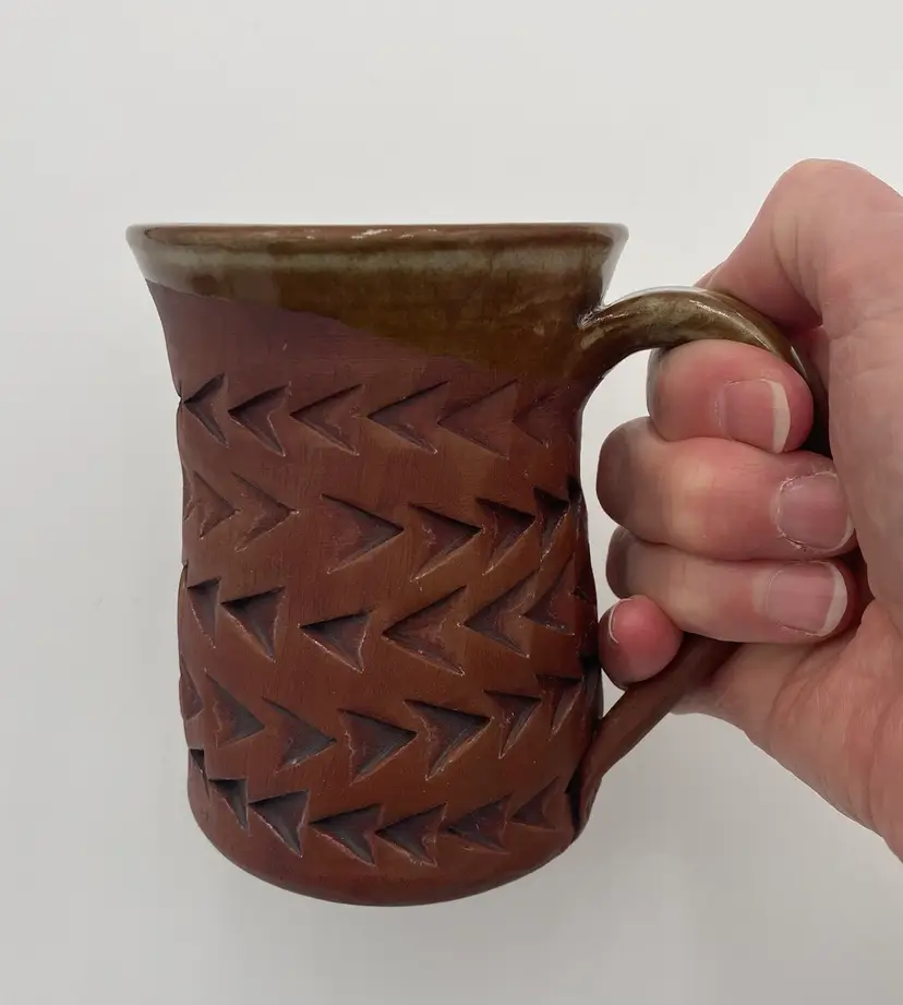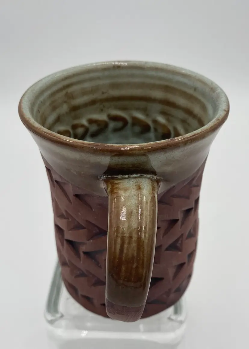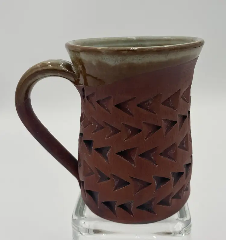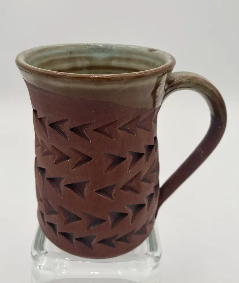 Crafted with an eye for tradition and a touch of modern artistry, this studio art pottery mug is a unique addition to any collection or daily routine. The mug is made of rich red clay, complemented by imprinted arrow patterns that lend a contemporary design aspect to the piece. Its light mint green Majolica glaze, stretching from the outer rim through the interior and top of the handle, adds a playful pop of color and made the cup watertight. With a comfortable 12-ounce capacity and measurements of 4.3 inches in height and 3.25 inches in diameter, this mug is designed for both hot and cold beverages. The hand-shaped and attached handle, complete with a distinctive mark, ensures a secure grip. This original piece embodies the spirit of the artisan pottery.
